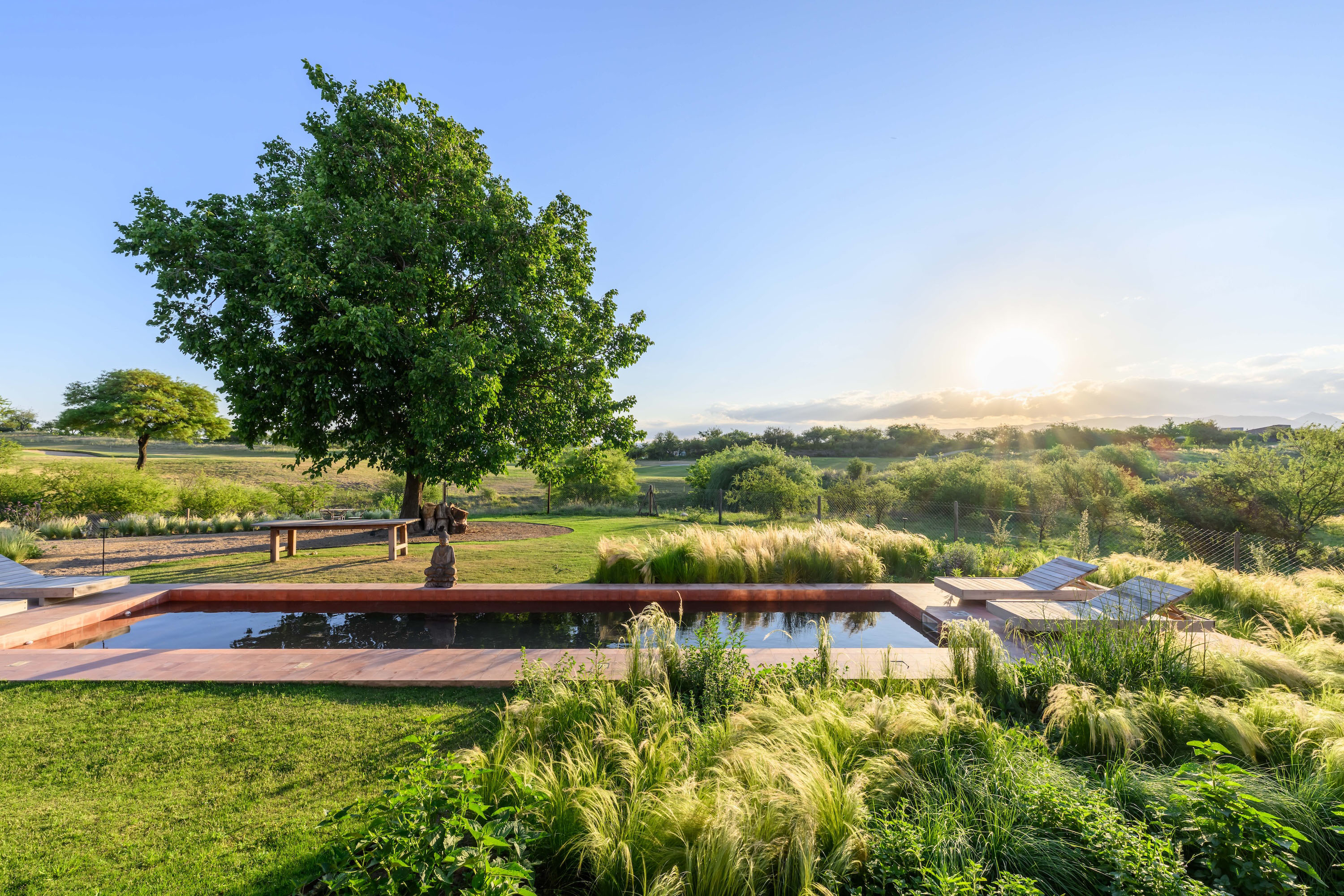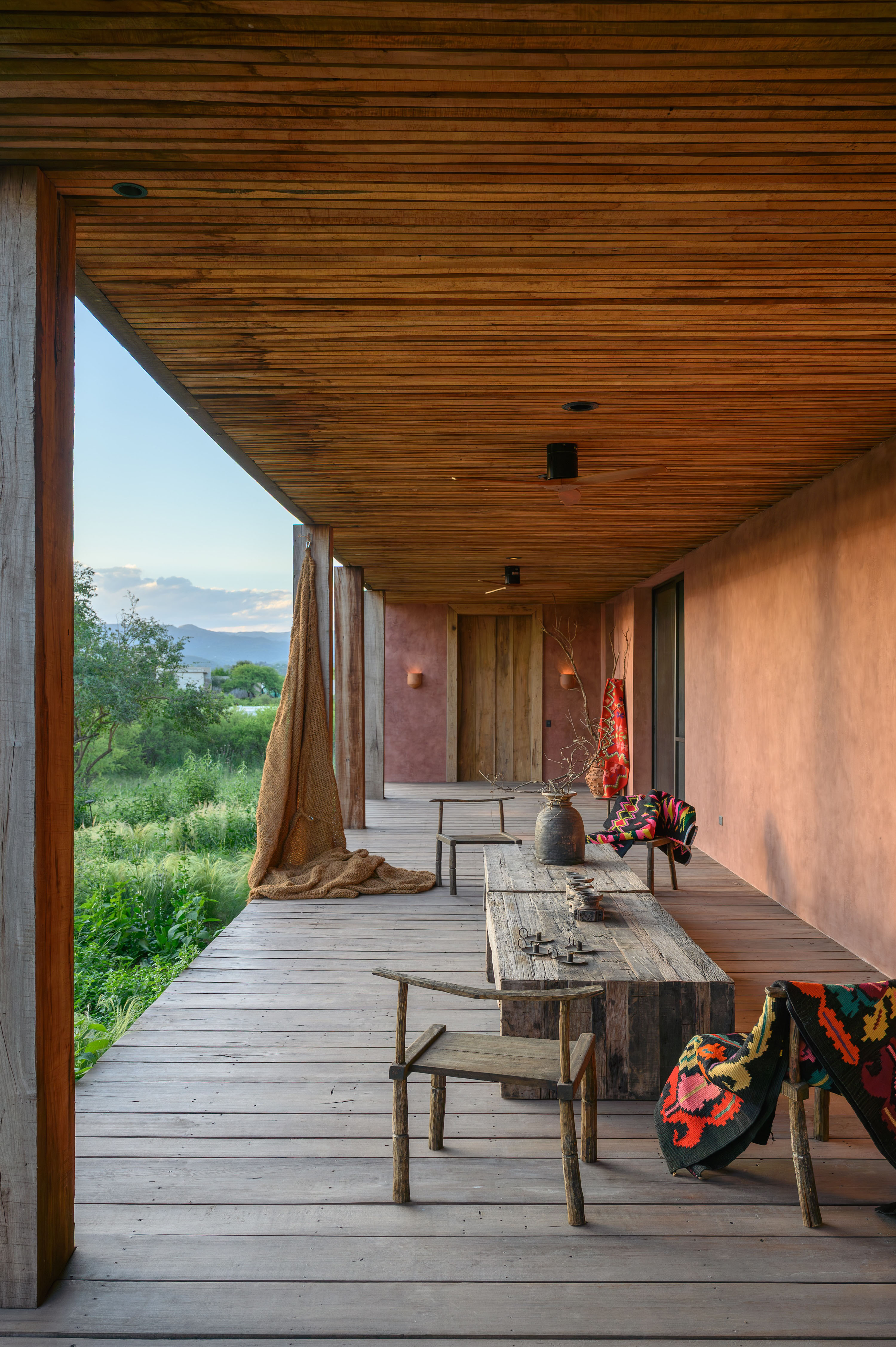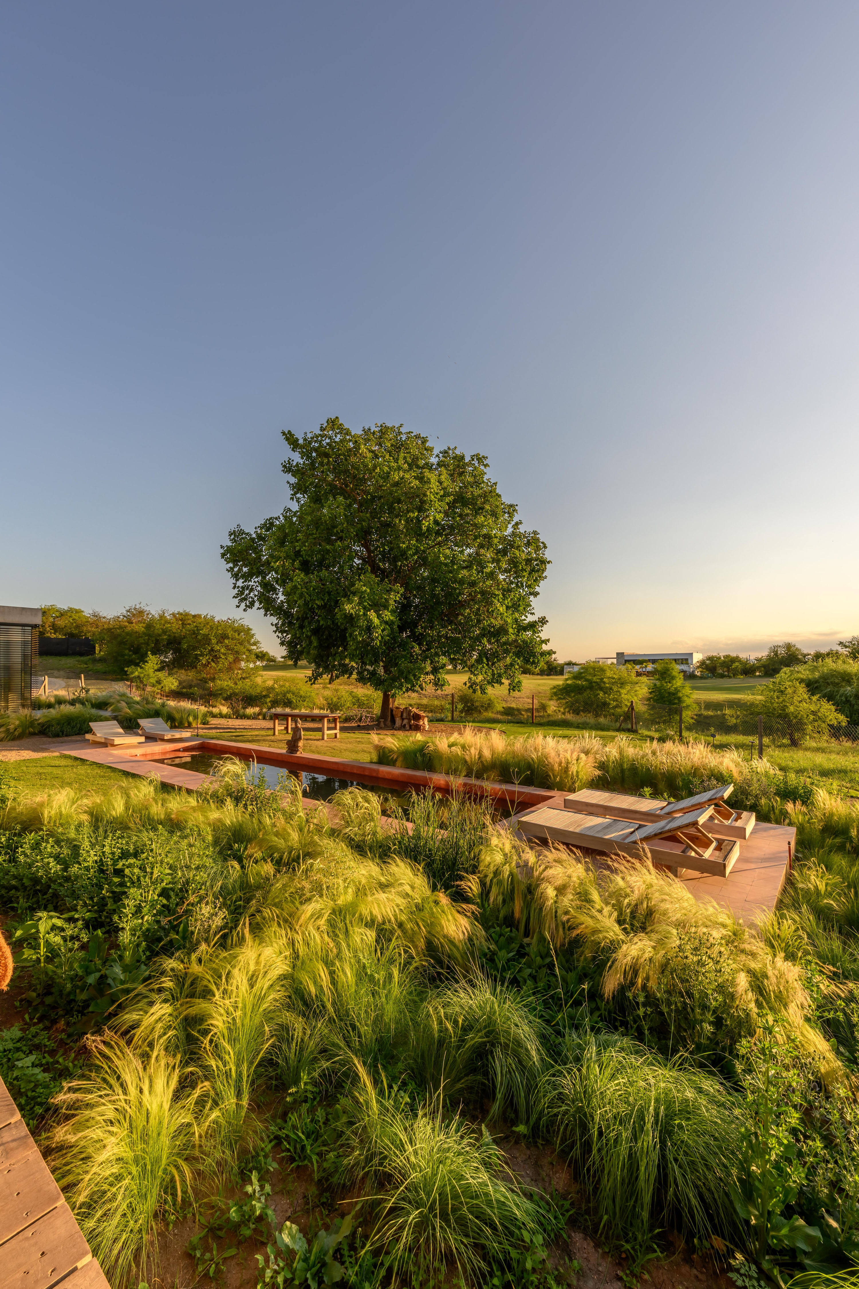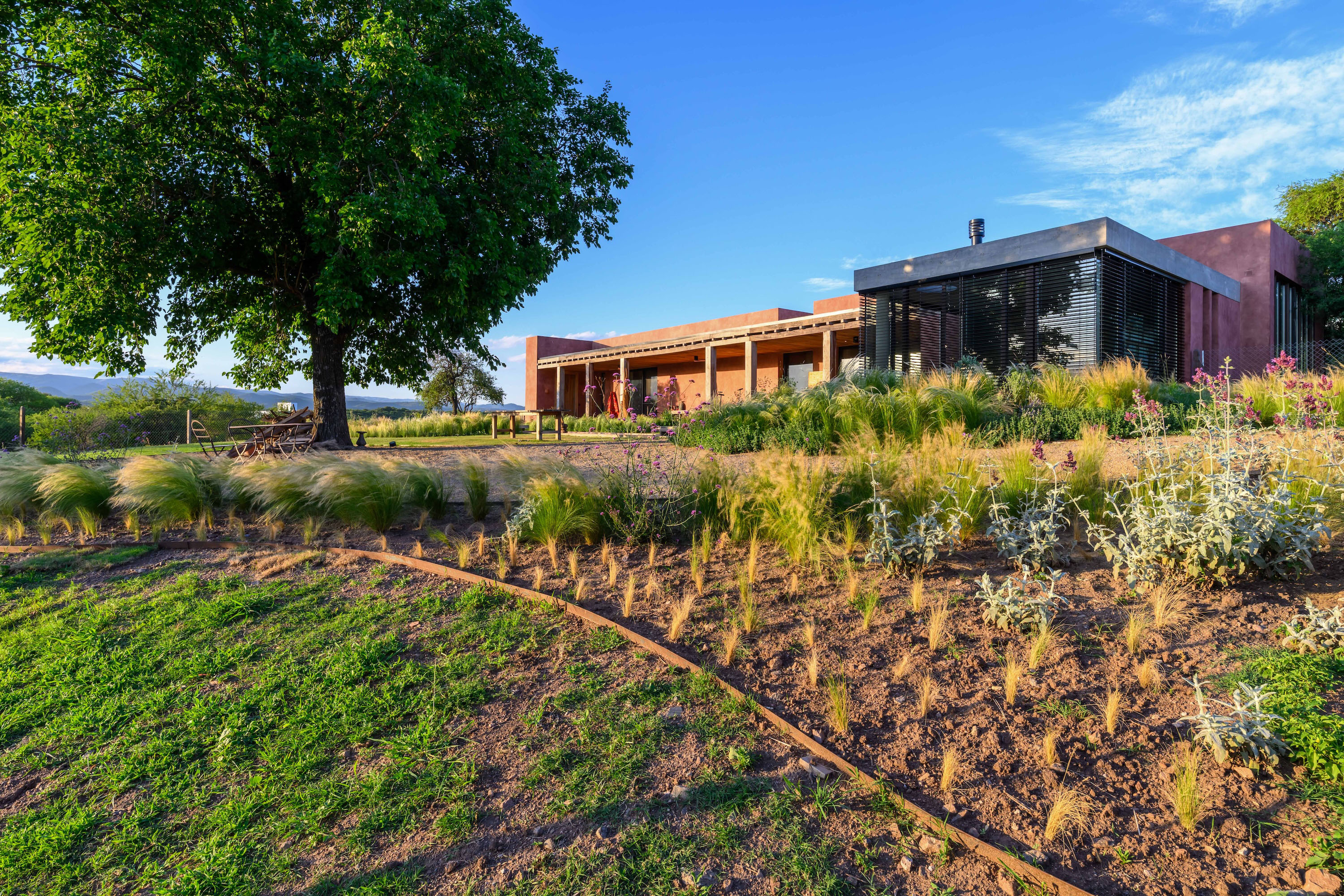 Landscape design is treated as an essential architectural component rather than a decorative afterthought. The garden is composed of native species such as grasses, herbaceous plants and local shrubs, arranged loosely with a strong naturalistic intention. This planting strategy reinforces the existing topography and extends the surrounding serrano landscape into the site. By softening the edges of the built volumes and reducing visual boundaries, the landscape allows the architecture to dissolve gently into its context, strengthening its territorial presence while supporting ecological balance.