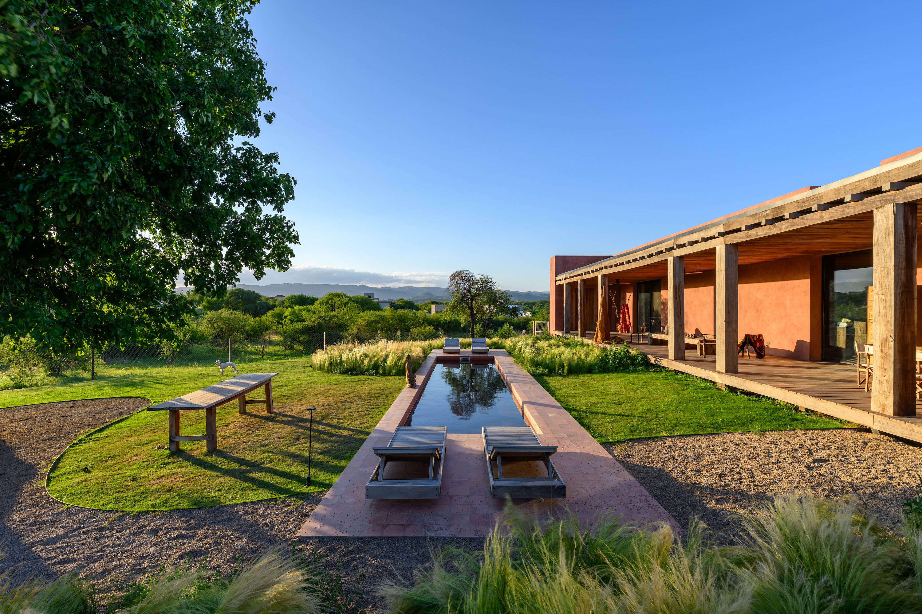 A linear swimming pool is positioned in direct relationship with the gallery, operating as a horizontal mirrored plane that extends the geometry of the house into the landscape. Its reflective surface captures sky, vegetation and architecture, amplifying the sense of calm and spatial continuity. Rather than acting as a focal object, the pool reinforces the project’s linear logic, becoming another layer through which architecture, nature and light interact in a restrained and elegant manner.