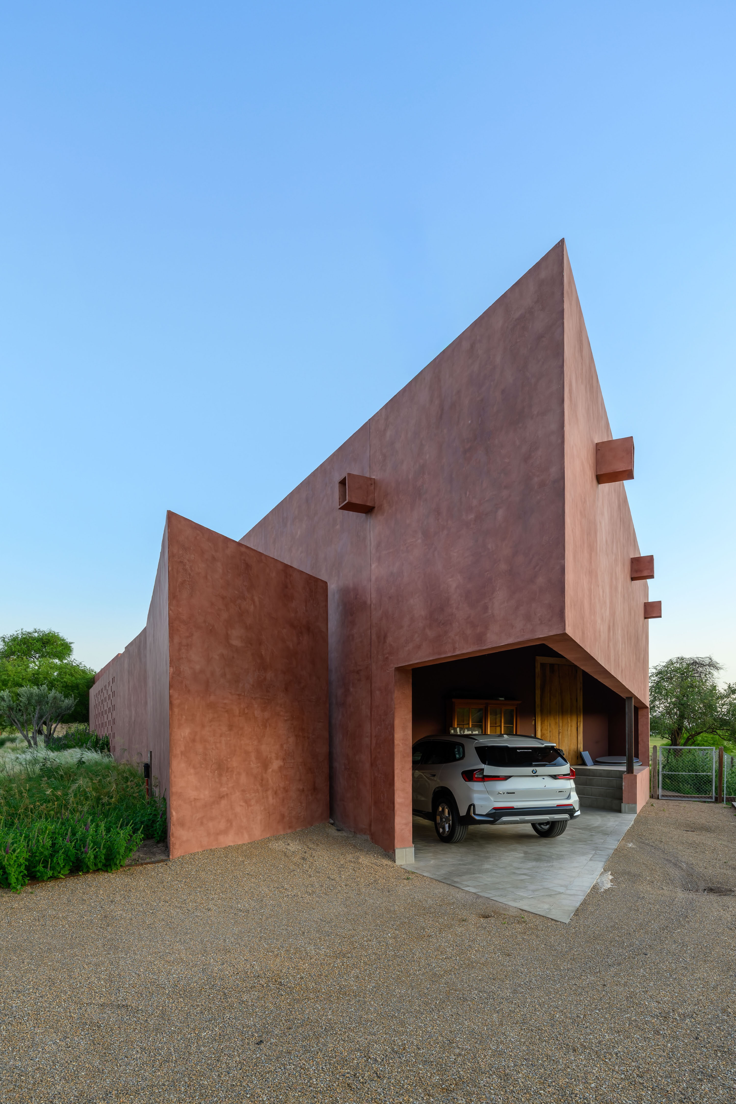 The private areas of the house are carefully arranged within the right wing of the main volume, where bedrooms are buffered from social spaces by a linear corridor and the thermal mass of the walls. Openings in this sector are deliberately restrained, using controlled apertures to ensure privacy while maintaining climatic comfort. This measured approach reflects a thoughtful understanding of environmental performance, where architecture relies on mass, orientation and proportion rather than excess technology to achieve stability and comfort throughout the seasons.
