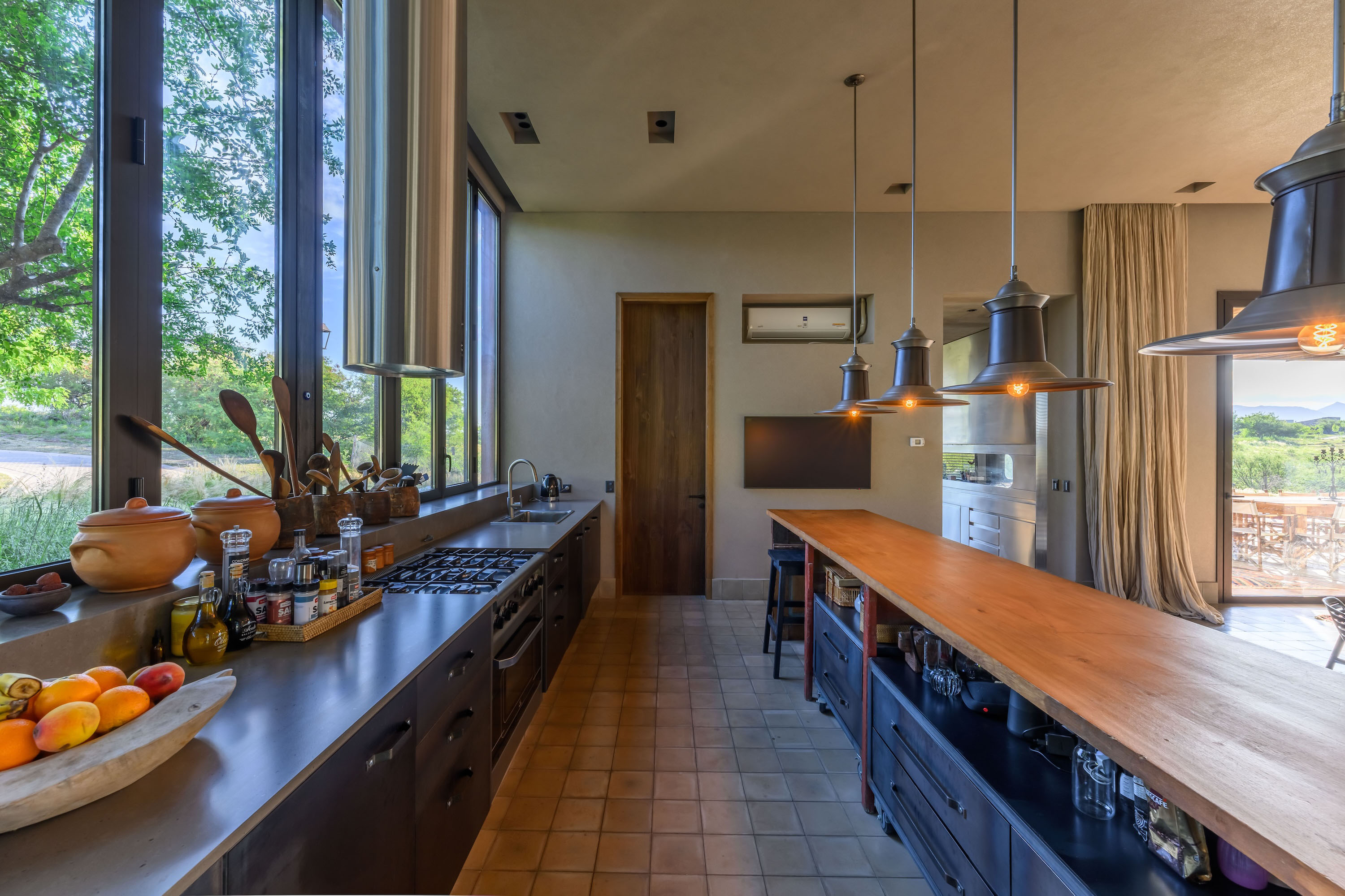 The social life of Casa BP is organized around an integrated core that brings together living room, dining area and kitchen into a single continuous space. Conceived as flexible and fluid, this central zone encourages interaction and adaptability, allowing daily life to unfold without rigid boundaries. Directly connected to this interior space is a longitudinal gallery that runs parallel to the main volume. Oriented toward the landscape, the gallery extends the social realm outward, transforming the exterior into a natural continuation of domestic life and blurring the line between inside and outside.