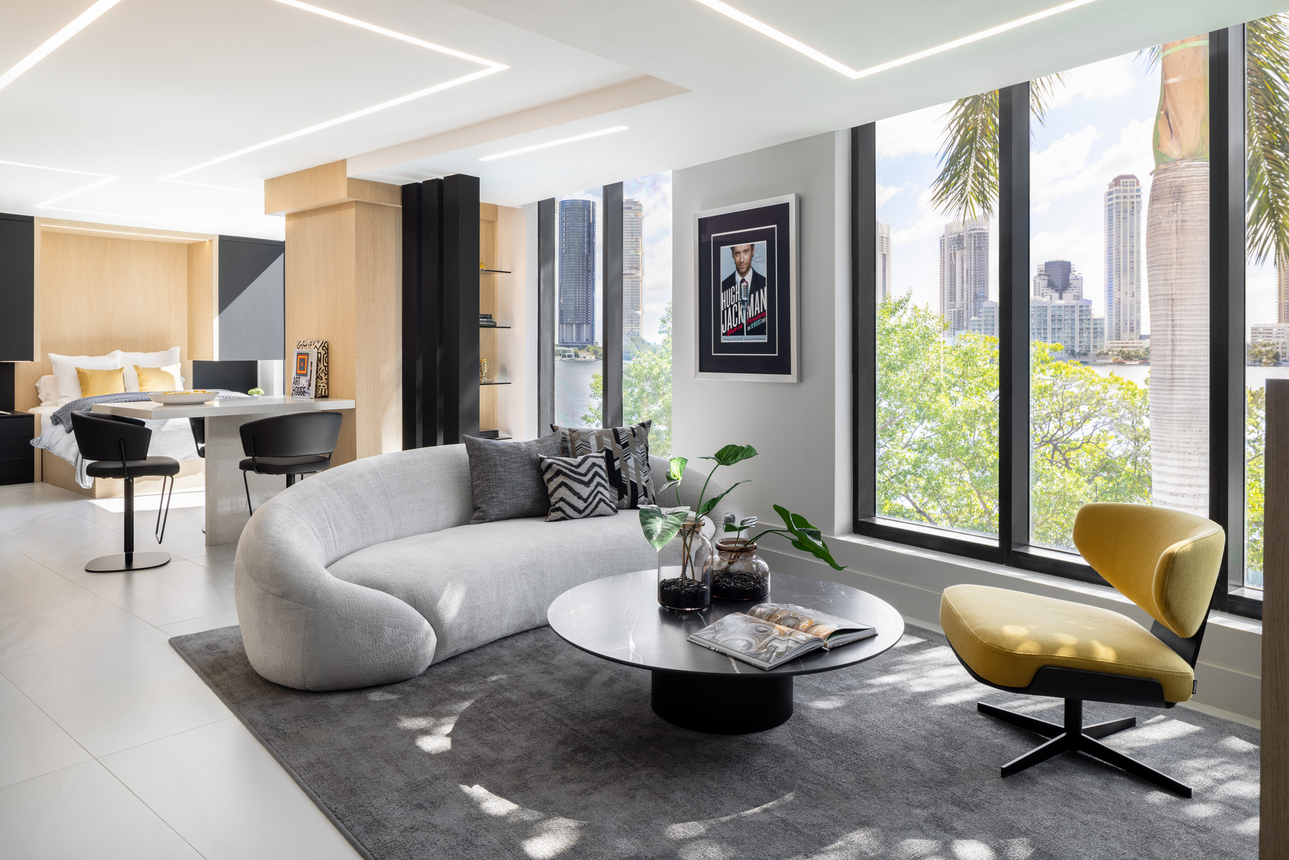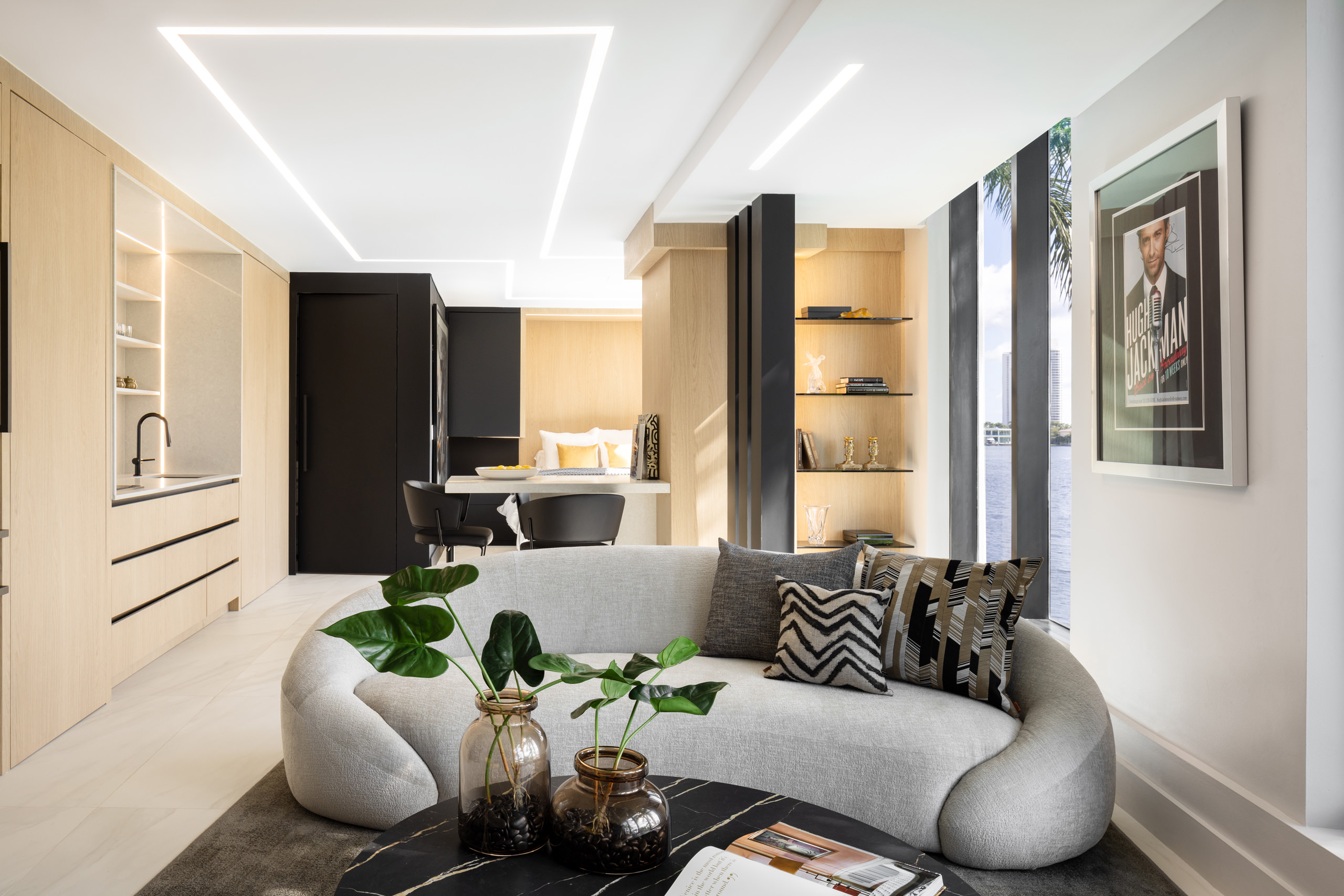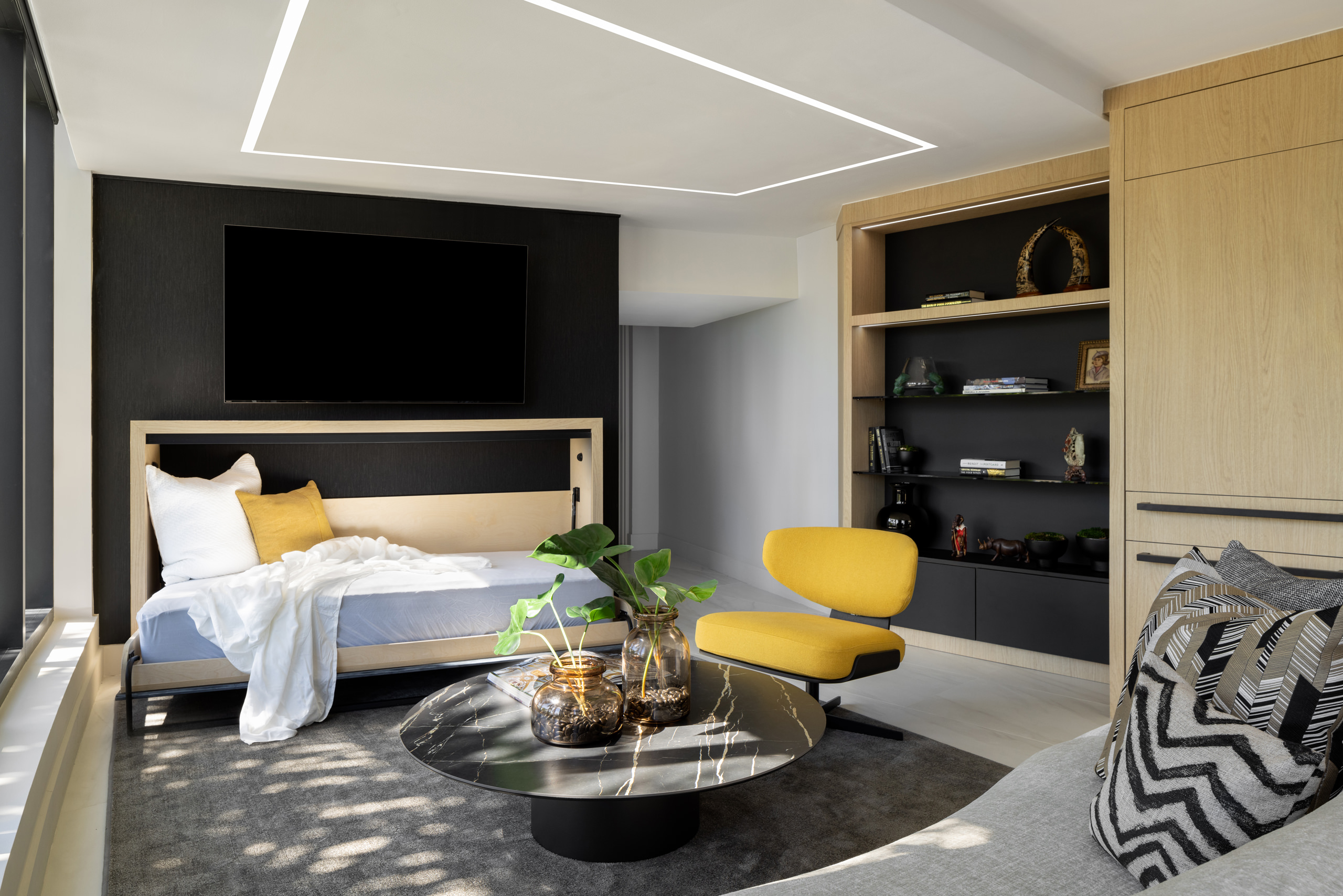 The spatial organization rejects traditional partitions in favor of a fluid, open plan defined by soft zoning. Variations in materiality, lighting, and built-in elements subtly delineate each area, allowing the space to shift seamlessly between uses. Vertical black volumes act as anchors within this composition, organizing circulation and program while reinforcing a strong visual rhythm. The result is an environment that feels expansive despite its size, where boundaries are suggested rather than imposed. Central to this adaptability is the integration of a Murphy bed, discreetly concealed within a matte black panel beneath the television. This gesture transforms the living room into an additional sleeping area when needed, embodying the project’s commitment to real-time transformation. When closed, the bed disappears entirely, reinforcing a design language that prioritizes invisibility and clarity. It is a precise response to the challenge of maximizing every square foot without compromising comfort or aesthetics.