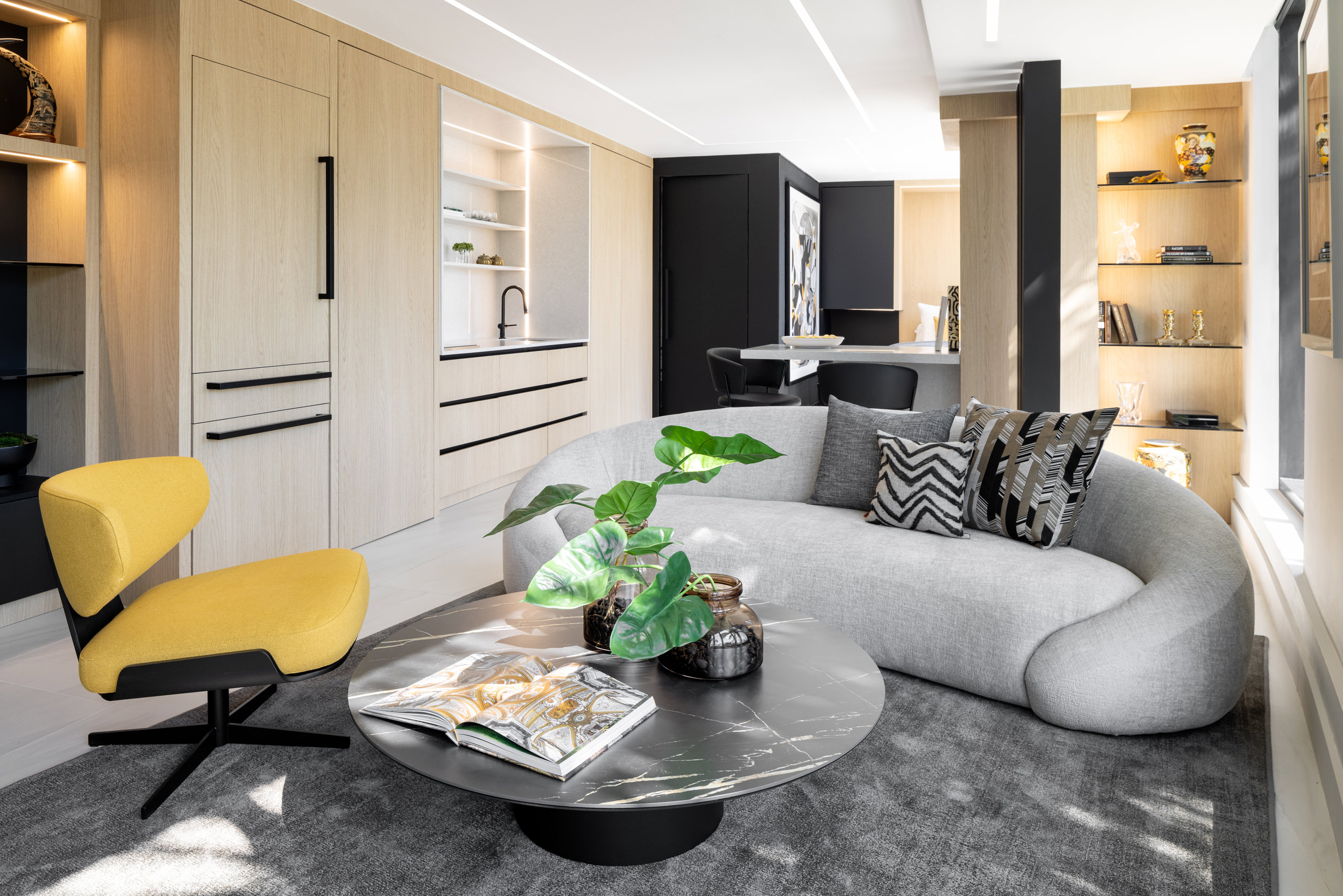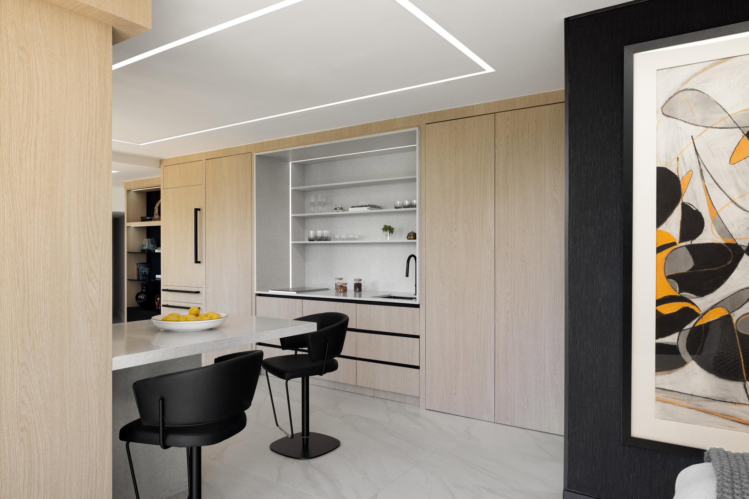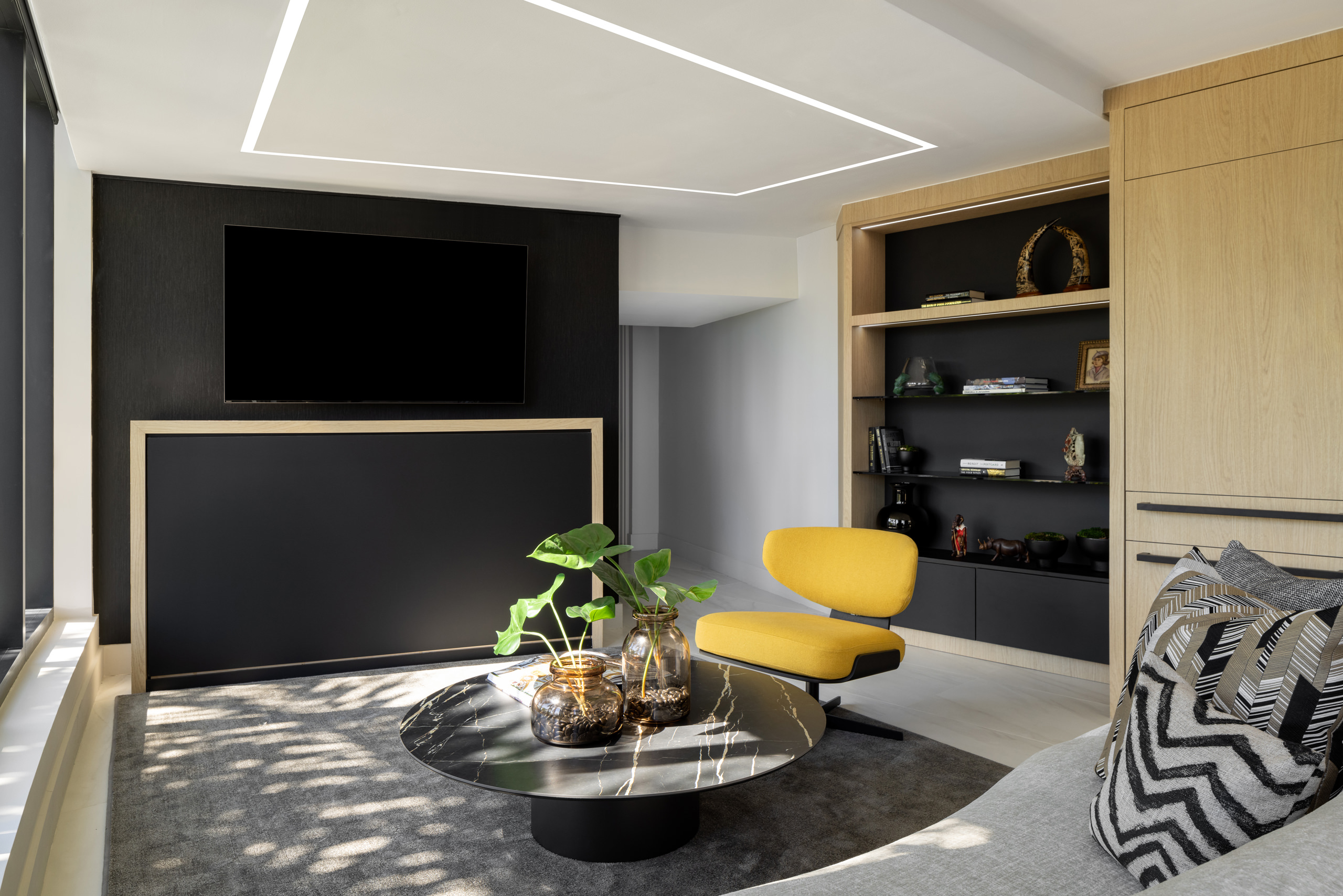 Materiality is intentionally restrained, allowing the architecture to speak with clarity and cohesion. Rift-cut white oak millwork extends across walls and built-in furniture, creating warmth and a sense of continuity. This is contrasted by matte black elements that introduce depth, structure, and hierarchy. Light stone surfaces further balance the palette, contributing to an atmosphere that is both refined and inviting. A carefully placed mustard-yellow accent injects energy, offering a subtle yet impactful visual counterpoint.