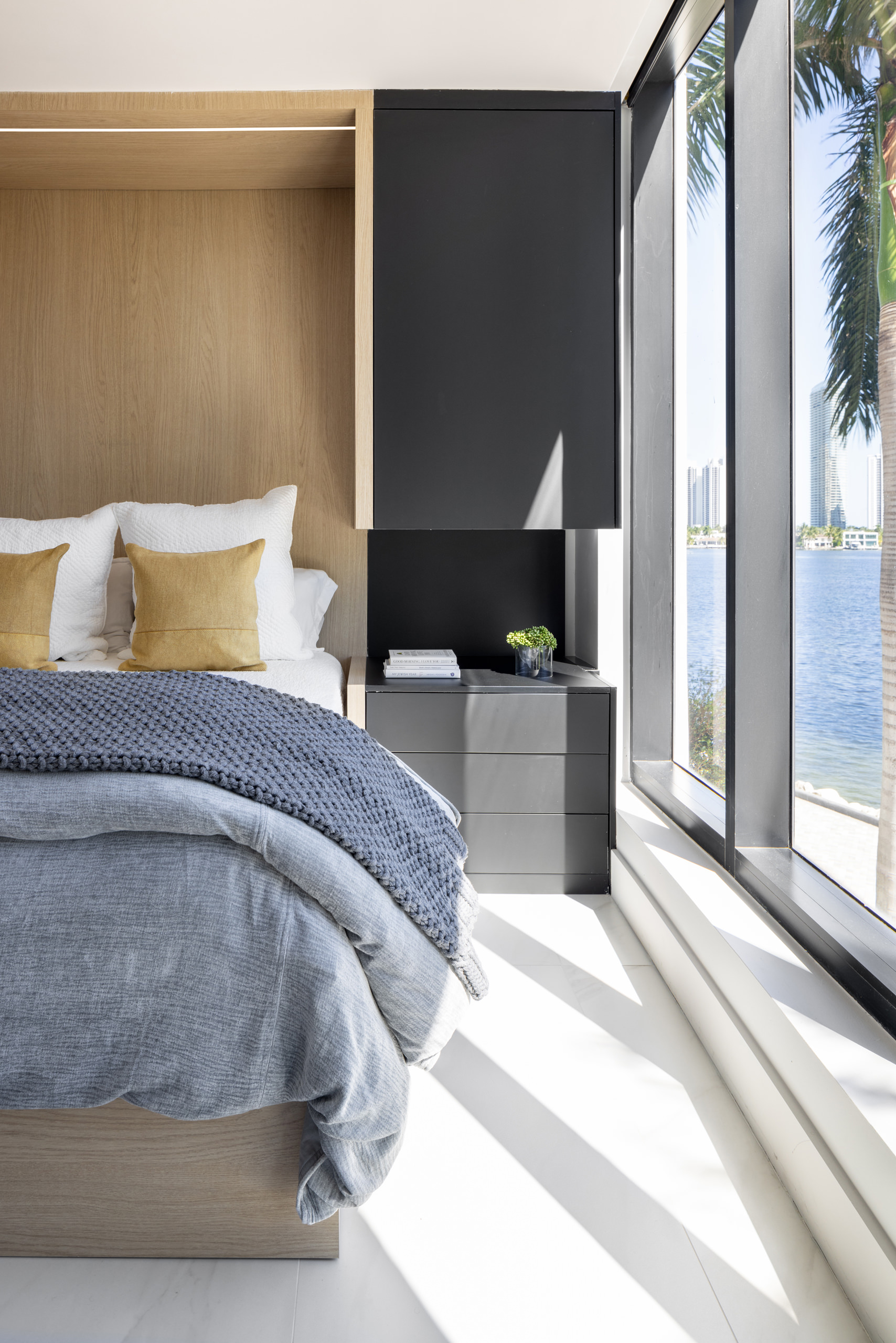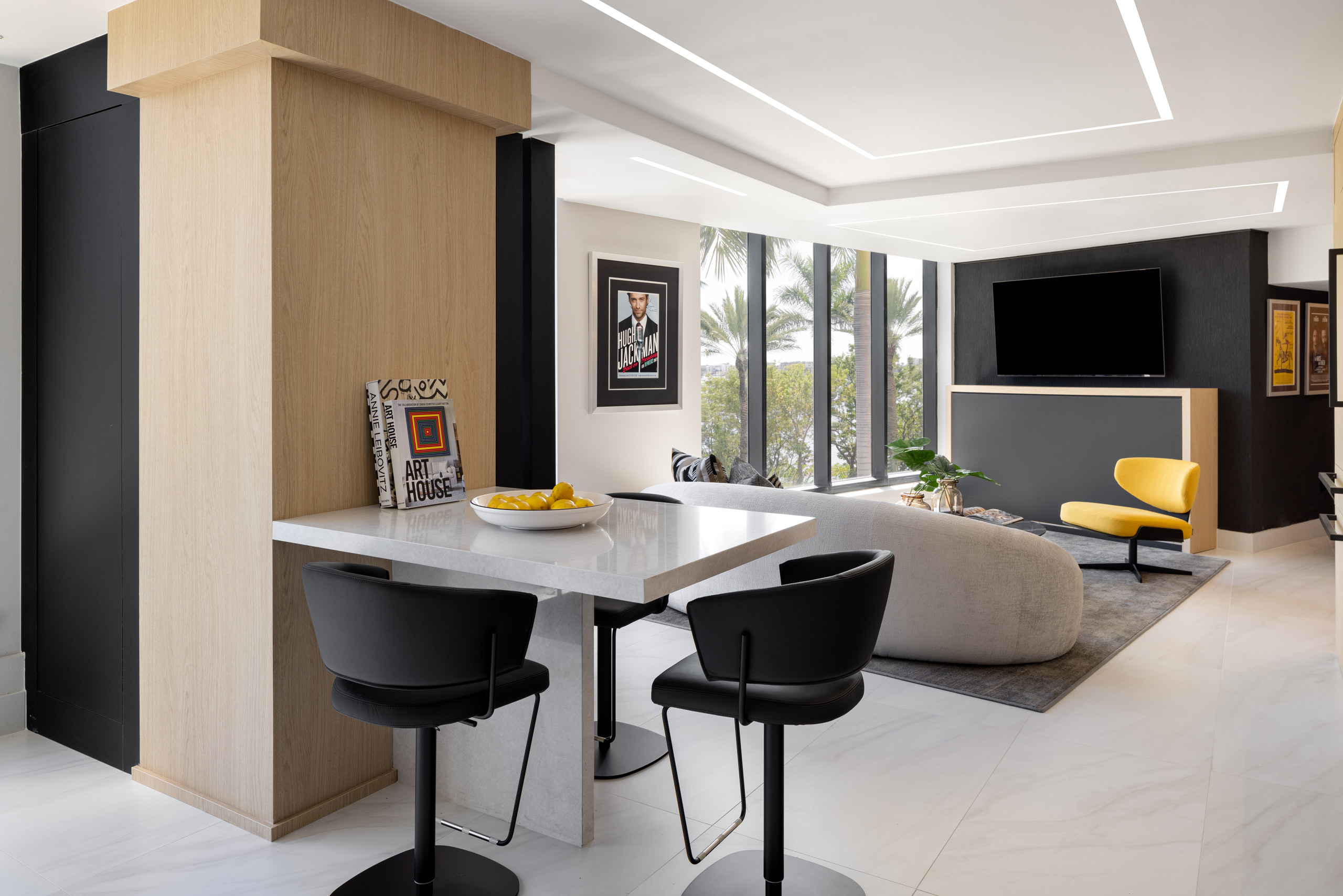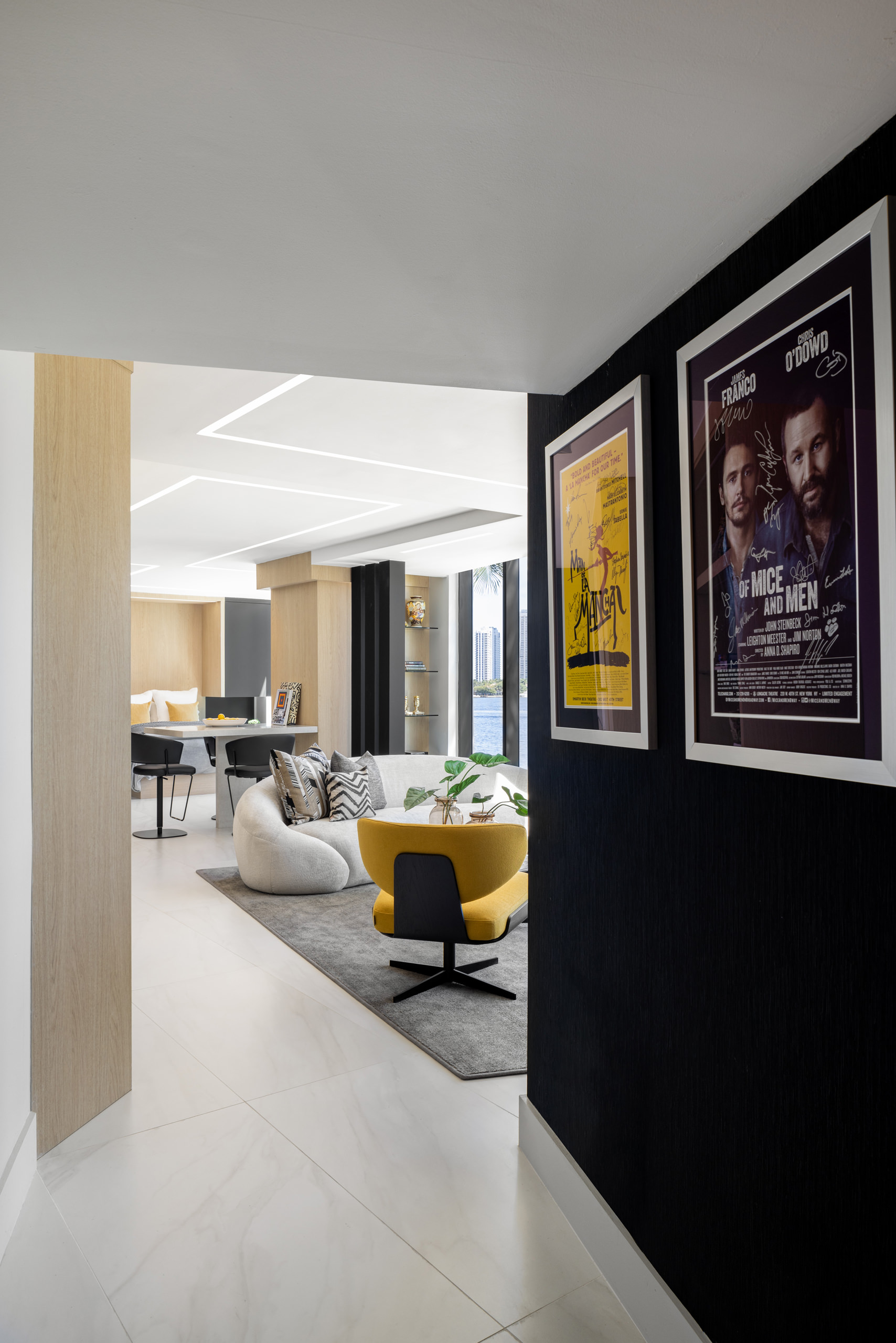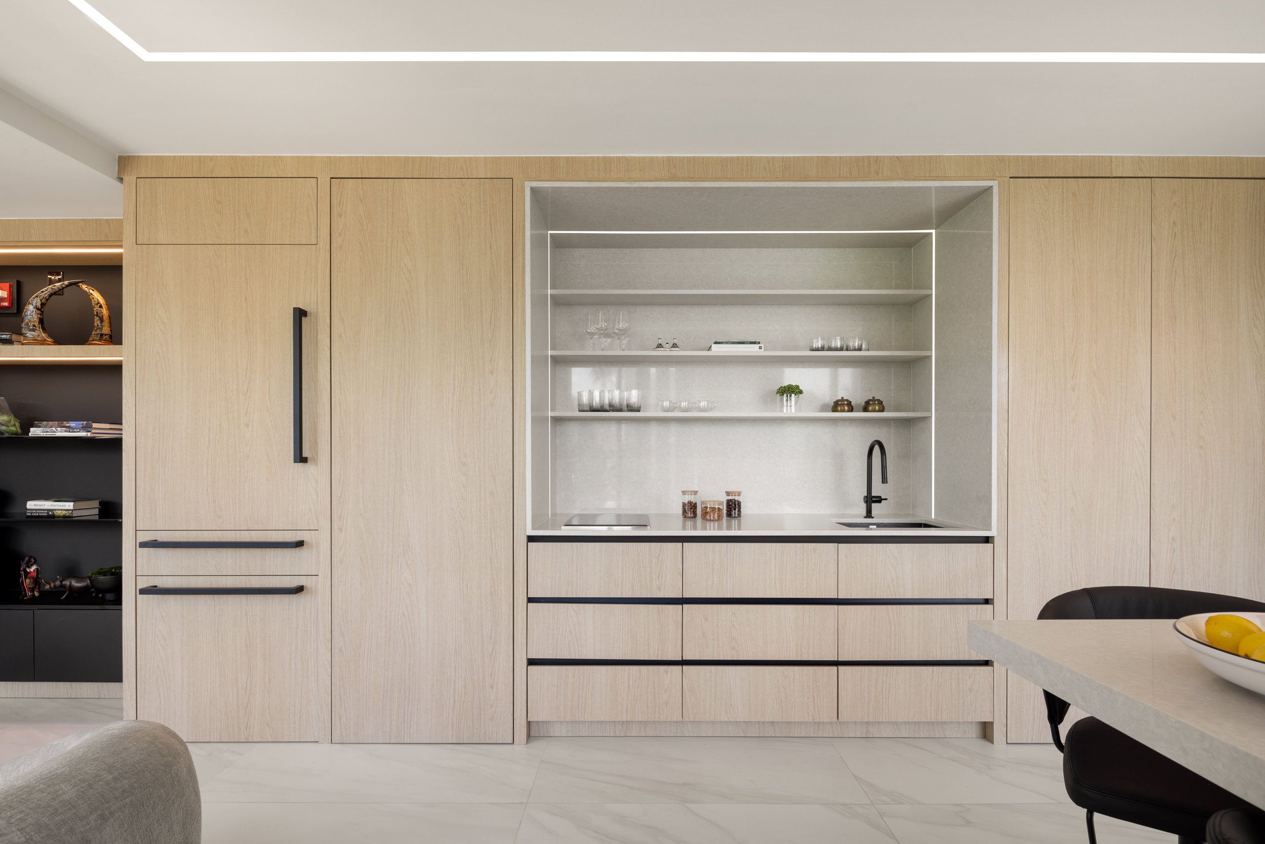 Materiality is intentionally restrained, allowing the architecture to speak with clarity and cohesion. Rift-cut white oak millwork extends across walls and built-in furniture, creating warmth and a sense of continuity. This is contrasted by matte black elements that introduce depth, structure, and hierarchy. Light stone surfaces further balance the palette, contributing to an atmosphere that is both refined and inviting. A carefully placed mustard-yellow accent injects energy, offering a subtle yet impactful visual counterpoint.