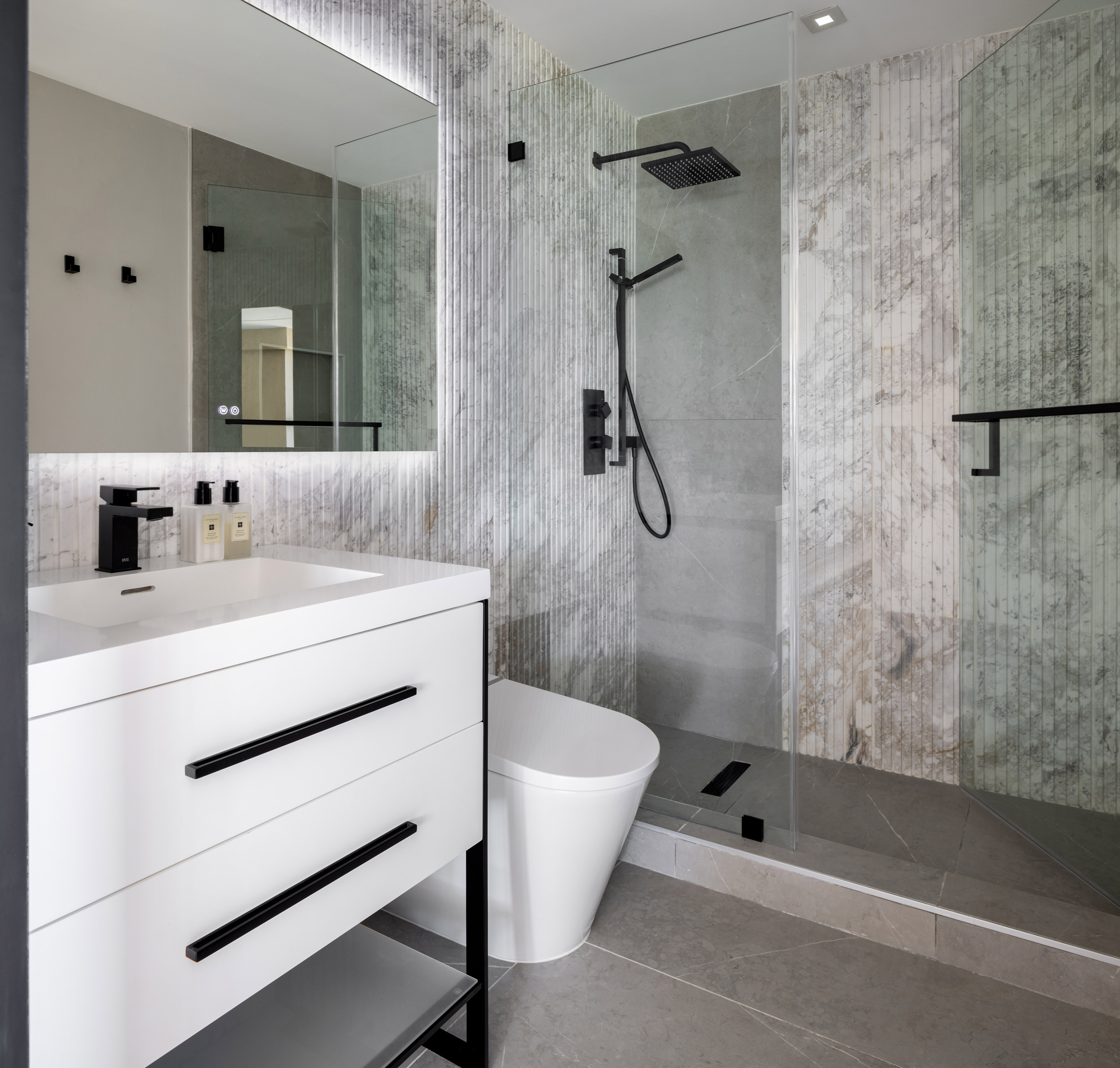 In the kitchen, the design is distilled into a sculptural expression of continuity. The countertop material wraps seamlessly across surfaces—extending from the worktop to the backsplash and floating shelves—creating a unified and monolithic presence. Integrated lighting enhances this effect, emphasizing texture and form while maintaining a clean and uncluttered appearance. The kitchen remains visually integrated within the overall composition, reinforcing the idea of architecture as an all-encompassing system. The bathroom continues this language through texture and restraint, featuring marble slats that introduce vertical rhythm and tactile richness. Storage solutions are meticulously integrated throughout the project, from the queen bed with built-in compartments to overhead cabinetry and concealed shelving. Every element is designed to serve multiple purposes while maintaining visual clarity. The final result is a space that transcends its original limitations, offering a sophisticated and highly functional living environment where design, efficiency, and atmosphere coexist in perfect balance.