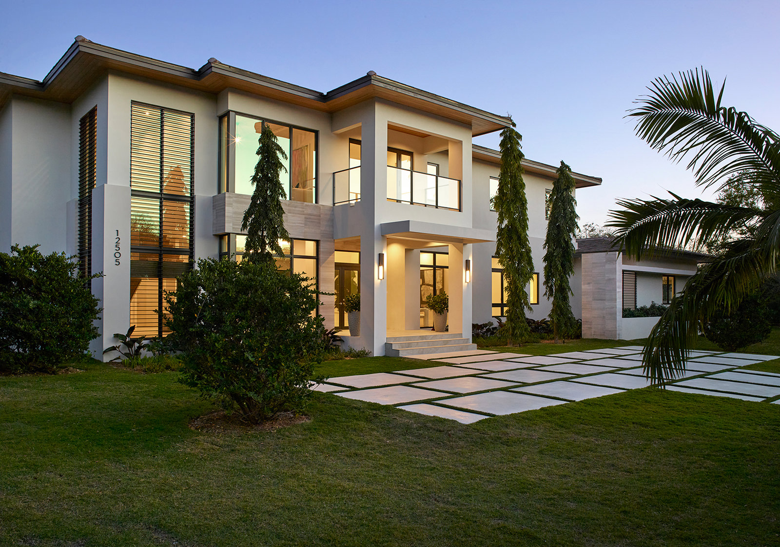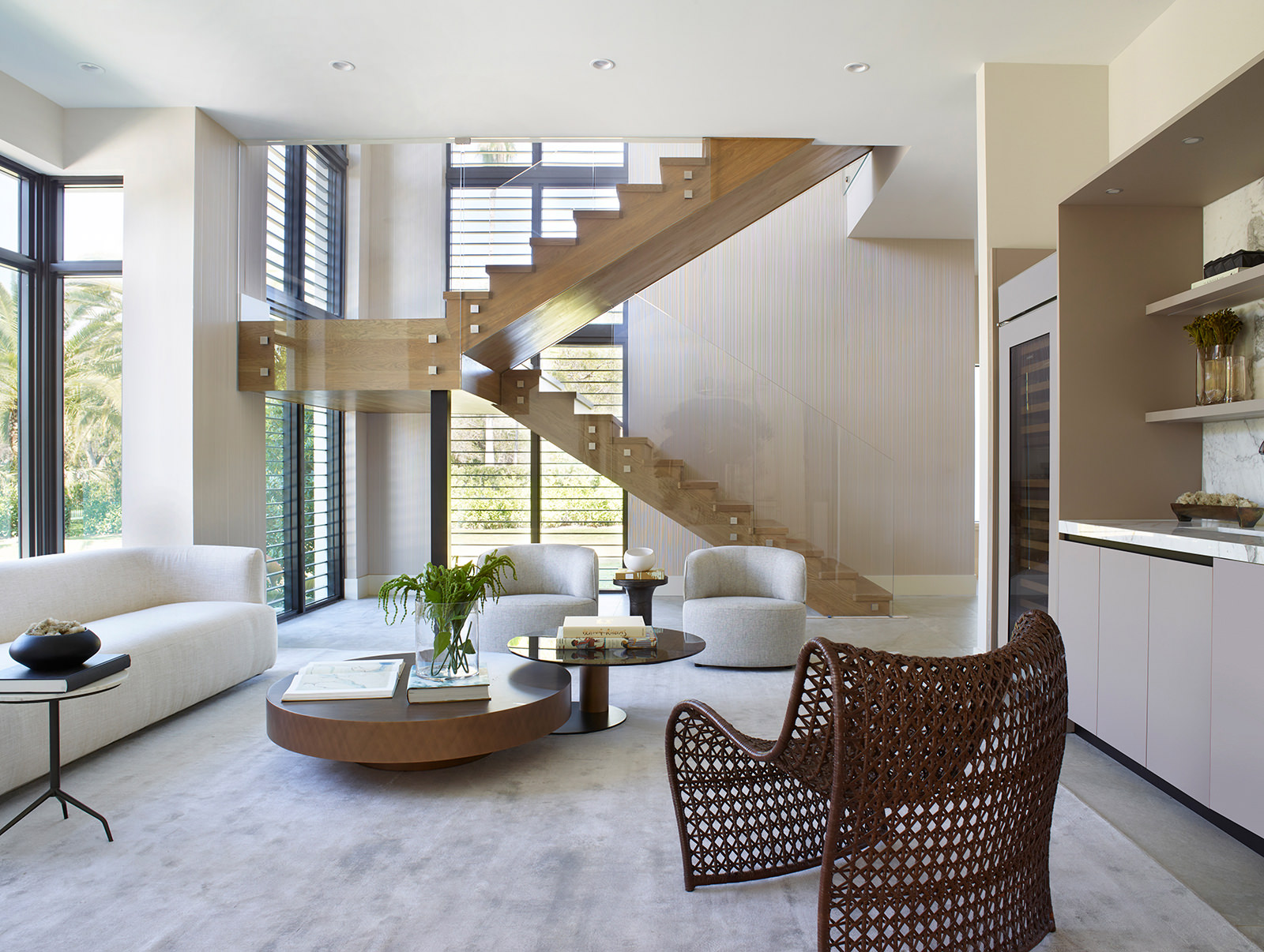 The landscaping plays an essential role in shaping the architectural narrative. A curated selection of native species—including saw palmettos, low grasses, and Florida flora—filters the transition between interior and exterior, creating a strong sense of privacy without enclosing the home from its context. A slim water feature and coral stone pavers quietly echo the textures and hues found within, reinforcing the project’s material cohesion.