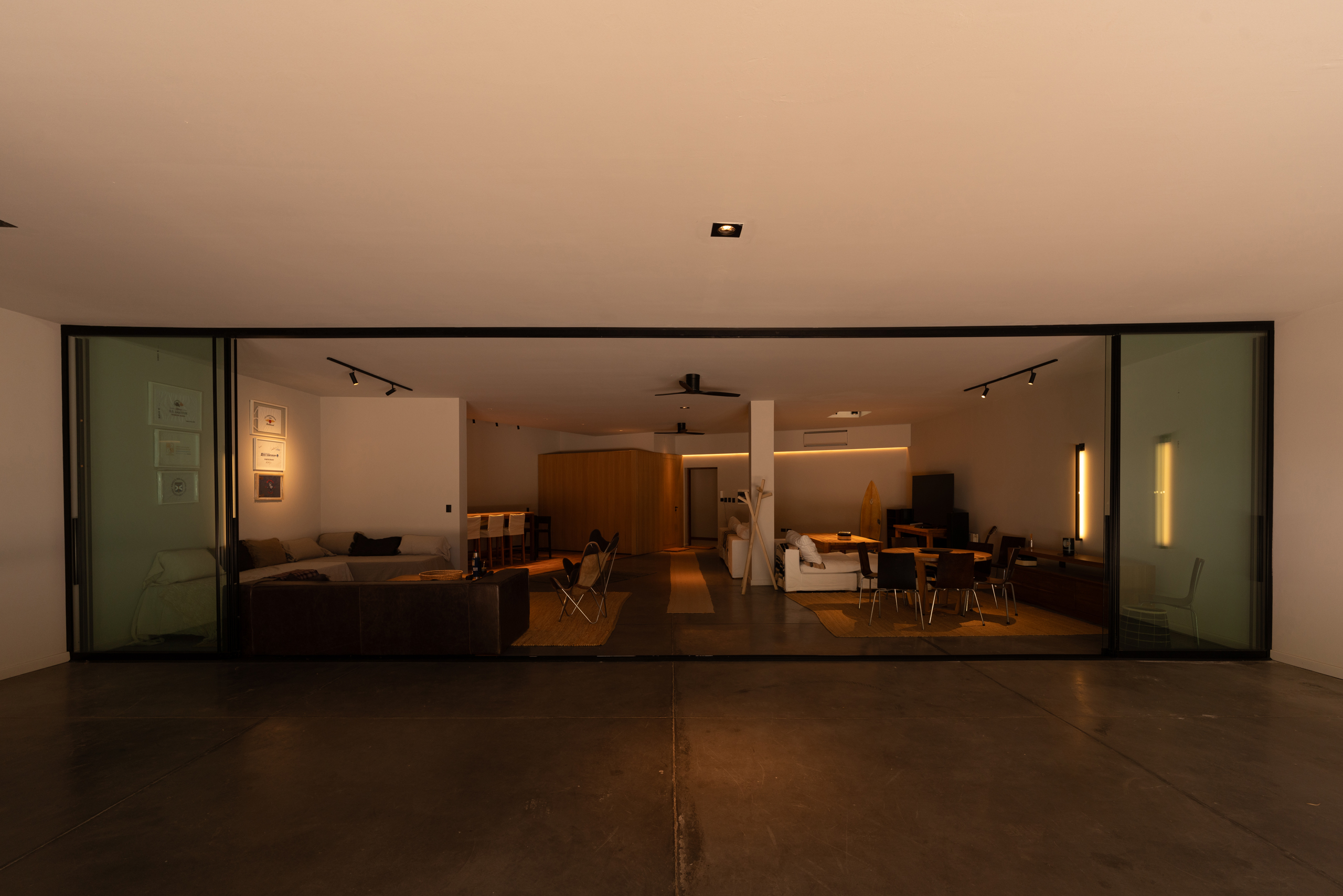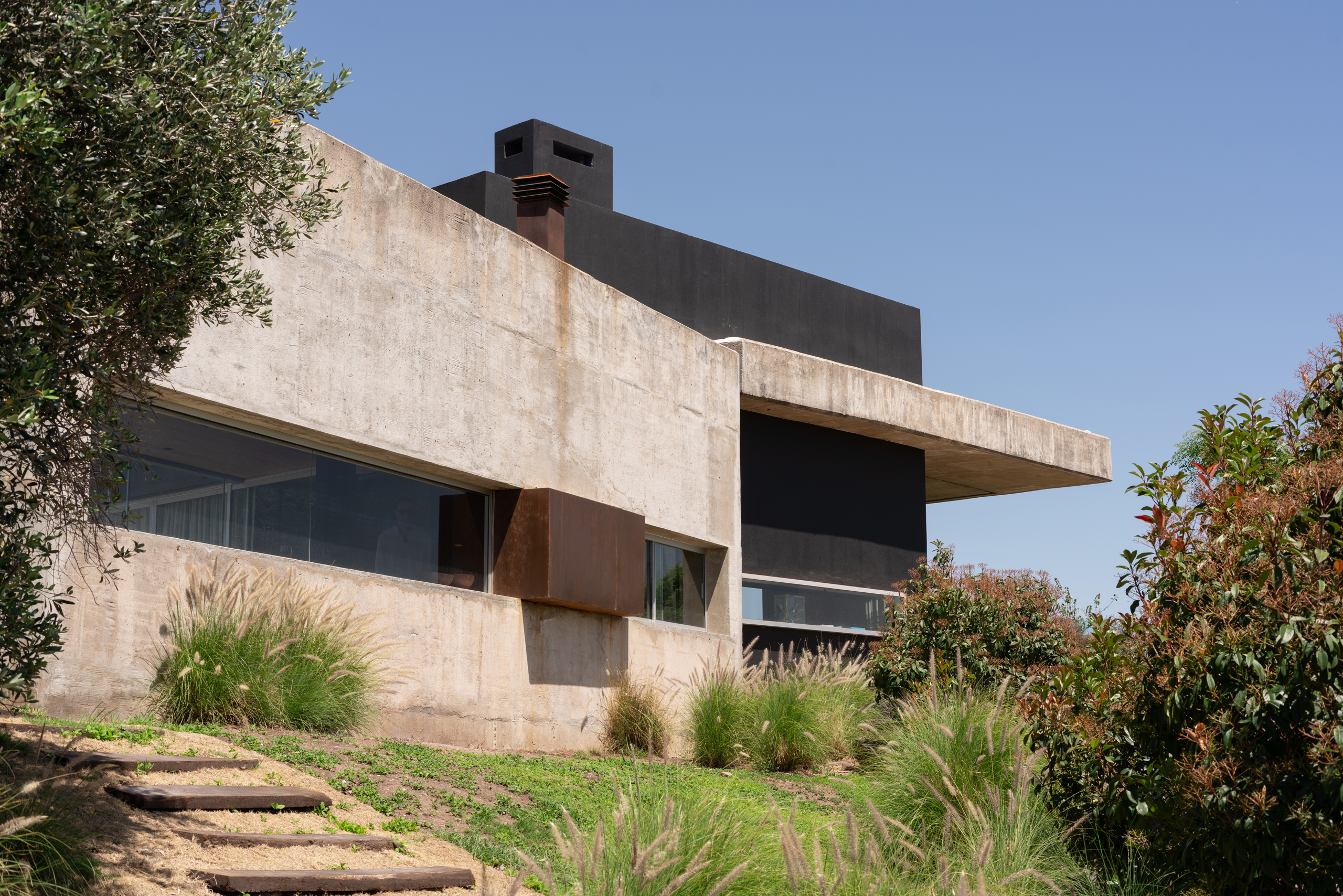 The relationship with the surrounding landscape is equally nuanced. Native vegetation and the terrain itself soften the materiality of the home, offering contrast and context. The tension between mineral architecture and living landscape enriches the reading of the space—inviting a layered perception that is both physical and emotional. The home feels embedded, not imposed—an object in dialogue with its site.