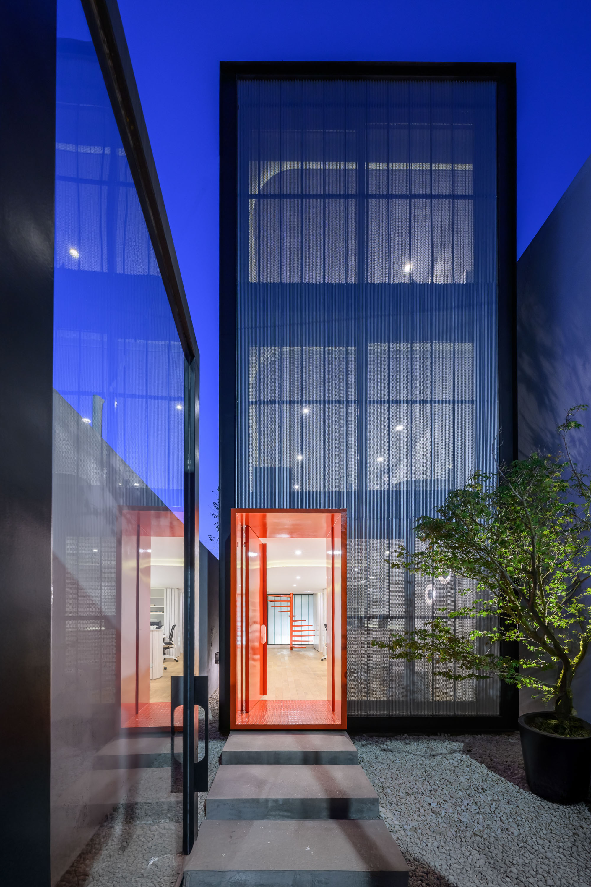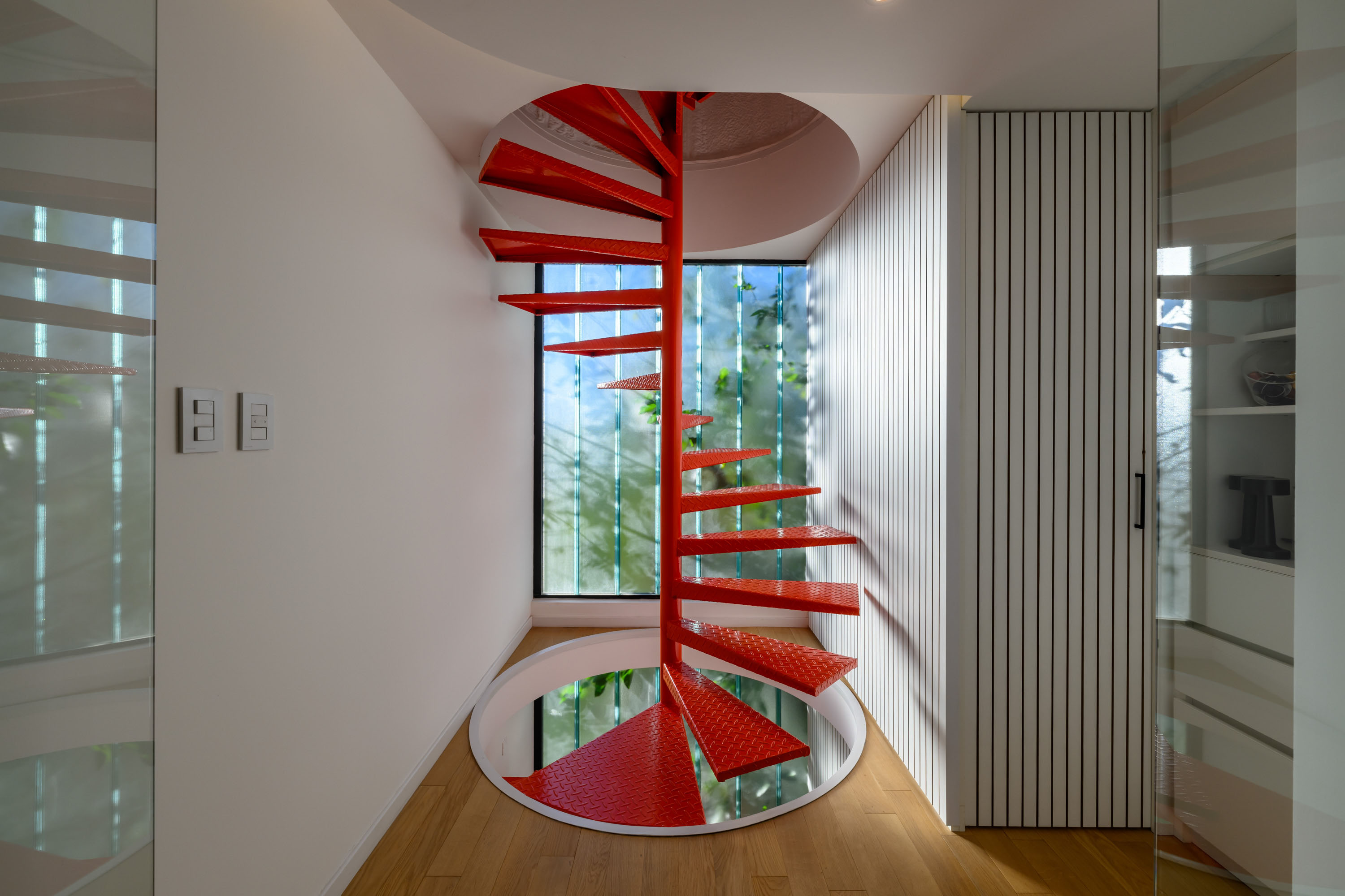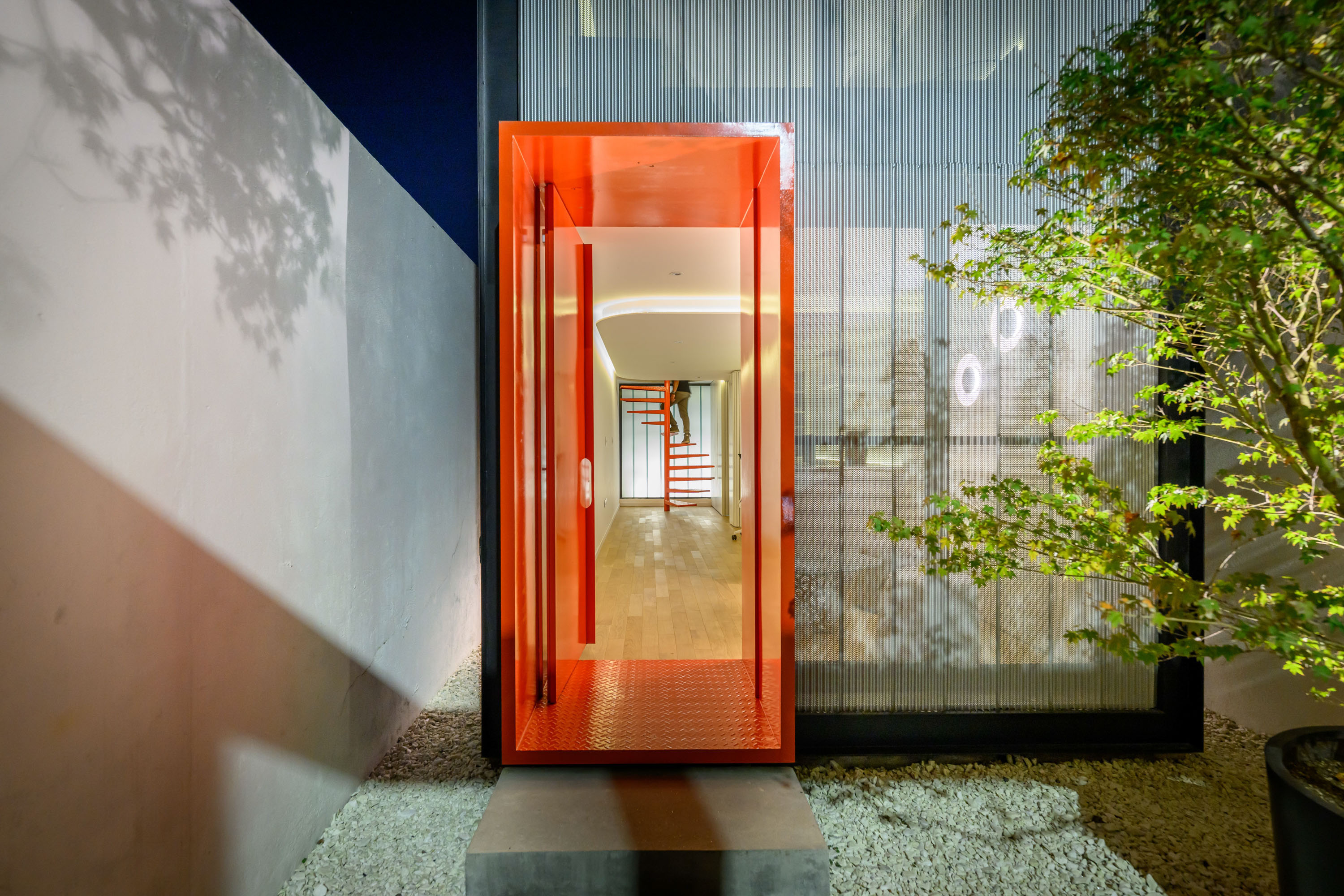 The most striking element of the building is its front facade: a perforated metal screen that mediates between transparency and opacity. This veil transforms throughout the day—filtering sunlight, revealing movement within, and casting delicate shadows across the interior. It is both an aesthetic statement and a functional response to the urban condition. By regulating privacy and light, the screen allows the workspace to remain luminous and open while shielding its occupants from the immediacy of the street. The facade thus becomes the project’s voice, communicating restraint, precision, and contemporary identity. Within the elongated footprint, the design resolves spatial flow with efficiency and grace. Circulation is directed towards the rear, where a sculptural spiral staircase serves as the building’s vertical anchor. This element is more than a means of movement—it is an internal landmark, a sculptural gesture that introduces dynamism into the composition. Around it, open-plan workspaces unfold in generous, flexible arrangements that can adapt to the evolving needs of an architectural practice. The result is an environment that feels simultaneously intimate and expansive, structured yet fluid.