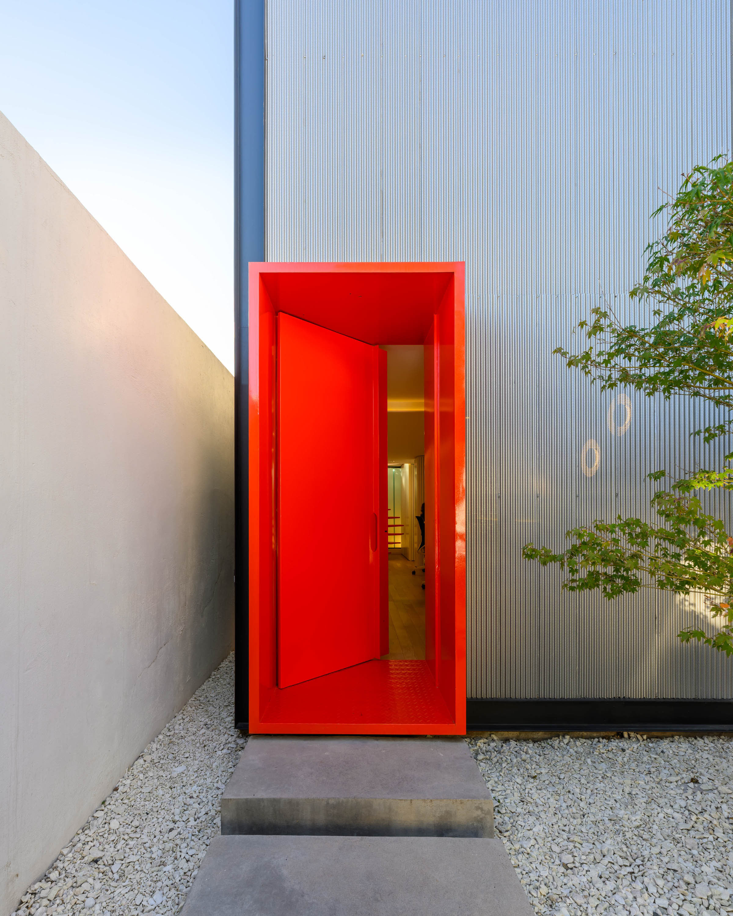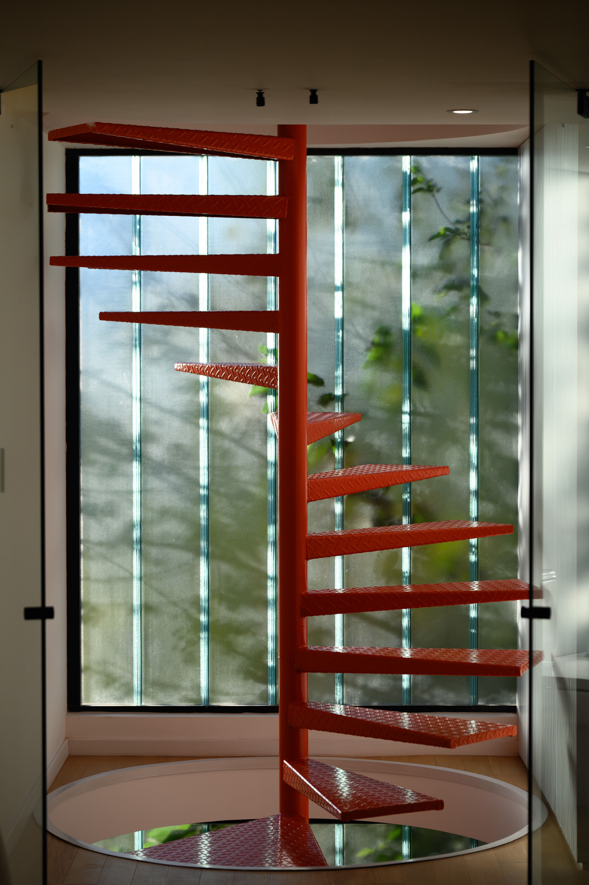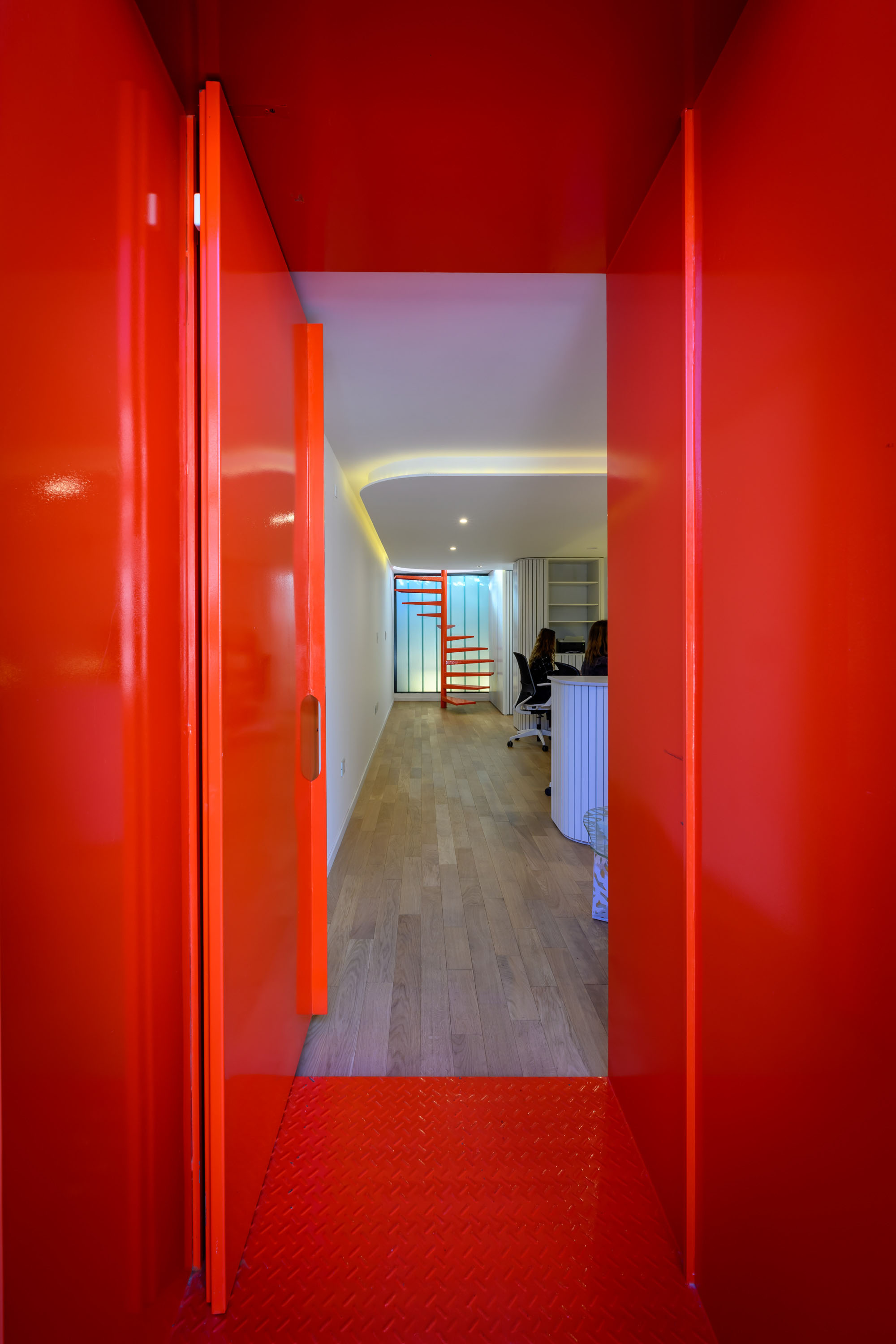 The most striking element of the building is its front facade: a perforated metal screen that mediates between transparency and opacity. This veil transforms throughout the day—filtering sunlight, revealing movement within, and casting delicate shadows across the interior. It is both an aesthetic statement and a functional response to the urban condition. By regulating privacy and light, the screen allows the workspace to remain luminous and open while shielding its occupants from the immediacy of the street. The facade thus becomes the project’s voice, communicating restraint, precision, and contemporary identity. Within the elongated footprint, the design resolves spatial flow with efficiency and grace. Circulation is directed towards the rear, where a sculptural spiral staircase serves as the building’s vertical anchor. This element is more than a means of movement—it is an internal landmark, a sculptural gesture that introduces dynamism into the composition. Around it, open-plan workspaces unfold in generous, flexible arrangements that can adapt to the evolving needs of an architectural practice. The result is an environment that feels simultaneously intimate and expansive, structured yet fluid.