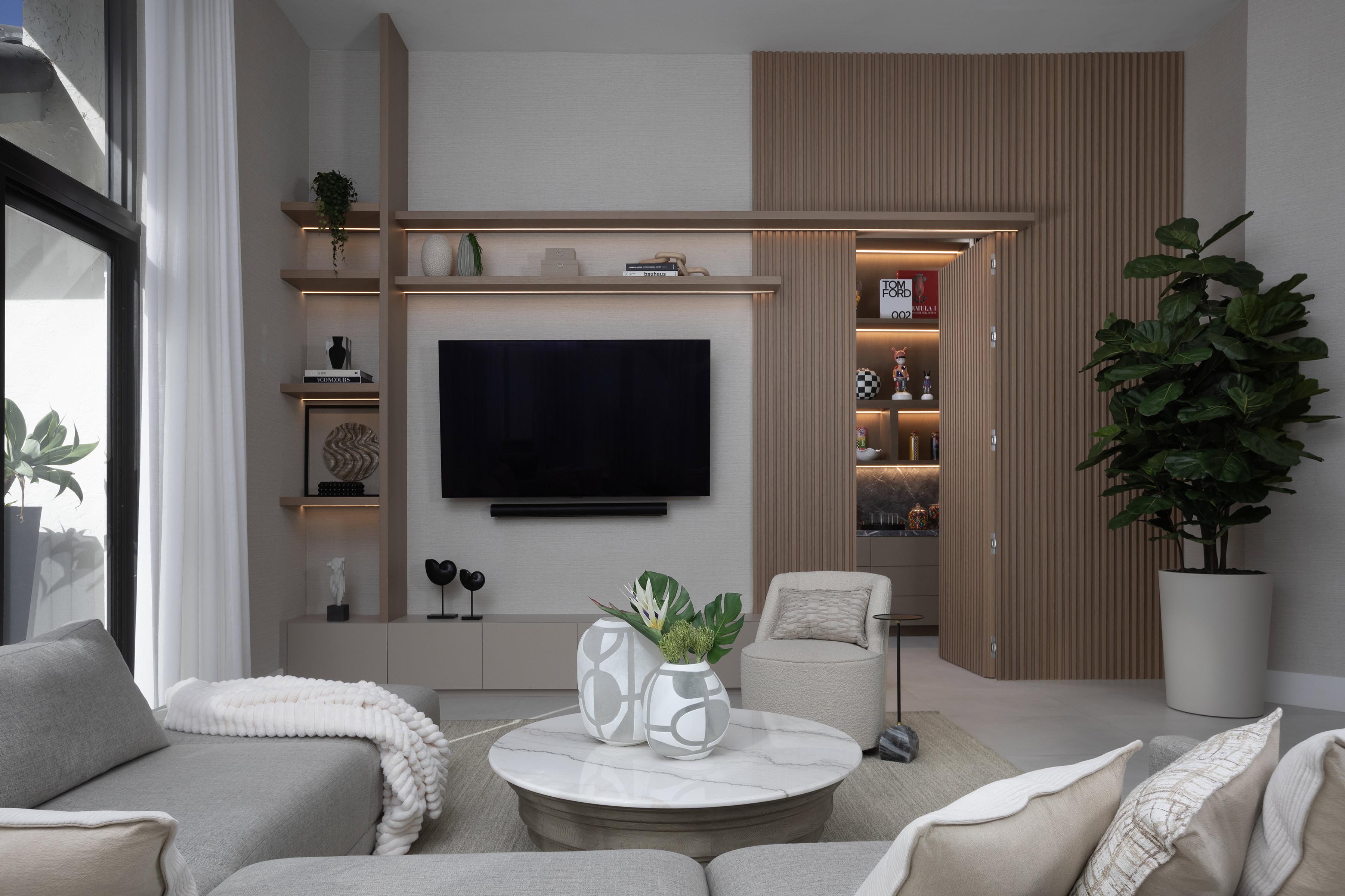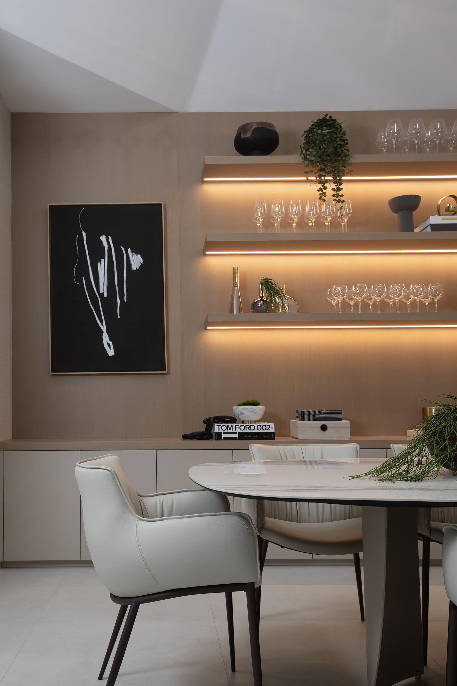 The palette plays a crucial role in establishing this tone. Sand beige and warm greige dominate the walls and fixed joinery, paired with marble-white surfaces, taupe upholstery, matte black accents and warm amber light. This refined composition allows for visual harmony and spatial continuity, offering a timeless backdrop for texture, art, and human presence to come alive. The materials—stone, wood, glass and metal—are selected for their tactile honesty and atmospheric depth. A sculptural oval table with soft veining in natural stone anchors the room, while glassware and floating shelves turn storage into display. An illuminated back wall integrates shelving, low cabinetry and a vertical wine feature, offering both symmetry and drama without visual clutter. The overall reading is one of controlled richness—minimal, yet multisensory.