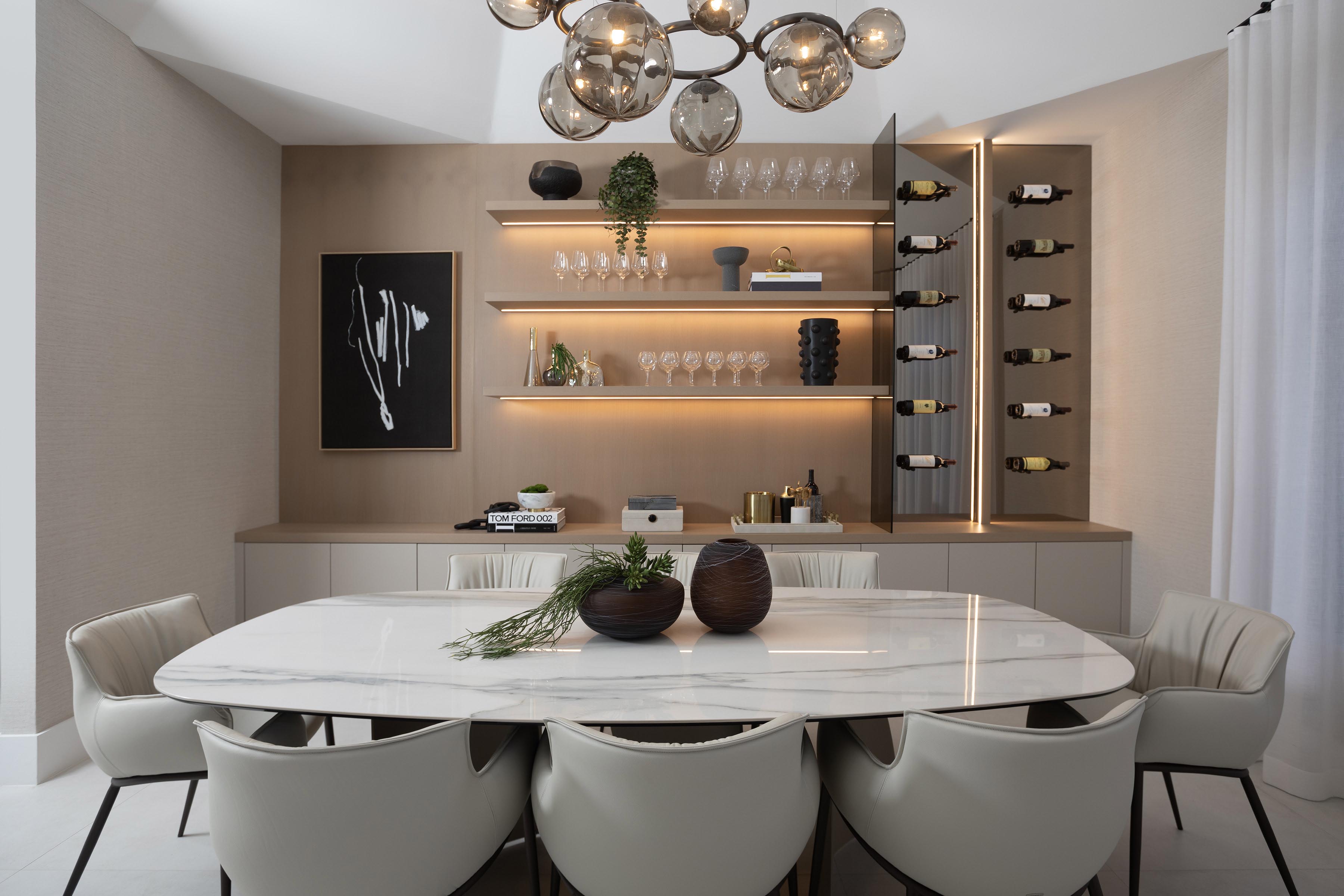 Throughout the home, the approach to materiality is echoed and reinforced. In collaboration with Sharron Lewis, Concepto MV designed custom built-ins that serve as both functional infrastructure and architectural articulation. Working with Addison House, the team also introduced a curated selection of pieces from European brands such as Pianca, Cattelan, and Nature Design. These elements lend sculptural clarity and international finesse, creating a layered yet cohesive visual language. The dining space is among the most striking moments of the project—a contemporary, high-end environment that functions as a hybrid between a social hub, domestic gallery and wine lounge. Here, design does not seek protagonism, but expresses itself through restraint. The space exudes a quiet sophistication that speaks to the new language of luxury: calm, composed and profoundly architectural.
