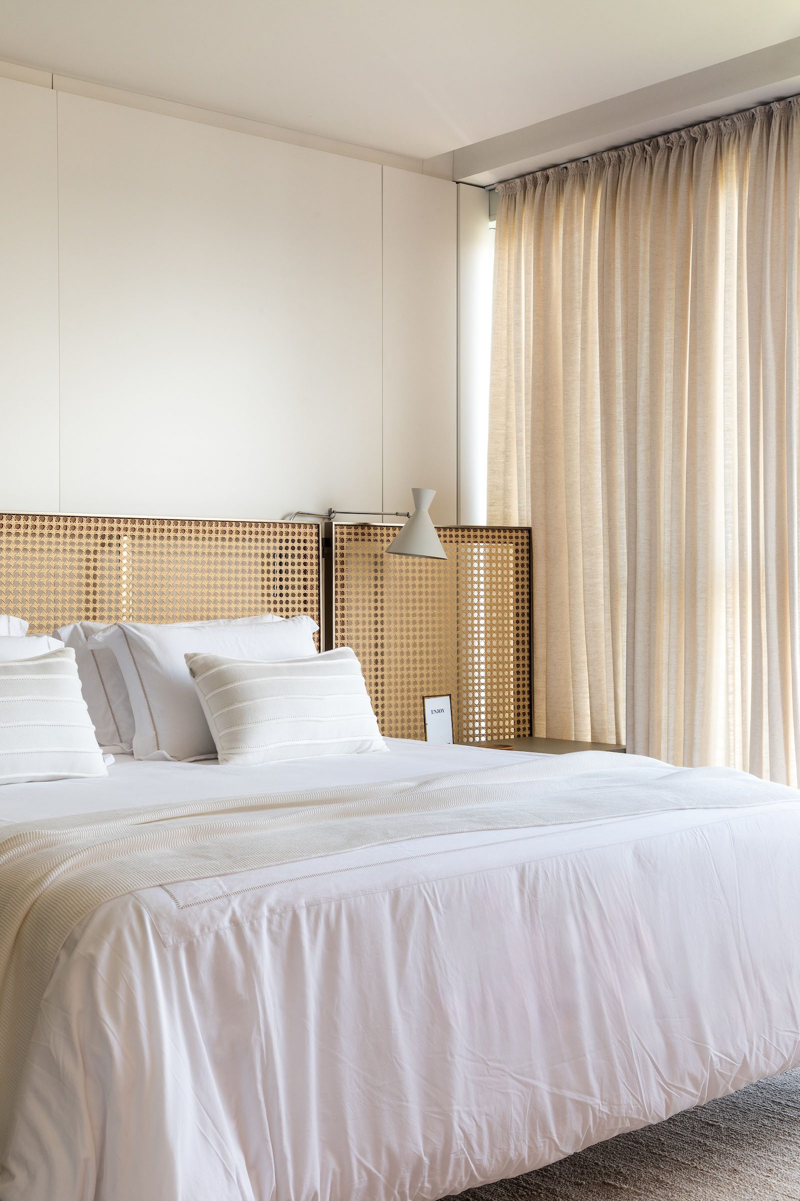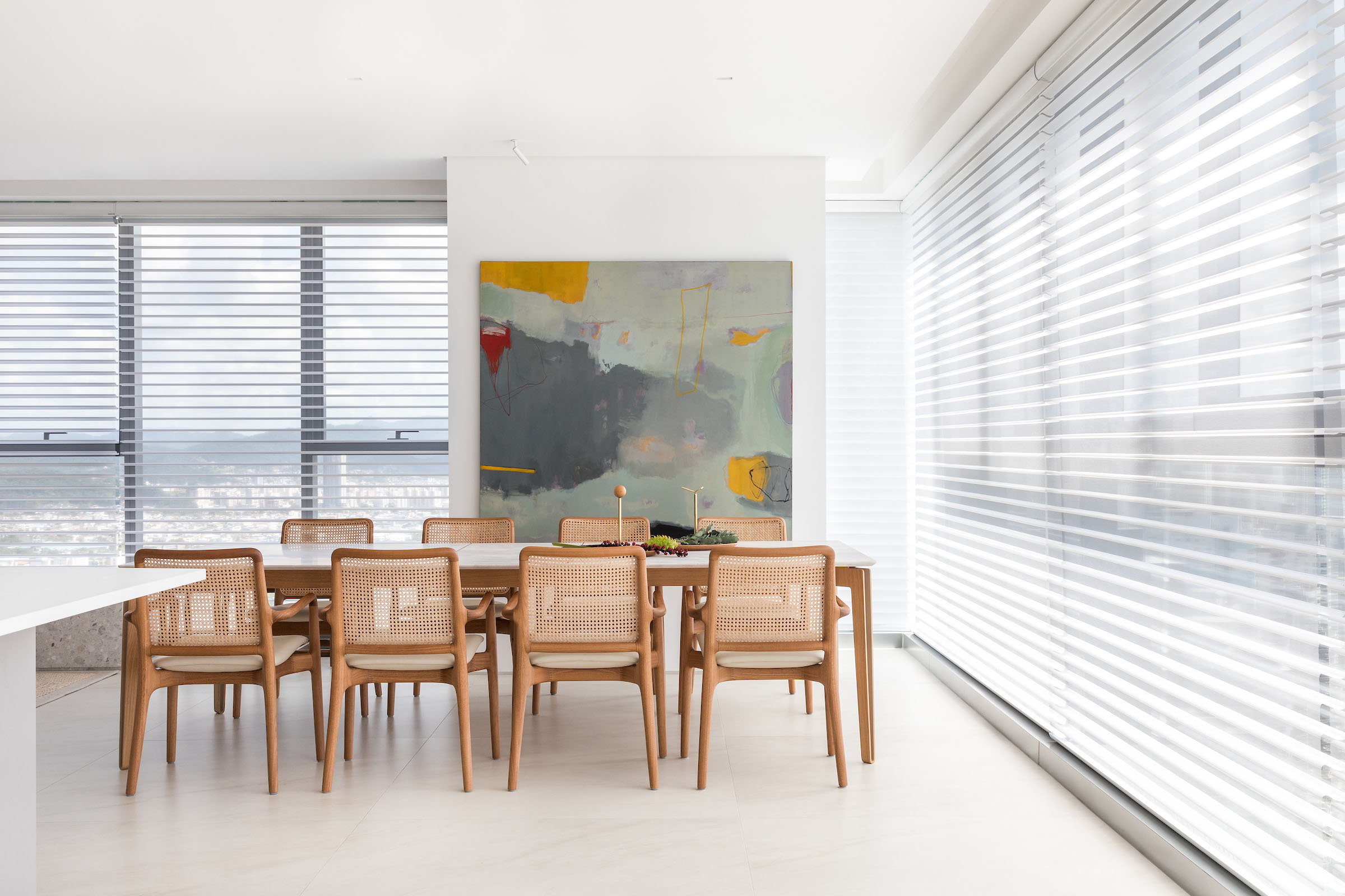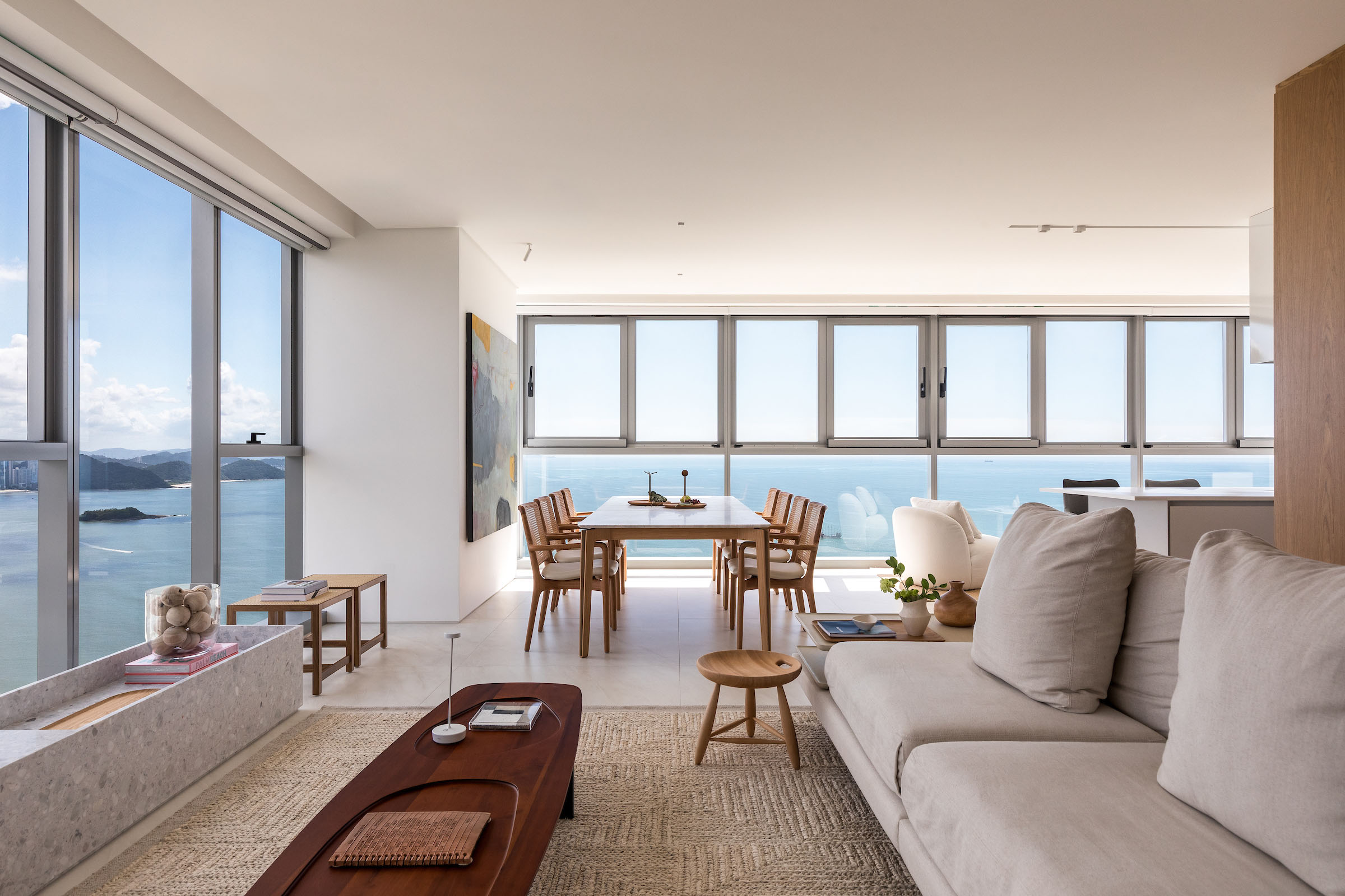 Materiality plays a quiet yet decisive role. Pale stone flooring and a stone window bench establish a cool, neutral foundation, balanced by vertical timber panelling and warm wooden tables and chairs. Woven rugs and natural fibres introduce texture without visual noise. Stones with a subtly recycled appearance add tactile depth and a sense of timelessness. The result is a contemporary coastal minimalism enriched with understated Brazilian-modern accents.