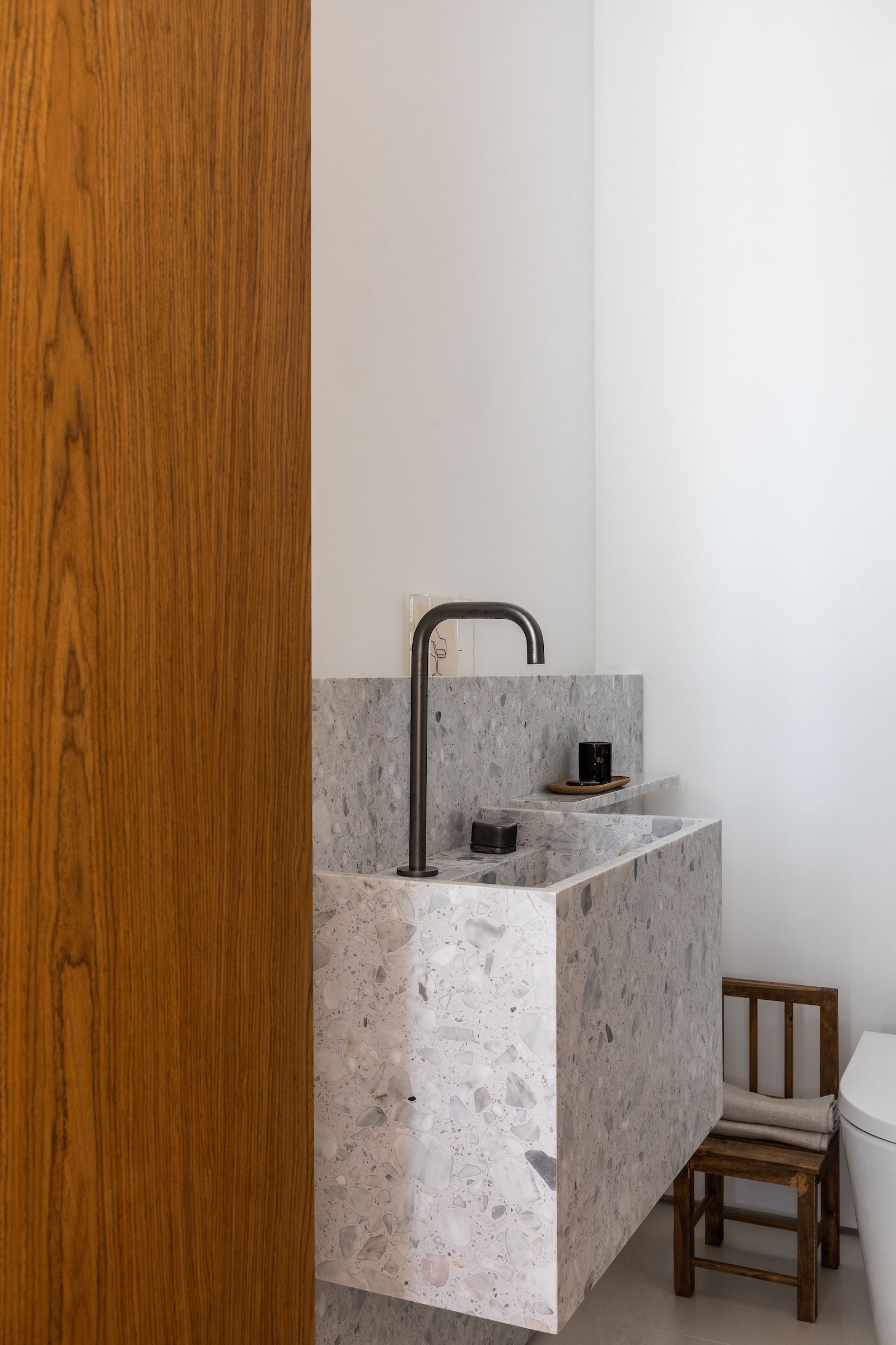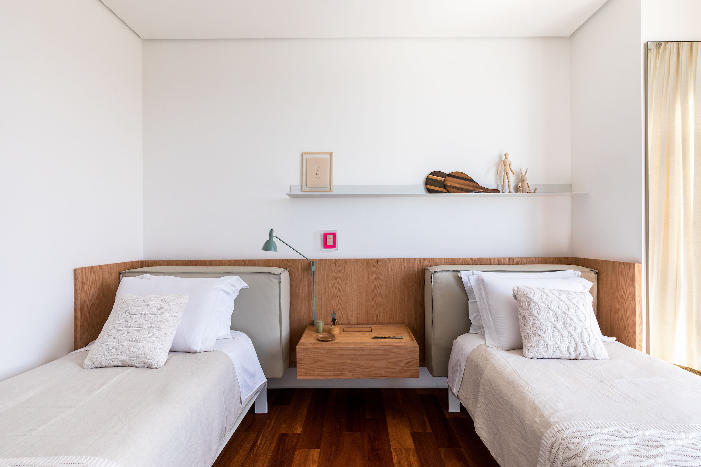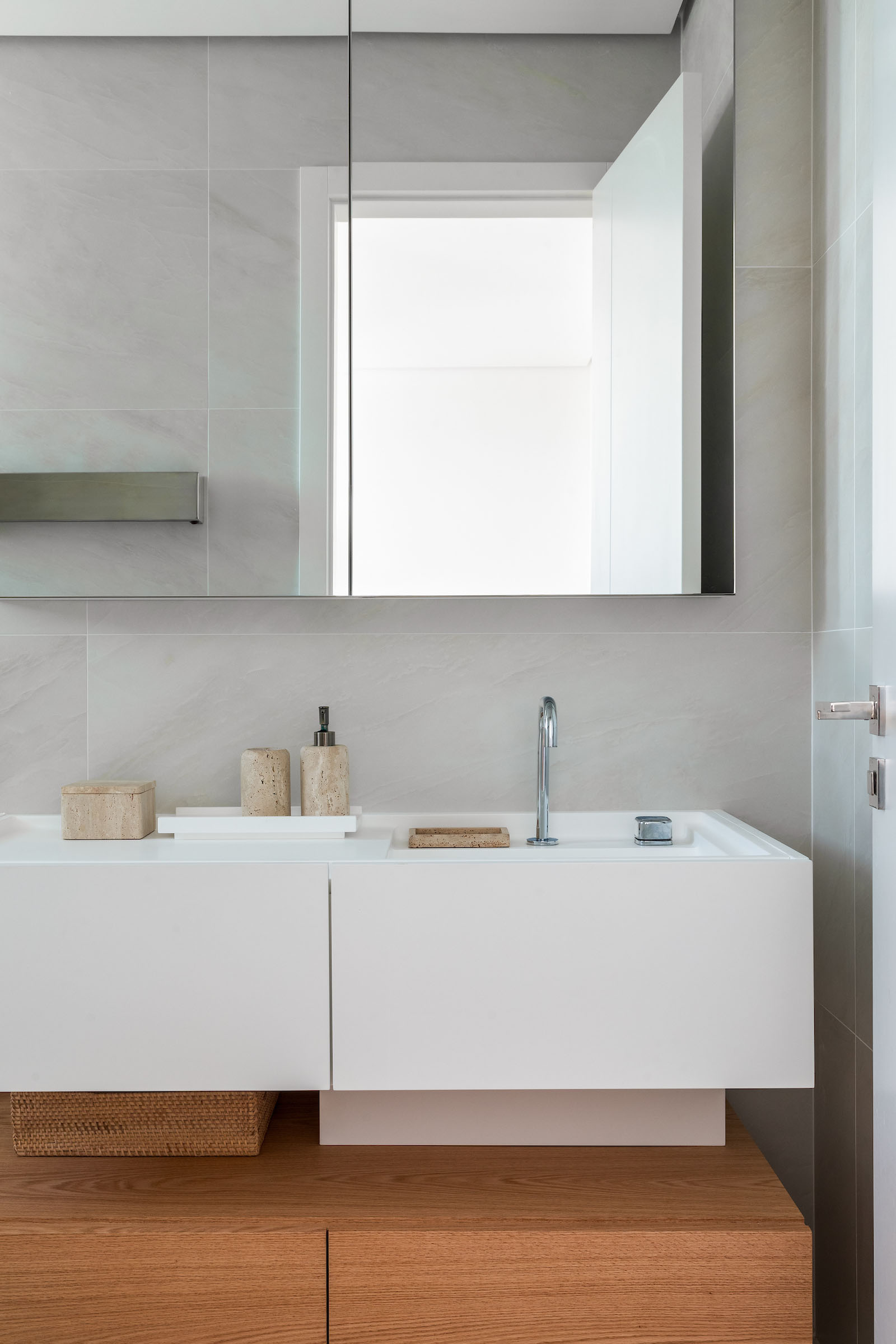 Materiality plays a quiet yet decisive role. Pale stone flooring and a stone window bench establish a cool, neutral foundation, balanced by vertical timber panelling and warm wooden tables and chairs. Woven rugs and natural fibres introduce texture without visual noise. Stones with a subtly recycled appearance add tactile depth and a sense of timelessness. The result is a contemporary coastal minimalism enriched with understated Brazilian-modern accents.