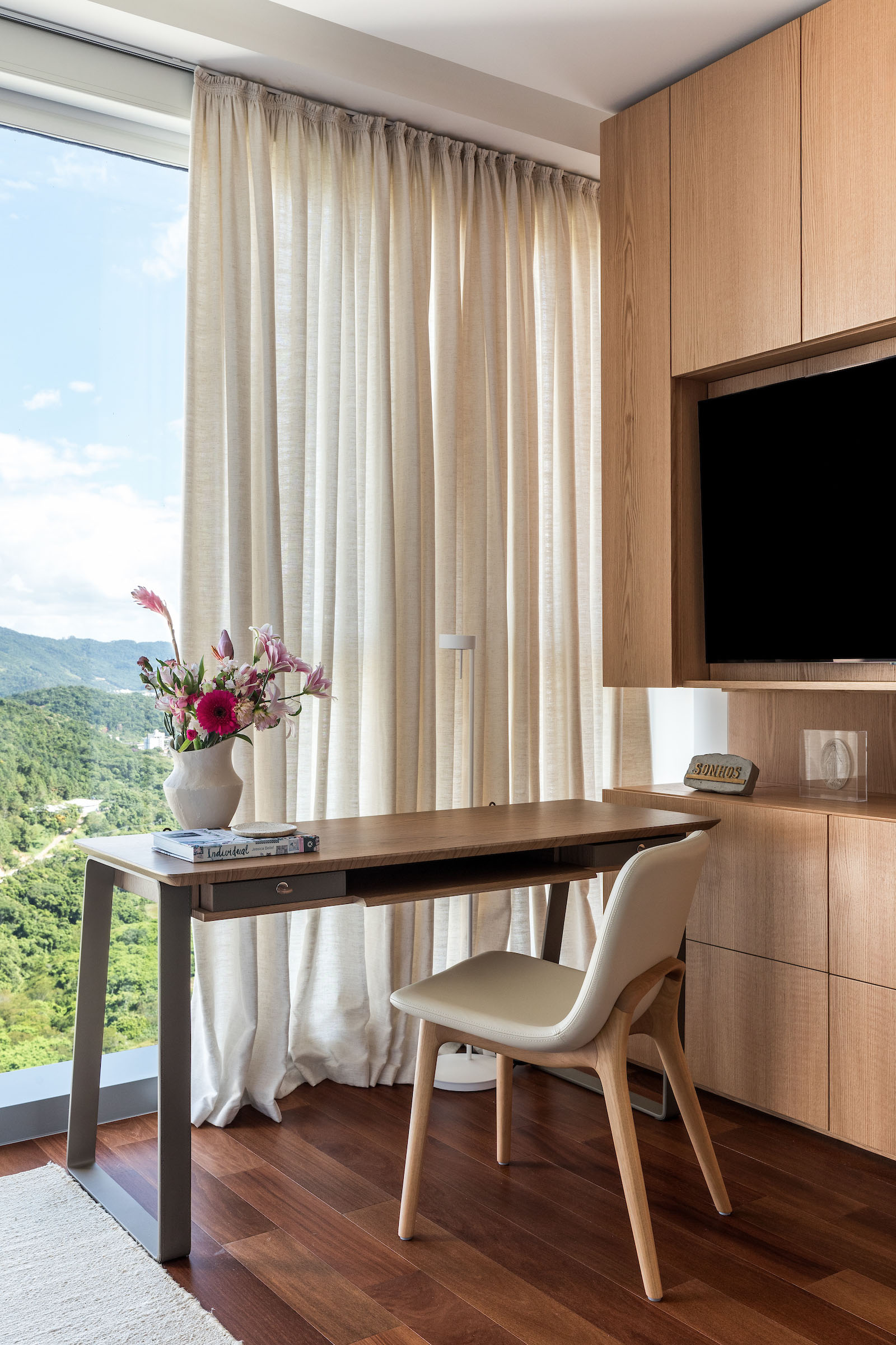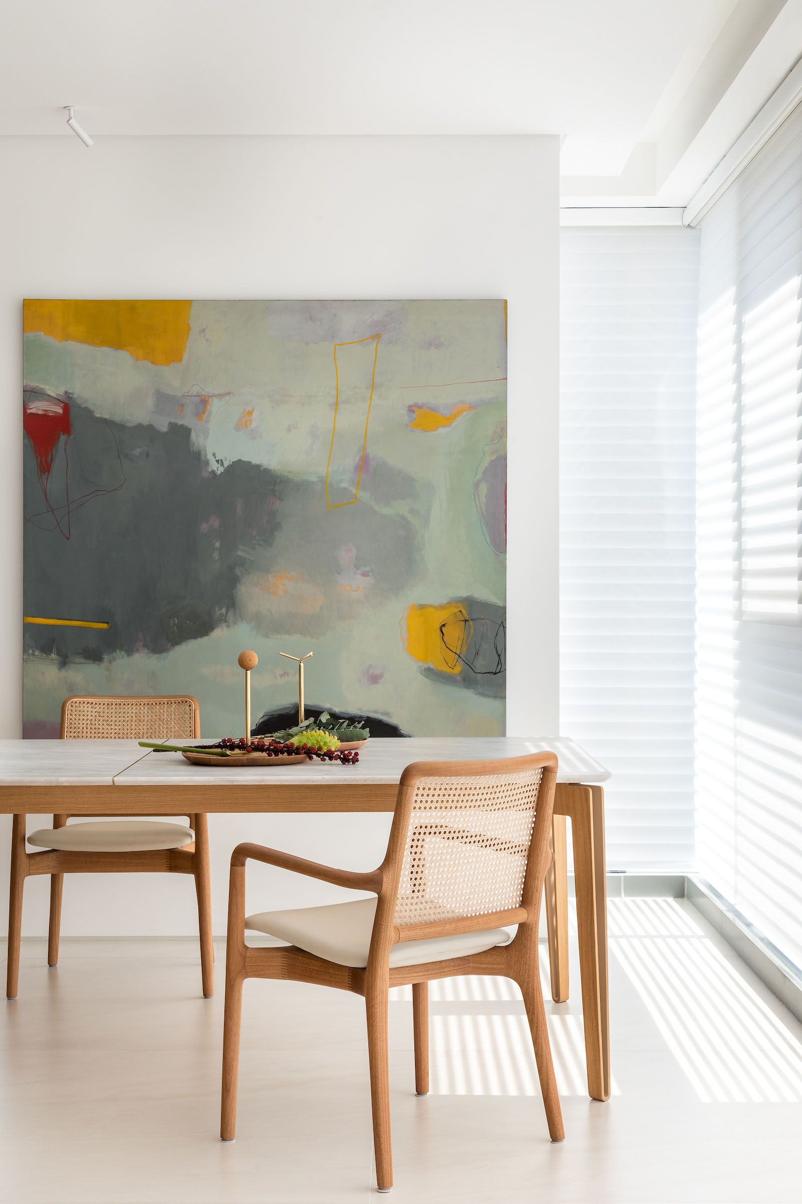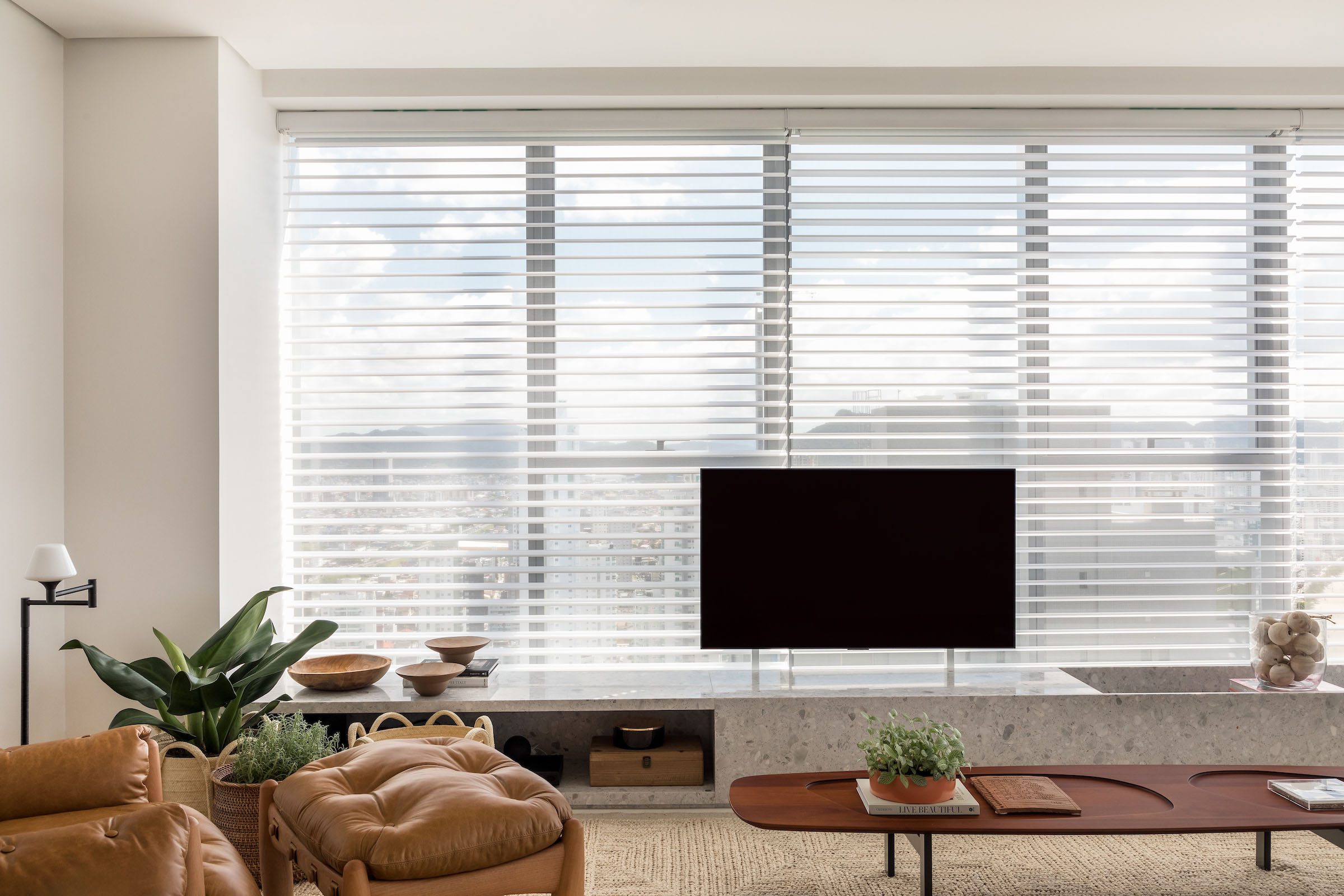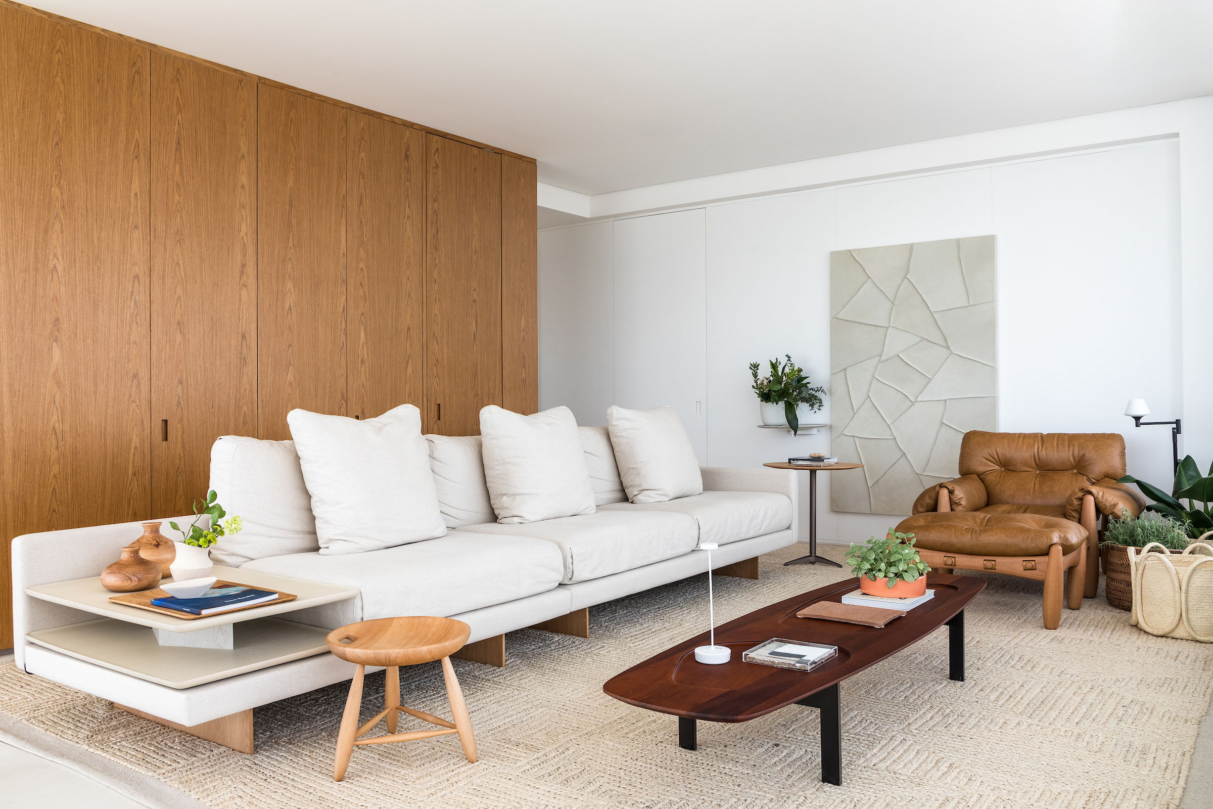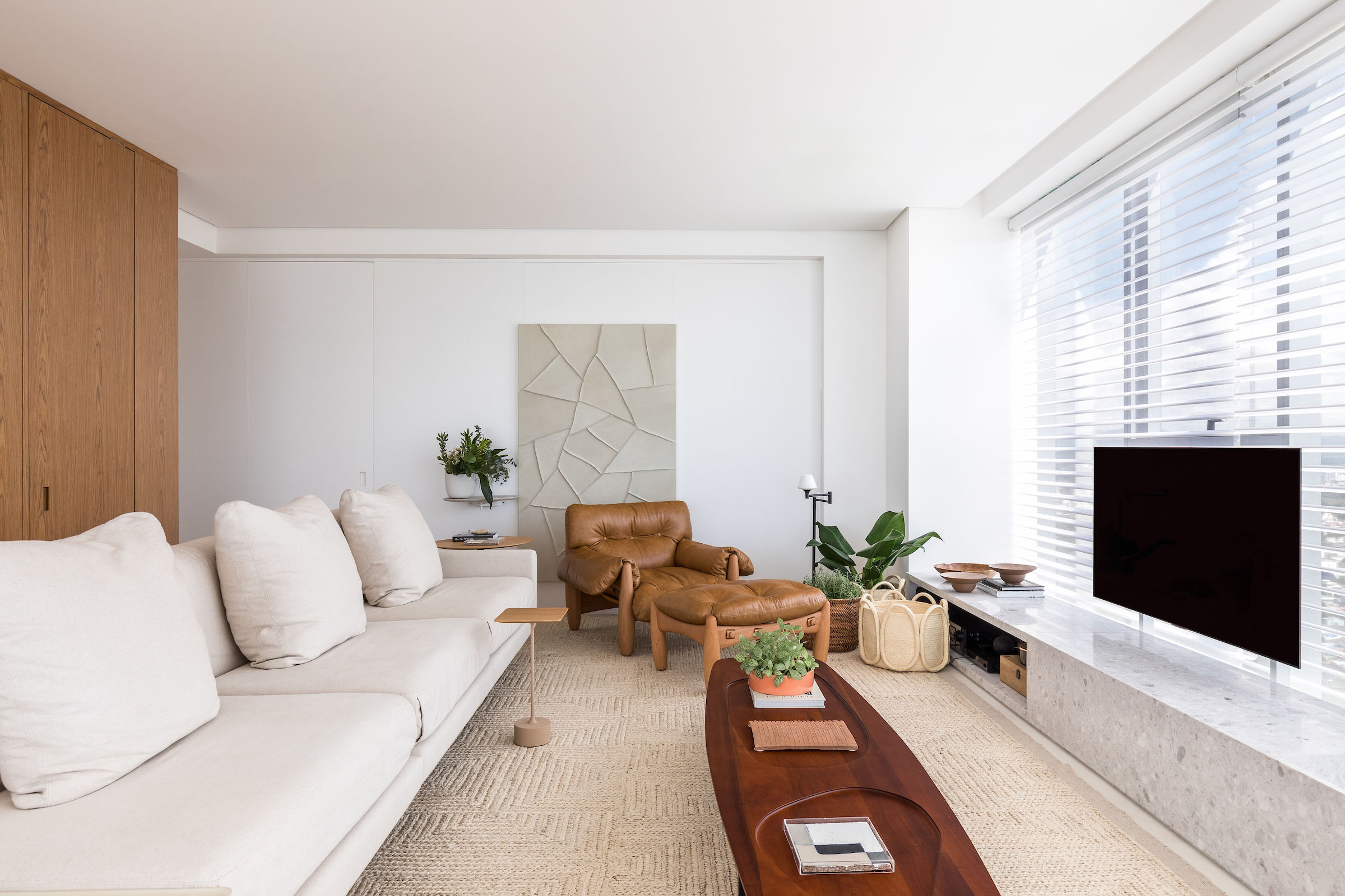 Furniture and art were selected with equal restraint. Behind the iconic Mole armchair, an artwork from Galeria Cosmos was chosen after careful study of scale, colour and proportion, bringing personality without overpowering the composition. Pieces by Arthur Casas, Sérgio Rodrigues and Jader Almeida reinforce a deep appreciation for Brazilian authorship, forming a concise and elegant arrangement that privileges comfort and authenticity. Natural plants punctuate the interiors, adding vitality and freshness.