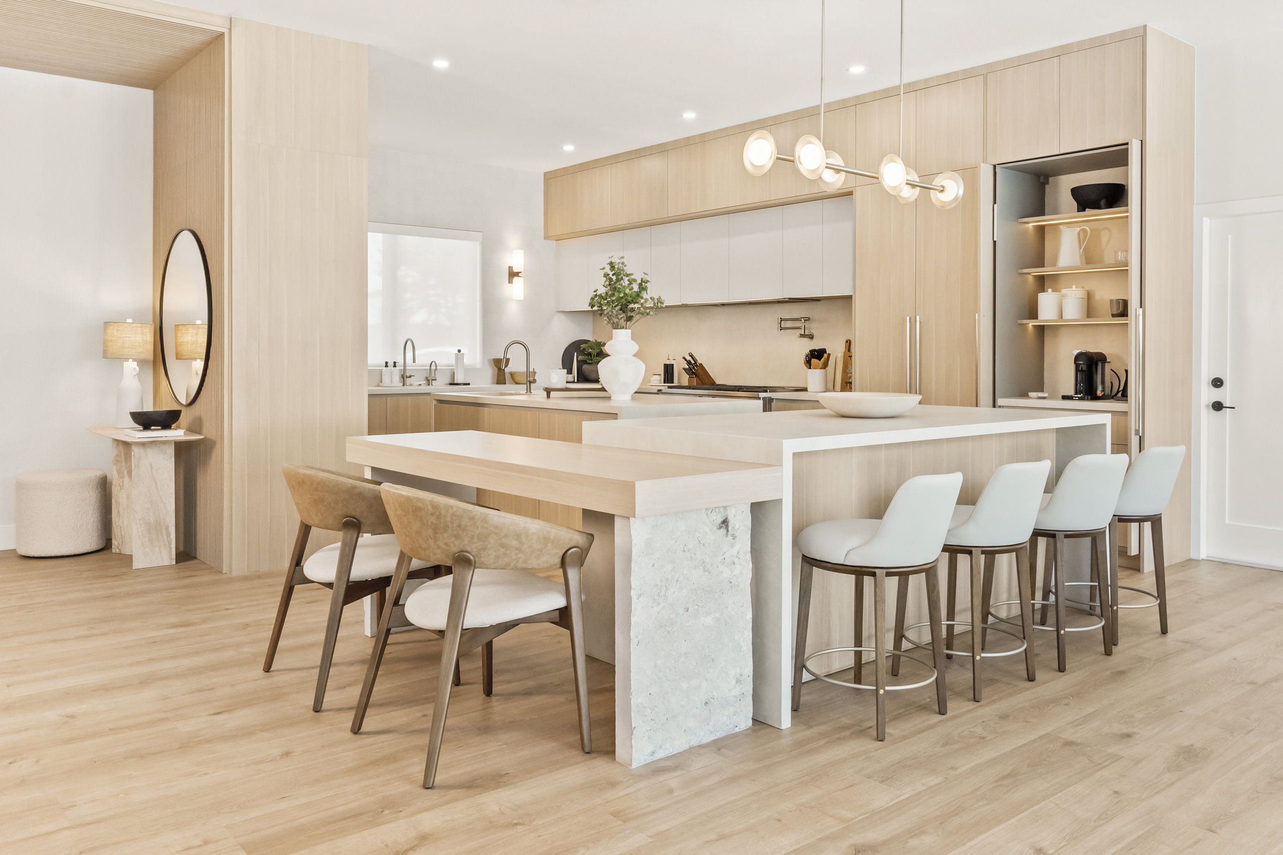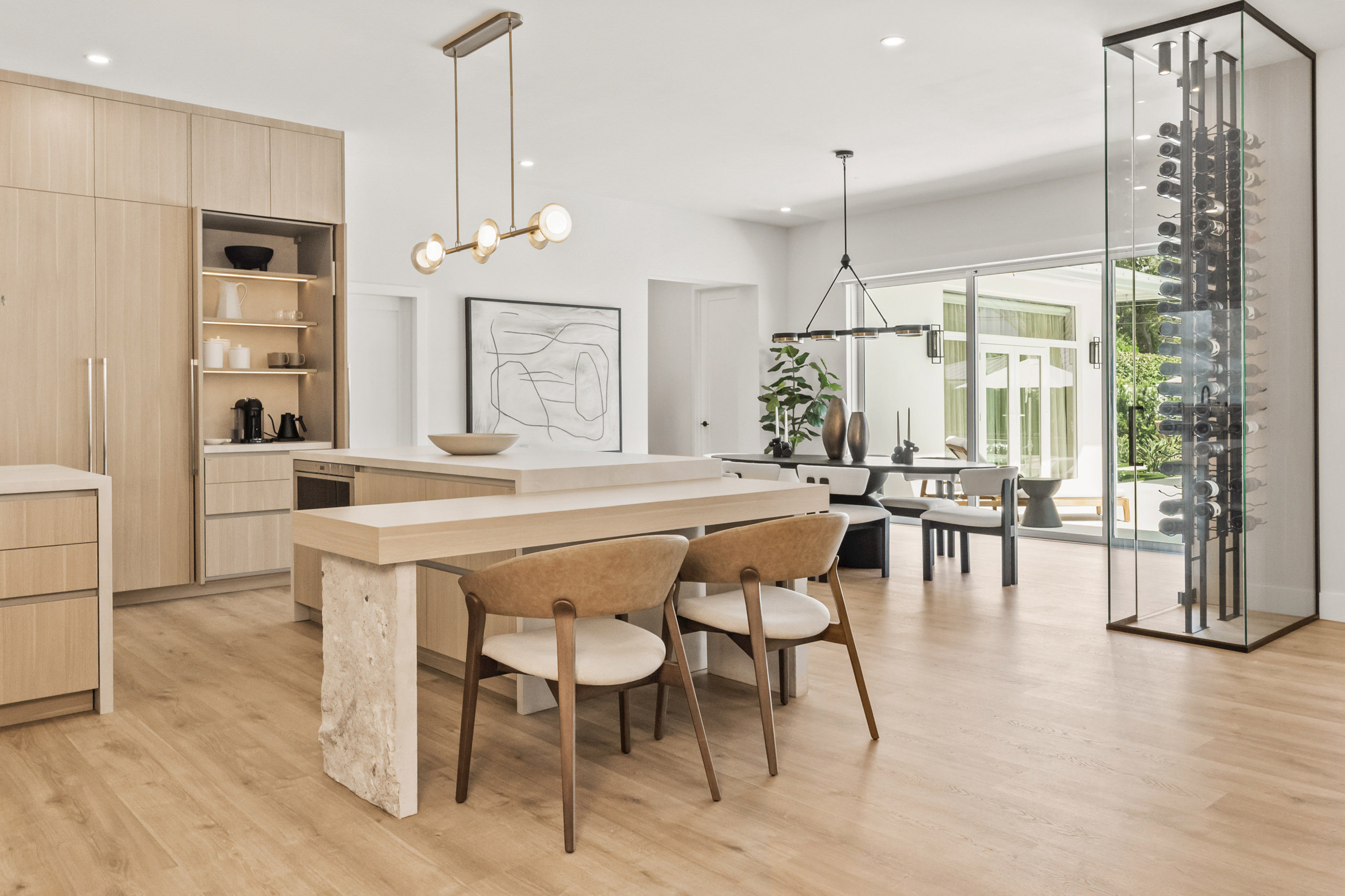 At the heart of the home lies the kitchen, conceived as a social space as much as a functional one. An oversized island acts as both a visual anchor and a gathering point, serving simultaneously as a work surface and a sculptural element. Its presence defines the space without overpowering it, integrating naturally into the overall composition.