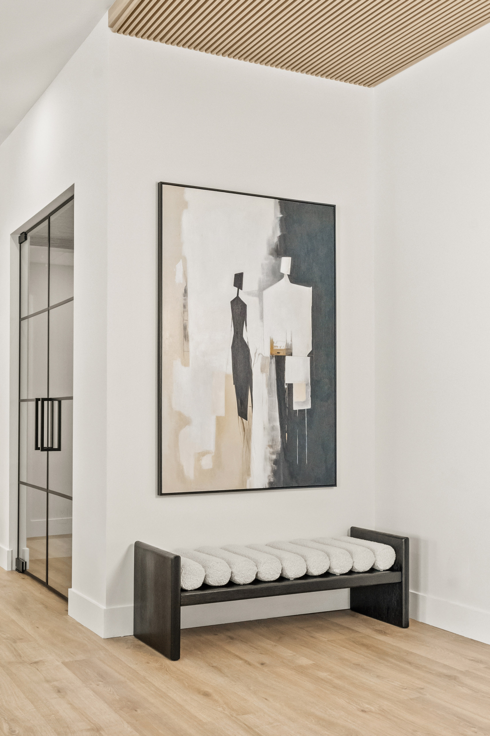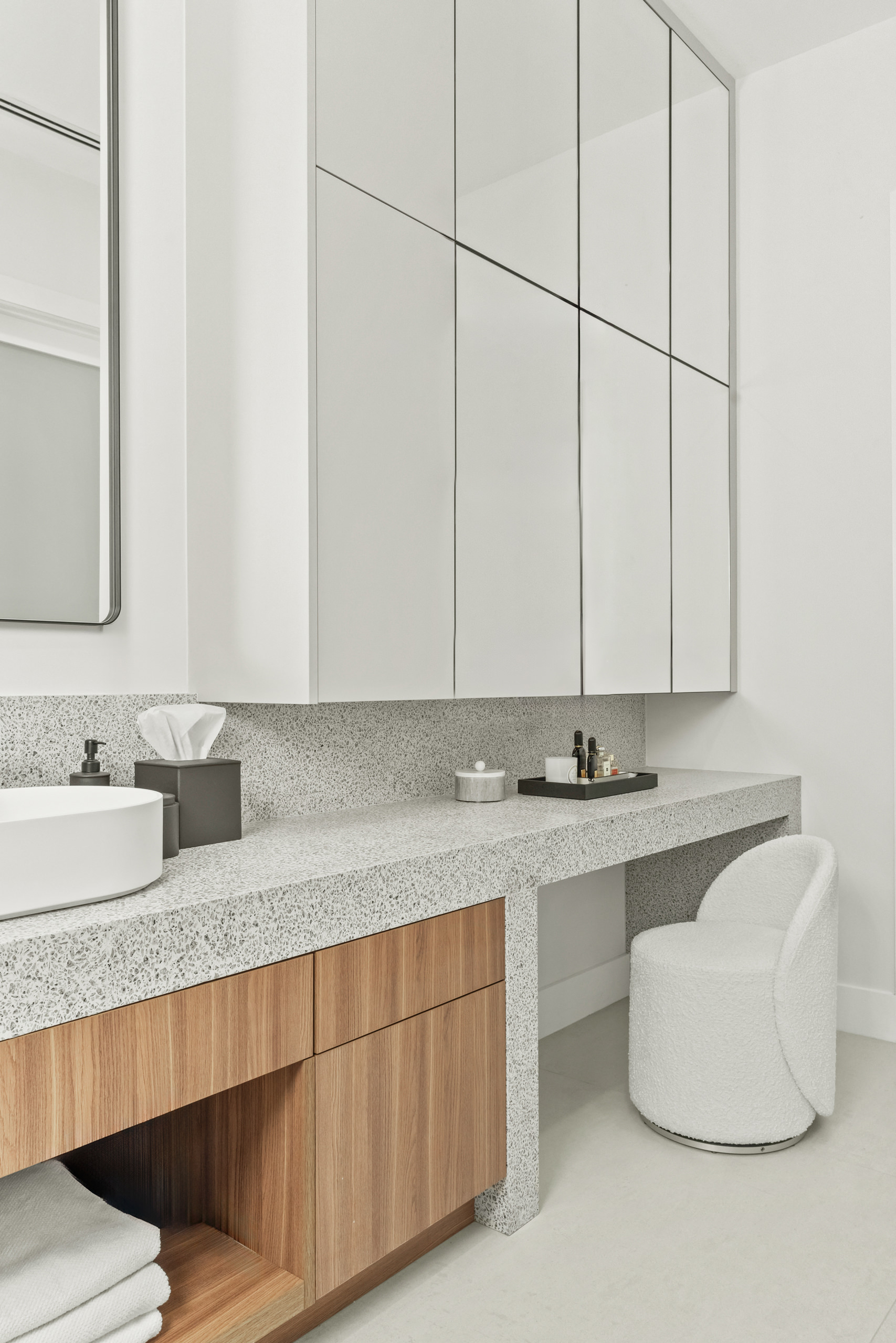 Custom millwork plays a fundamental role in the project’s narrative. Clean lines, integrated solutions, and concealed details maintain a refined aesthetic where visual order reinforces a sense of calm. Storage is thoughtfully hidden, eliminating unnecessary interruptions and supporting a seamless spatial continuity.