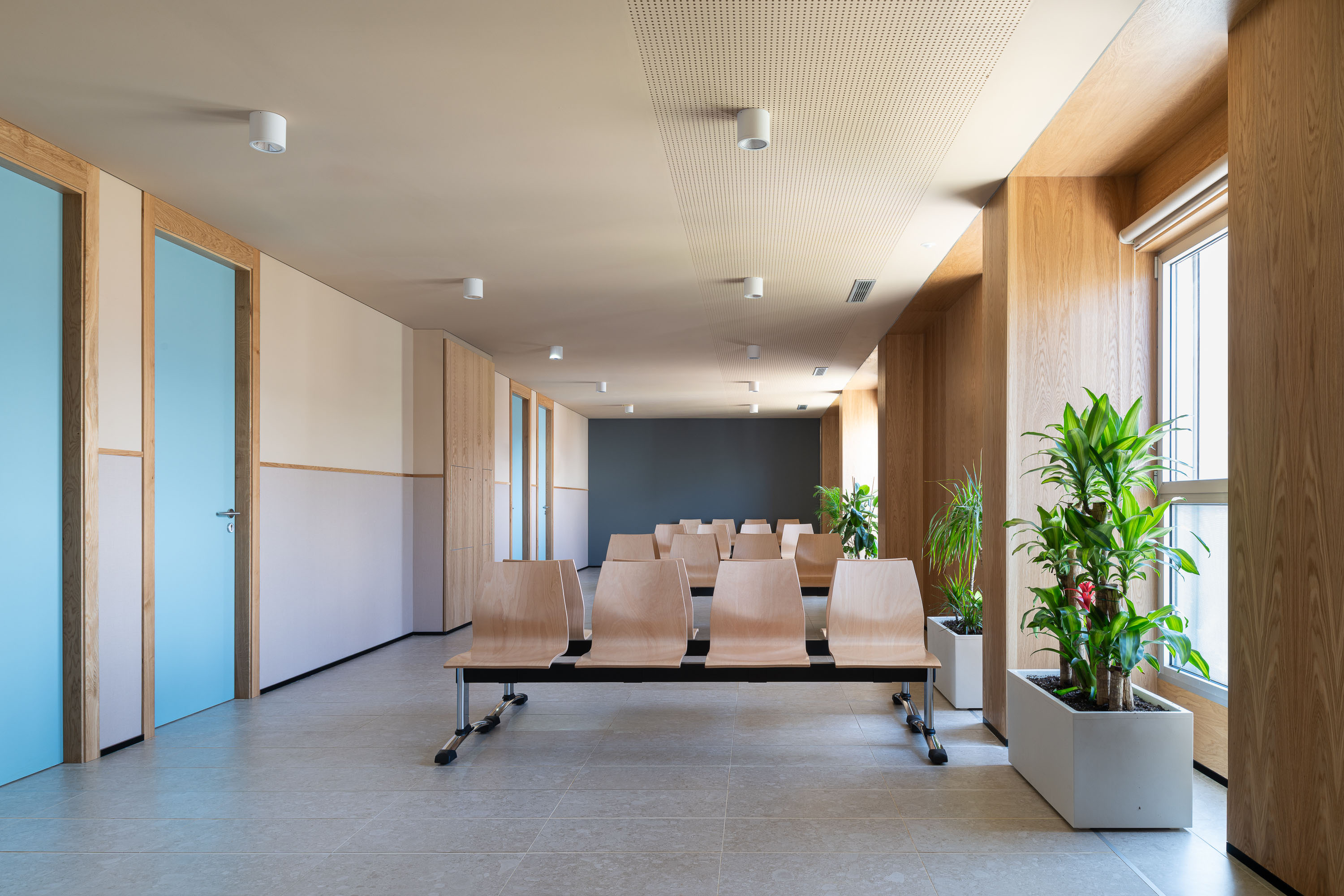 To insert a structure into the urban fabric without noise, yet with clarity, was one of the essential achievements of this project. Originally designed by Ramón Cañas Represa as a social and cultural center, the building spoke a sober and ordered architectural language. Its L-shaped volume, accompanied by a single-storey annex, formed a balanced configuration that once integrated seamlessly with the neighborhood of Pinilla. However, years of abandonment and lack of maintenance had left it in a deteriorated state, requiring not only physical restoration but also a symbolic reclamation. This quiet yet deliberate attitude is reflected in the interior spaces, where functionality coexists with comfort. Natural light filters in generously, guided by a layout that prioritizes user experience. Waiting areas, consultation rooms, and circulation spaces have been designed to foster a sense of calm, privacy, and dignity—essential for both healthcare delivery and human connection.