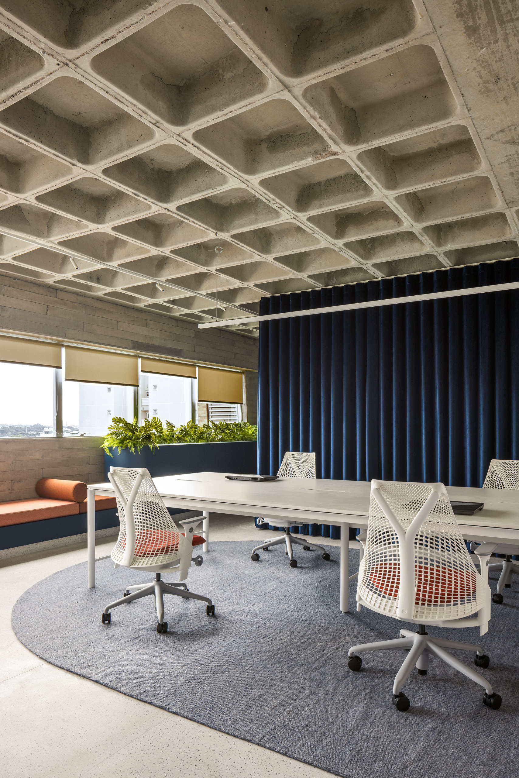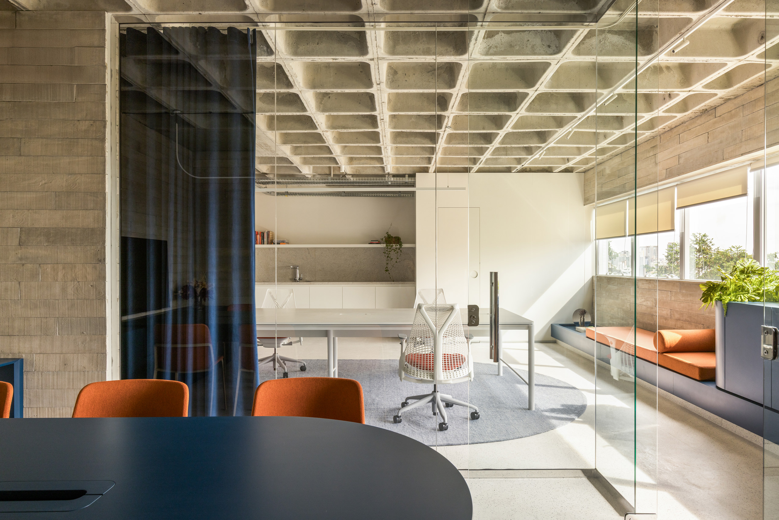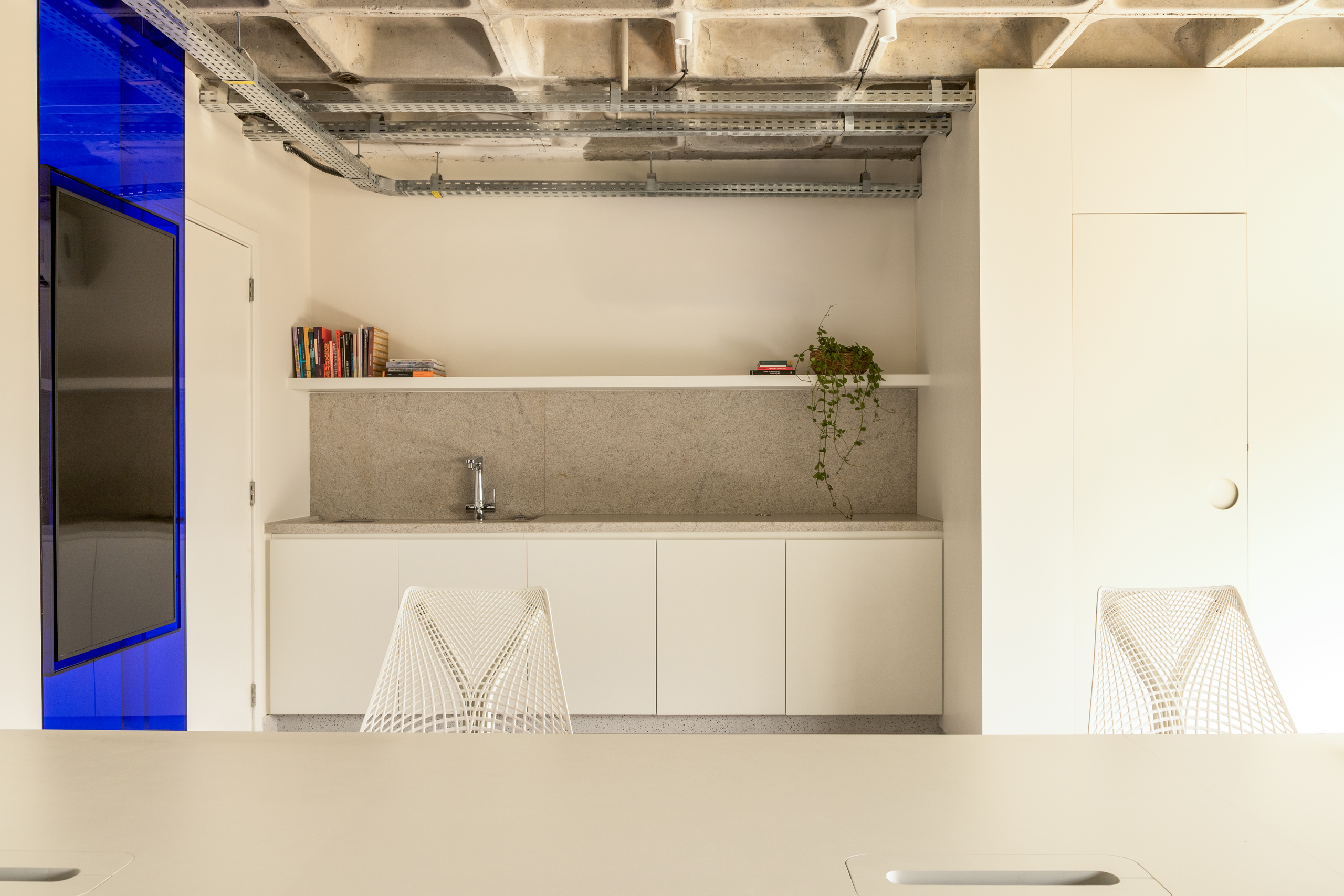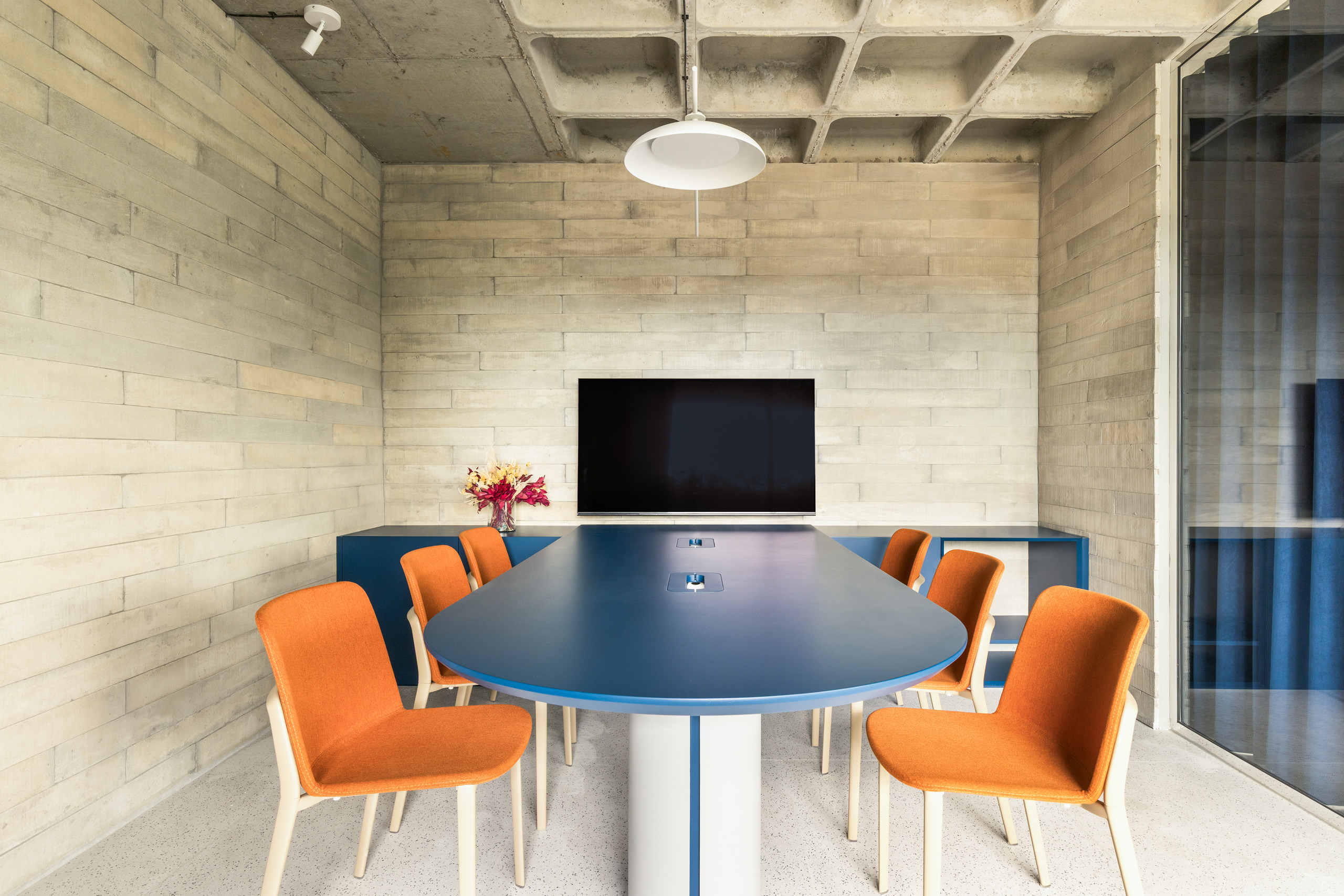 Material restraint defines the overall atmosphere. Appliances and accessories are discreetly built in, preserving visual continuity and calm. Within this quiet palette, blue emerges as a unifying element, most notably in the velvet curtain that envelops the meeting room—an intervention that introduces both softness and symbolic depth.