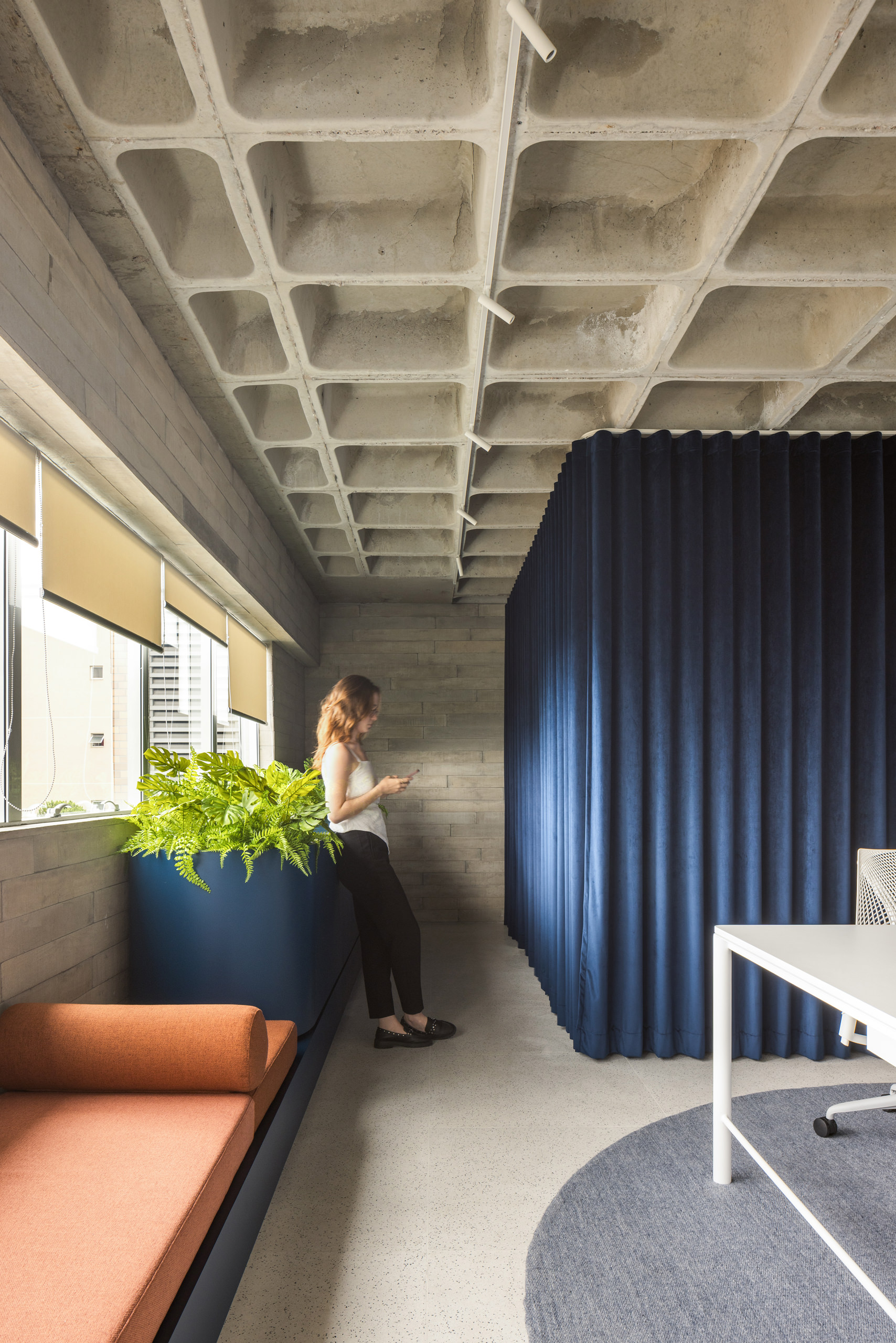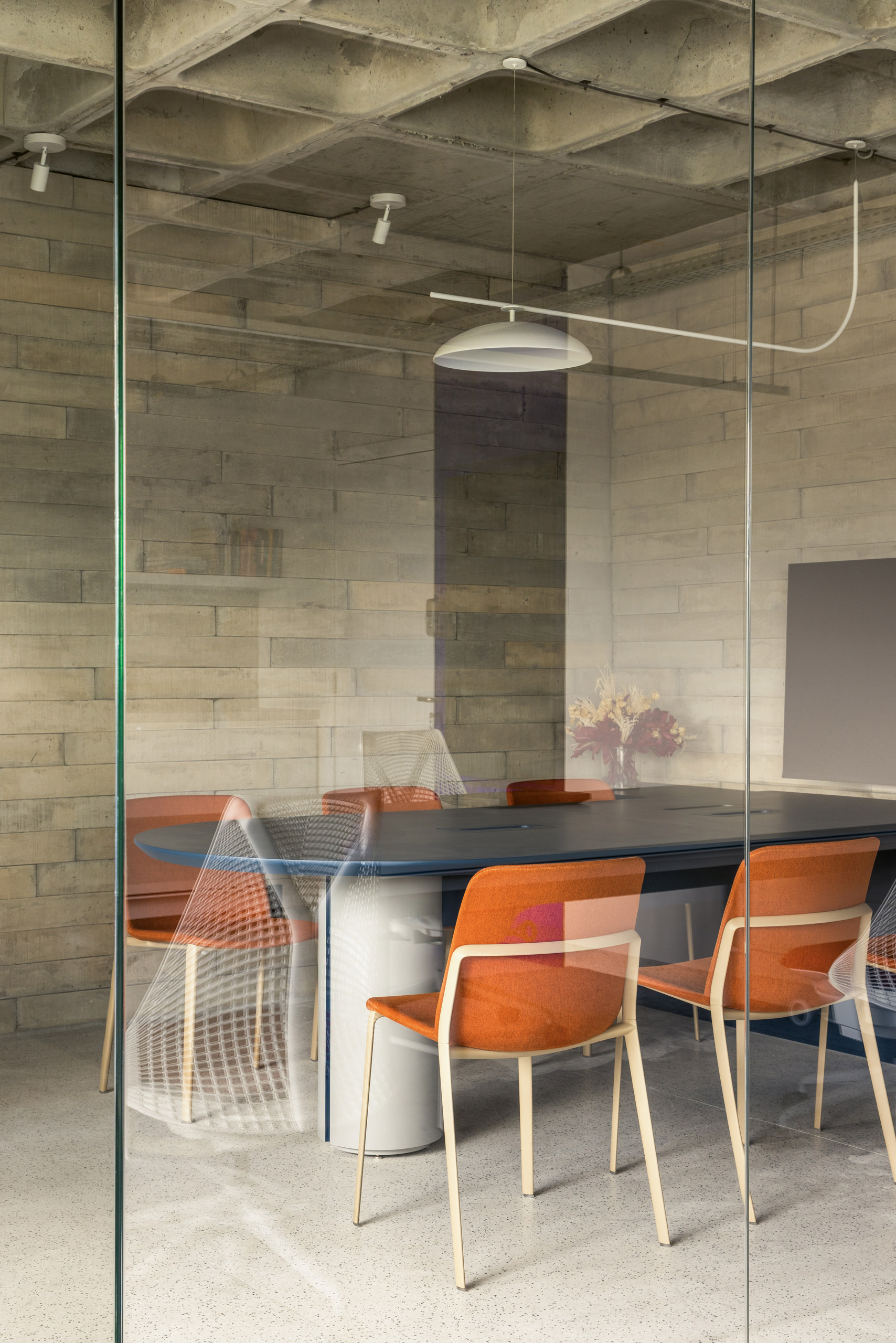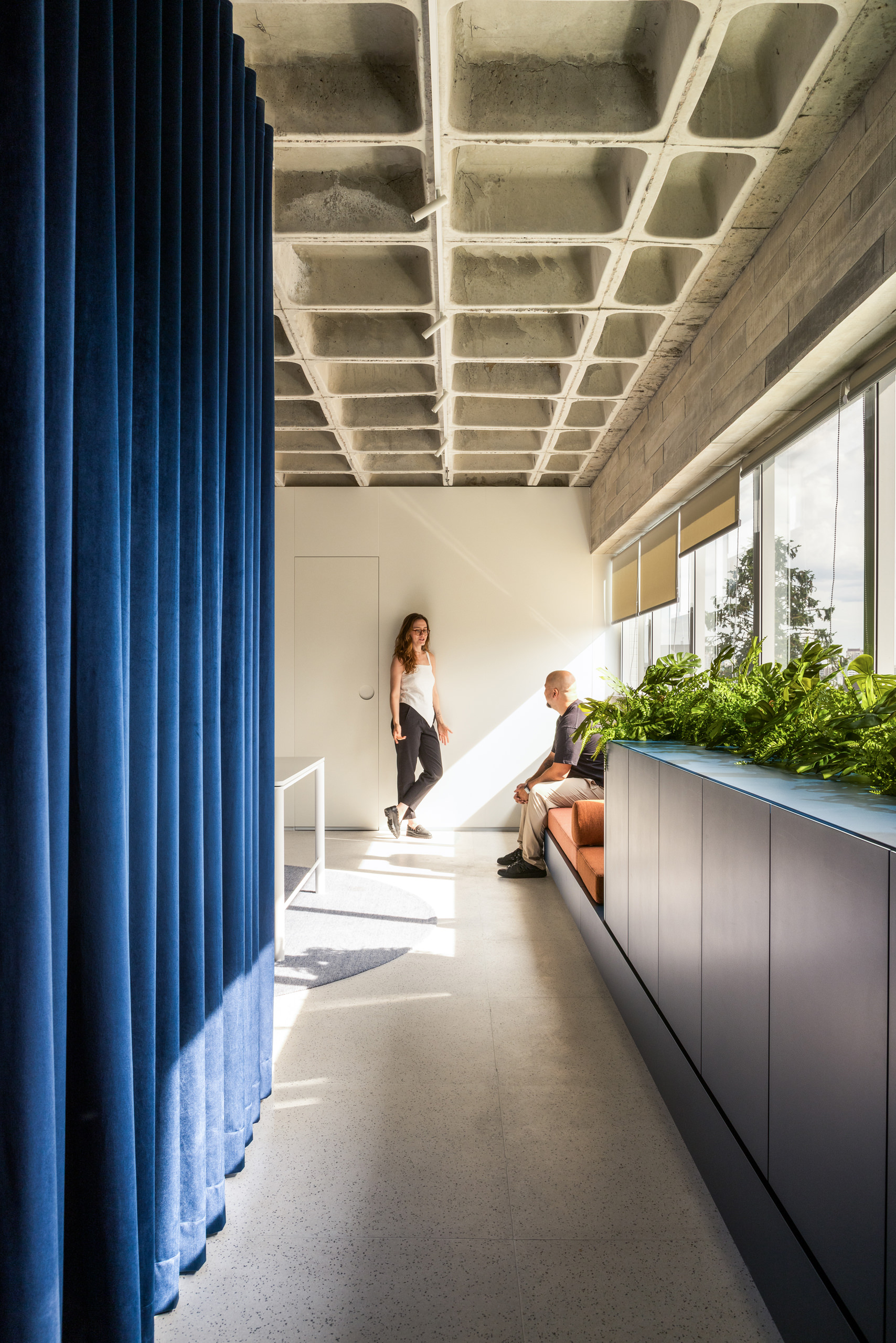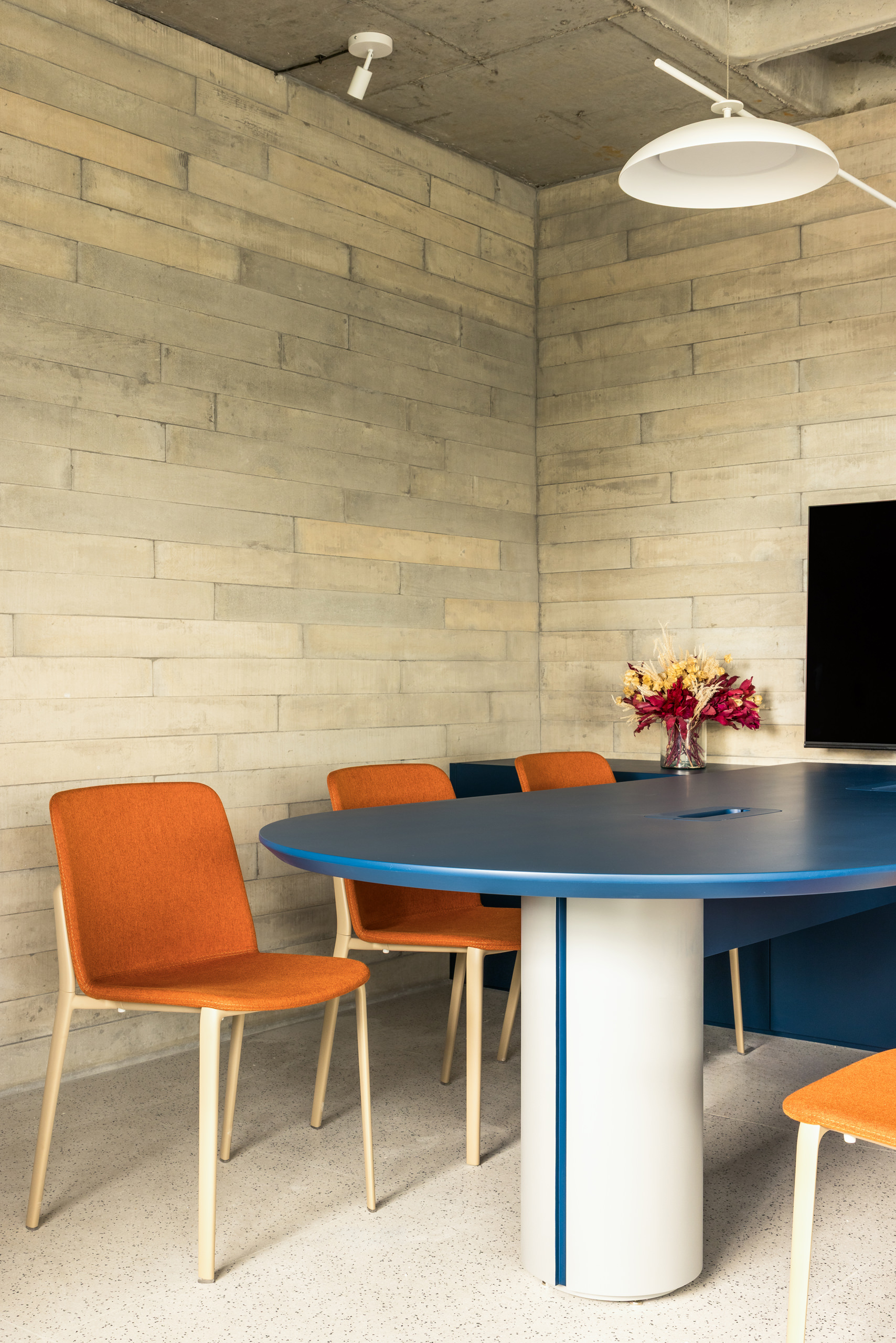 Material restraint defines the overall atmosphere. Appliances and accessories are discreetly built in, preserving visual continuity and calm. Within this quiet palette, blue emerges as a unifying element, most notably in the velvet curtain that envelops the meeting room—an intervention that introduces both softness and symbolic depth.