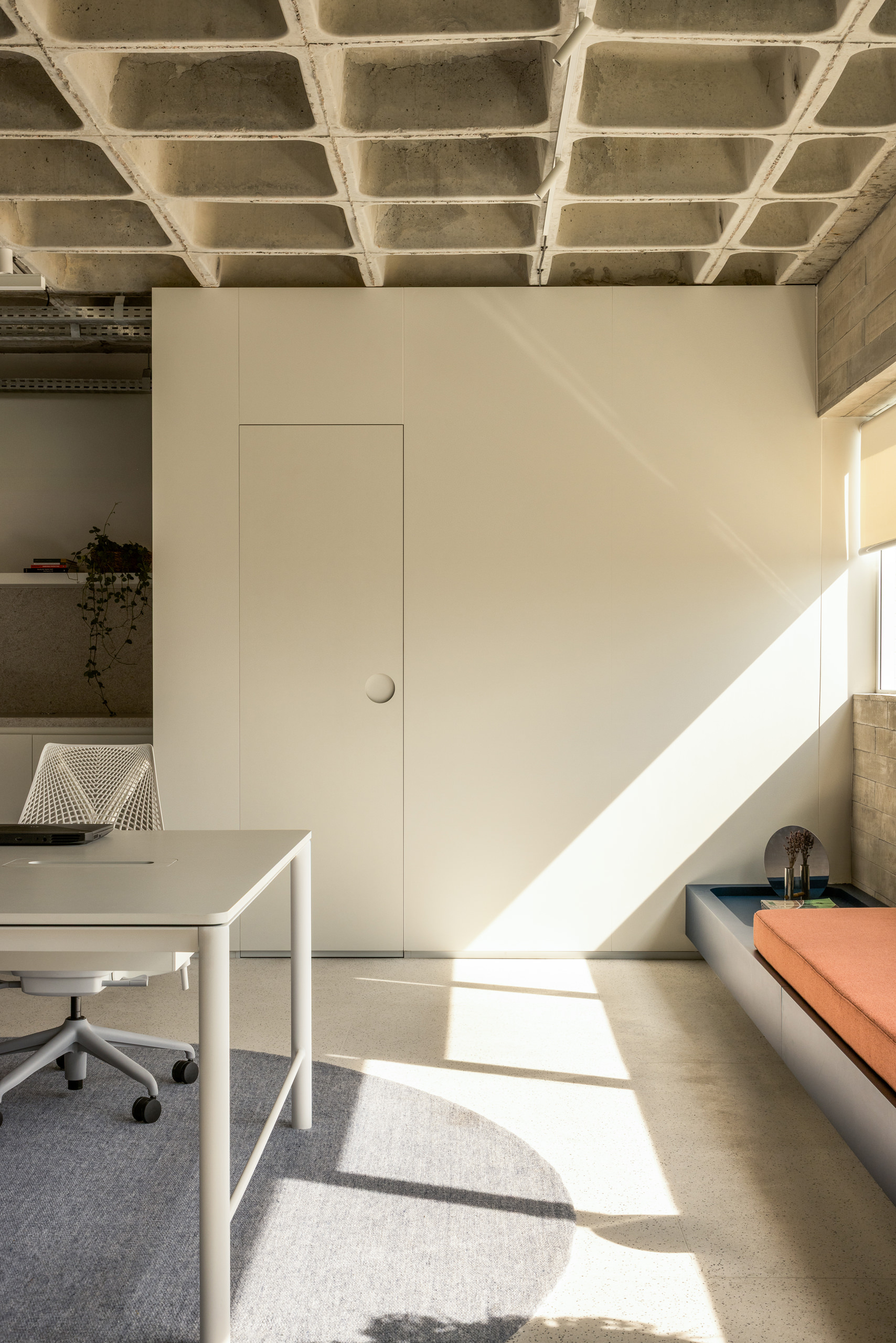 Towards the opposite end, the spatial tone becomes more introspective. Here, the furniture responds to the need for focus and privacy, creating a quieter environment suited to concentrated work. Between these two conditions, an integrated planter introduces greenery into the interior, reinforcing biophilic principles and enhancing well-being in the absence of a balcony.