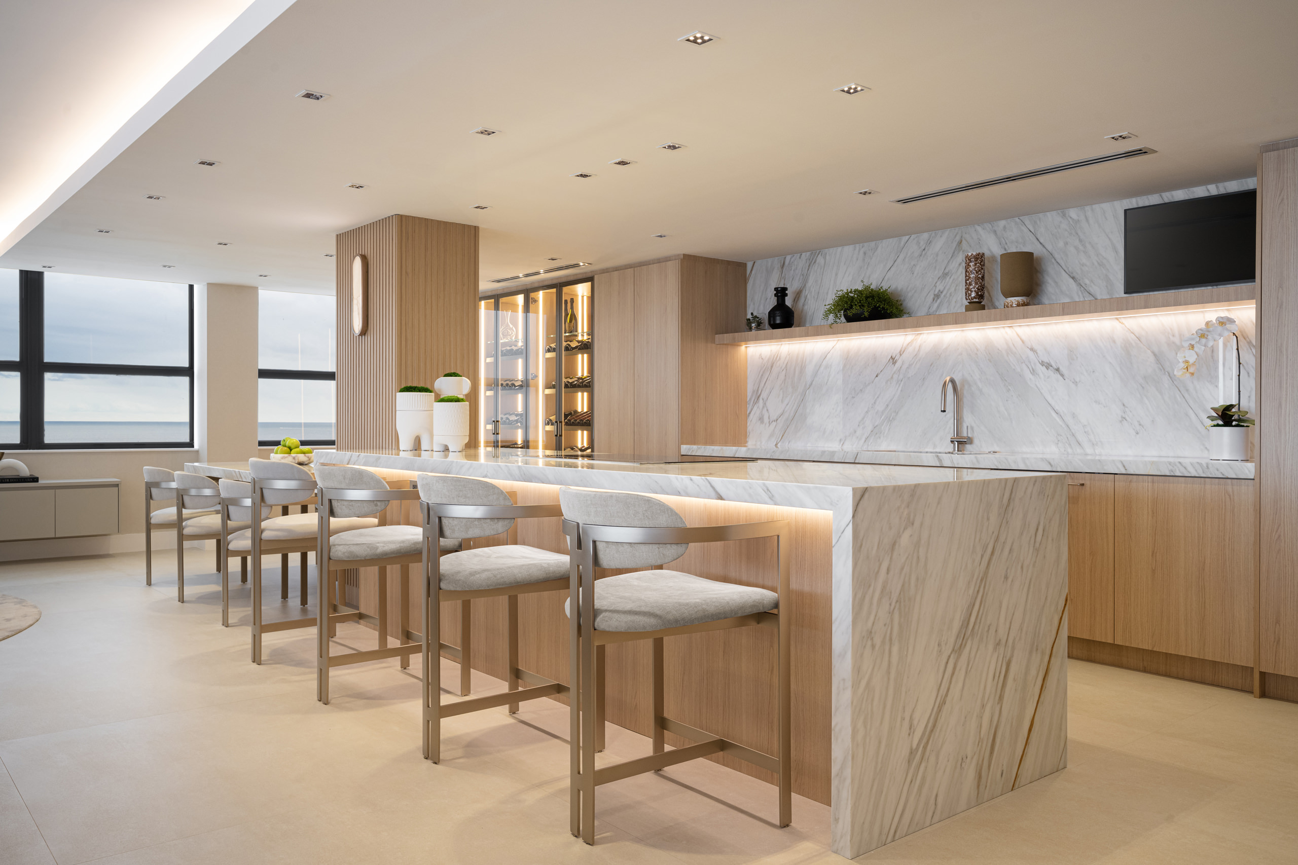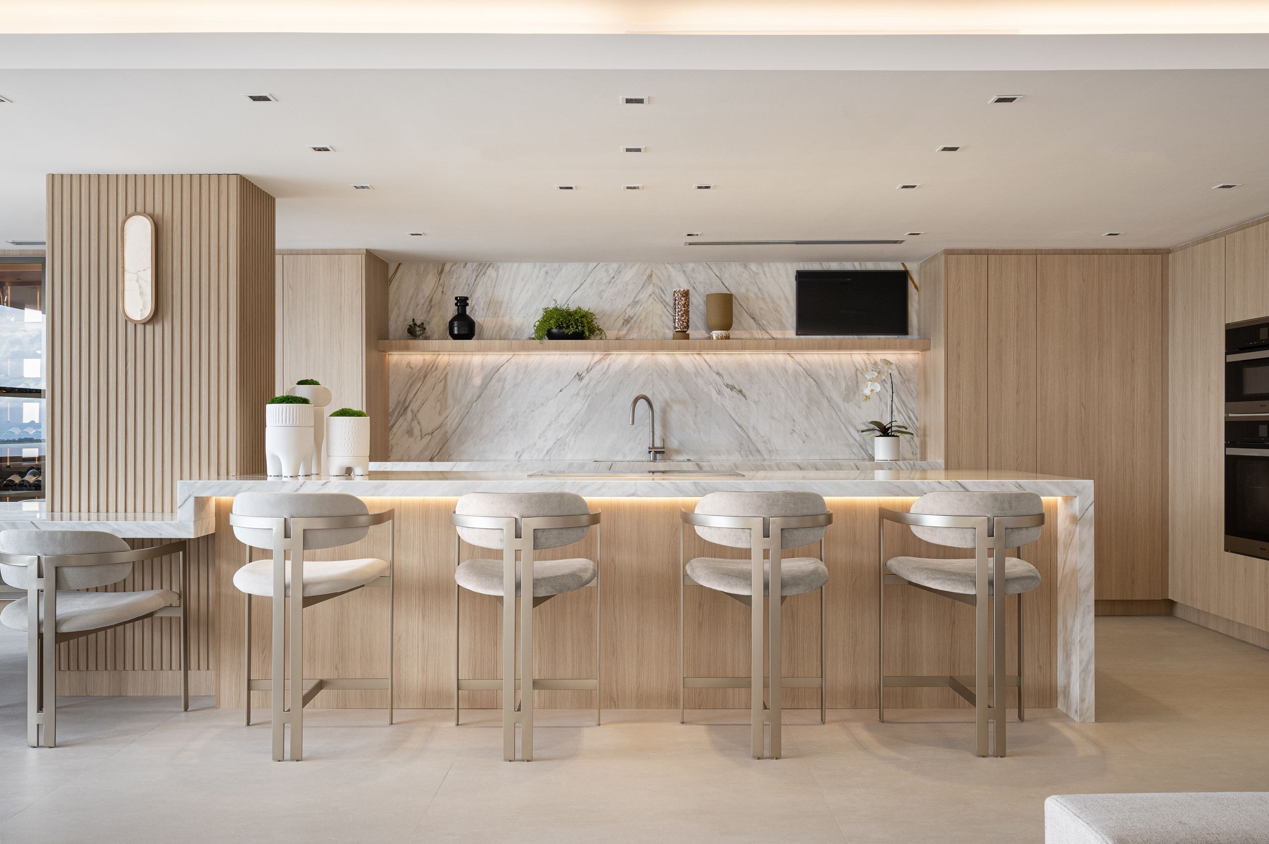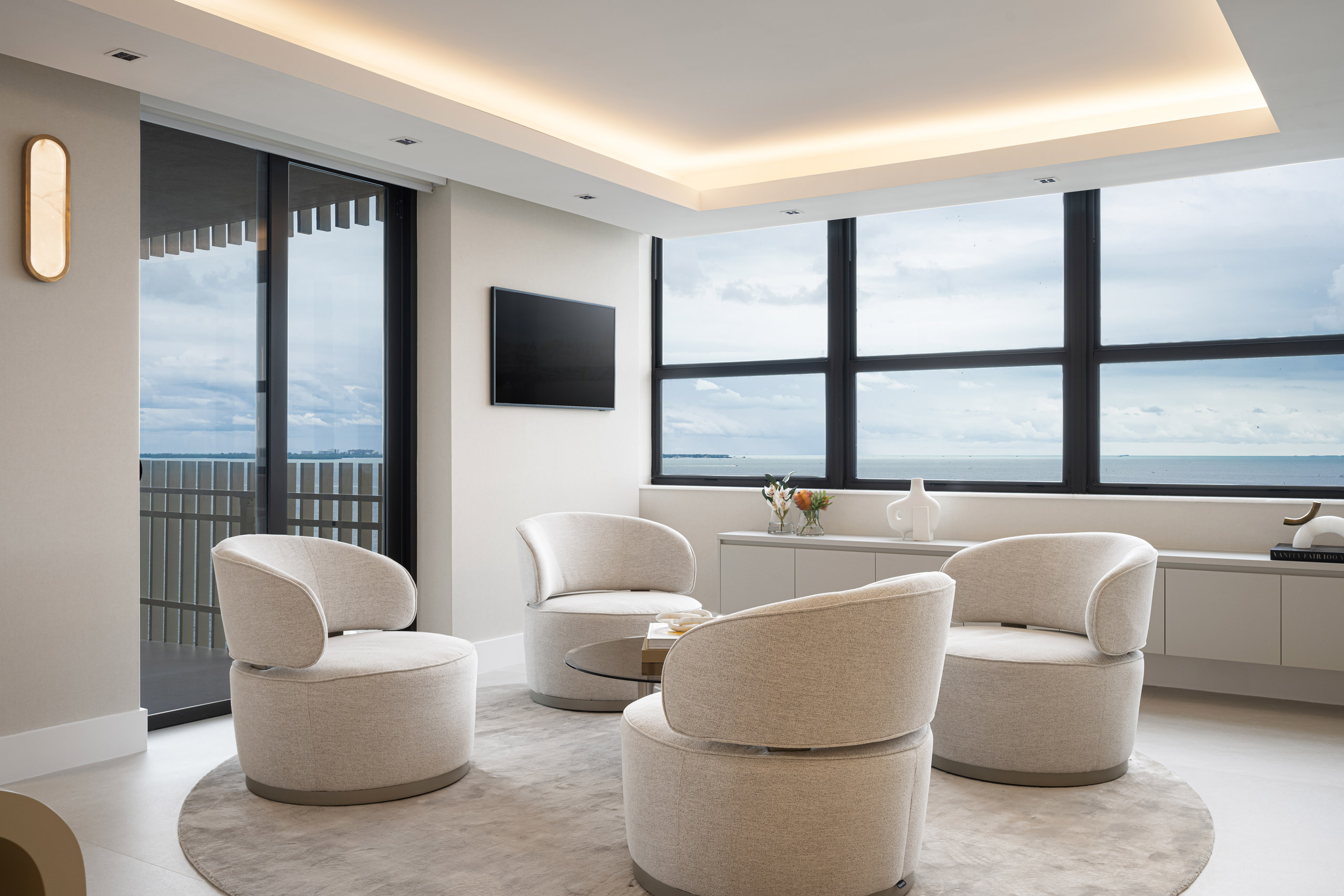 The client’s vision for Grove Isle was one of serenity—an apartment that would transcend mere function to become a living sanctuary. Bea Interiors approached the project with sensitivity and precision, translating this vision into a design language defined by stillness and subtlety. The goal was not to impose, but to reveal—a home that feels grounded, luminous, and deeply connected to its coastal setting. Open and cohesive, each space flows into the next, ensuring that the expansive water views remain the heart of the experience. The surrounding water became both muse and medium. Its soft movement and reflected light informed the apartment’s tonal palette and spatial rhythm. Bea Interiors chose neutral hues and layered textures to mirror the calm fluidity of the landscape. Warm woods, soft limestone, and veined marble establish a tactile connection to nature, while custom millwork adds sculptural precision. Each element—whether a hand-finished surface or a carefully placed curve—anchors the interior in the organic poetry of its environment.