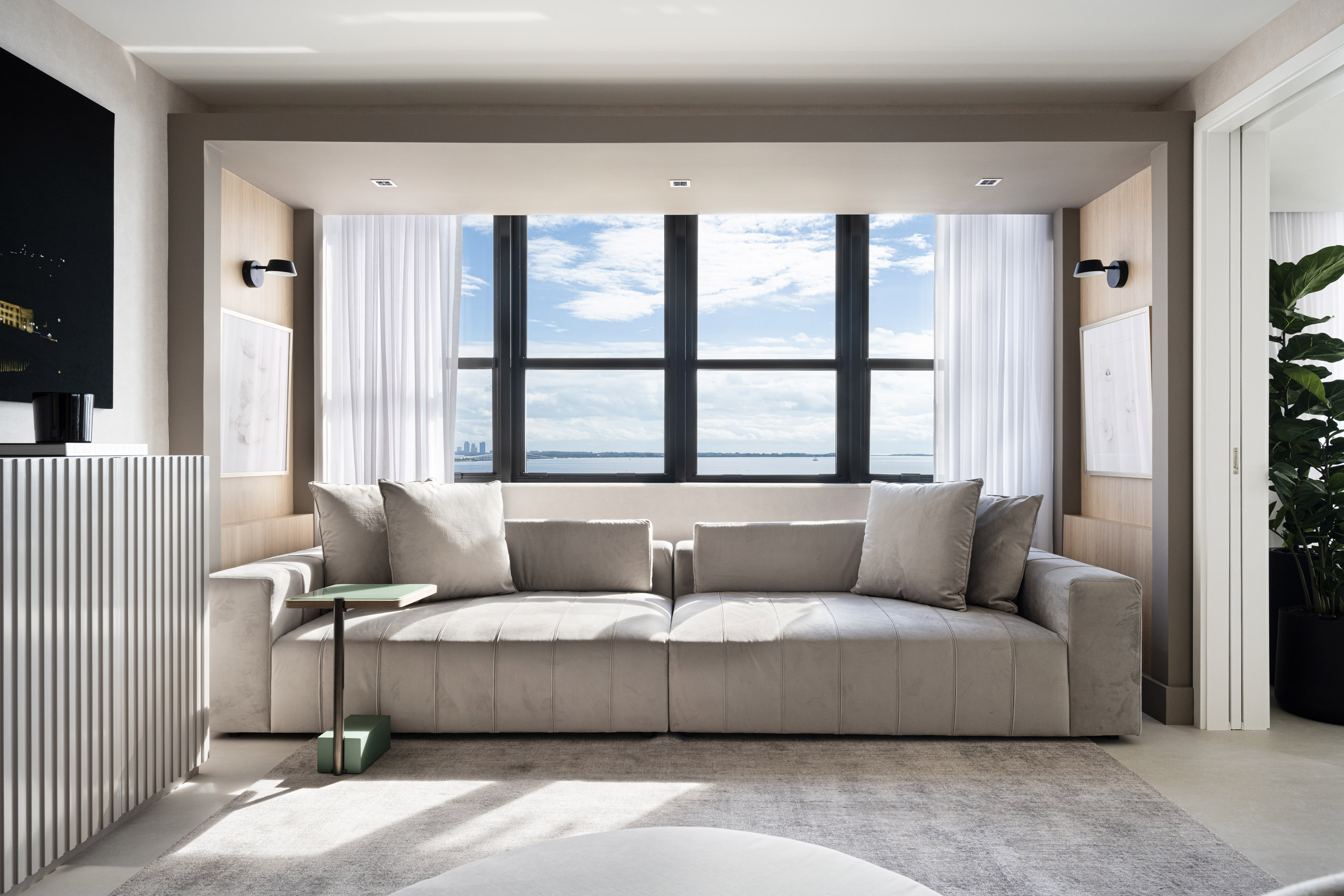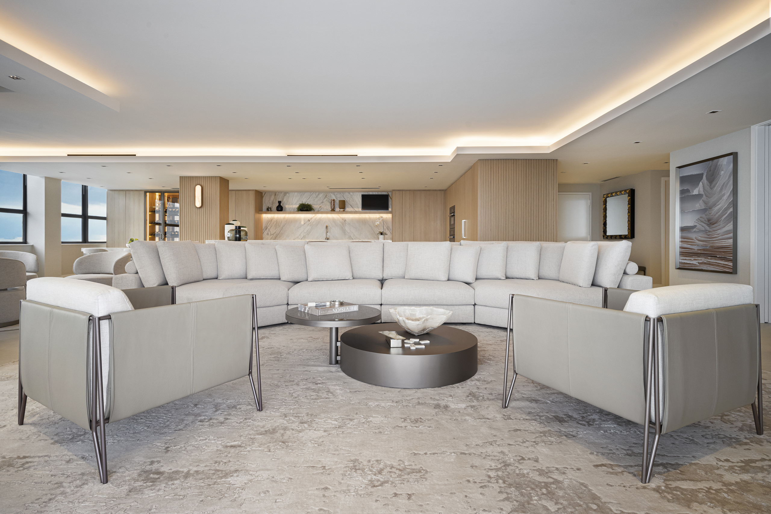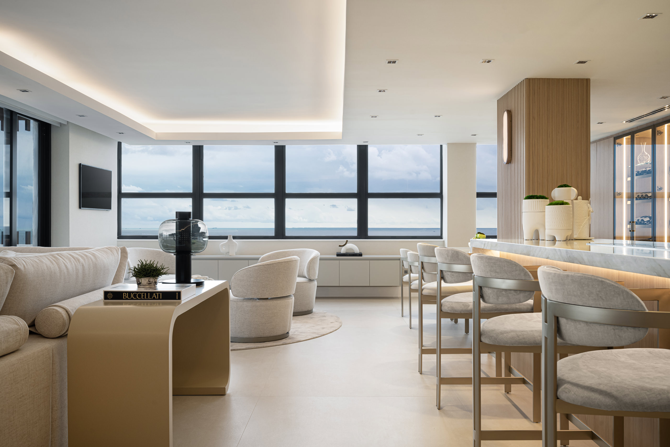 The client’s vision for Grove Isle was one of serenity—an apartment that would transcend mere function to become a living sanctuary. Bea Interiors approached the project with sensitivity and precision, translating this vision into a design language defined by stillness and subtlety. The goal was not to impose, but to reveal—a home that feels grounded, luminous, and deeply connected to its coastal setting. Open and cohesive, each space flows into the next, ensuring that the expansive water views remain the heart of the experience. The surrounding water became both muse and medium. Its soft movement and reflected light informed the apartment’s tonal palette and spatial rhythm. Bea Interiors chose neutral hues and layered textures to mirror the calm fluidity of the landscape. Warm woods, soft limestone, and veined marble establish a tactile connection to nature, while custom millwork adds sculptural precision. Each element—whether a hand-finished surface or a carefully placed curve—anchors the interior in the organic poetry of its environment.