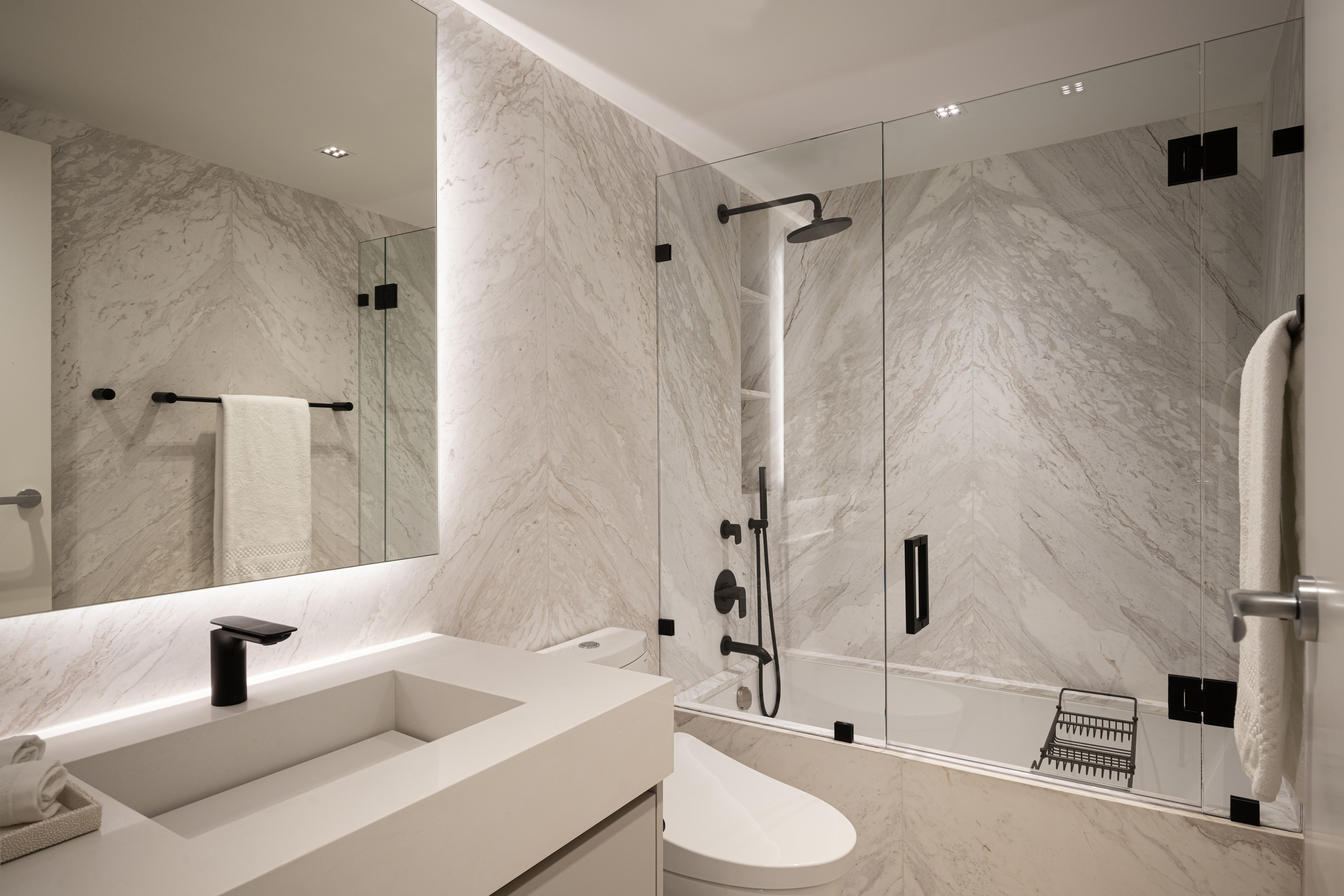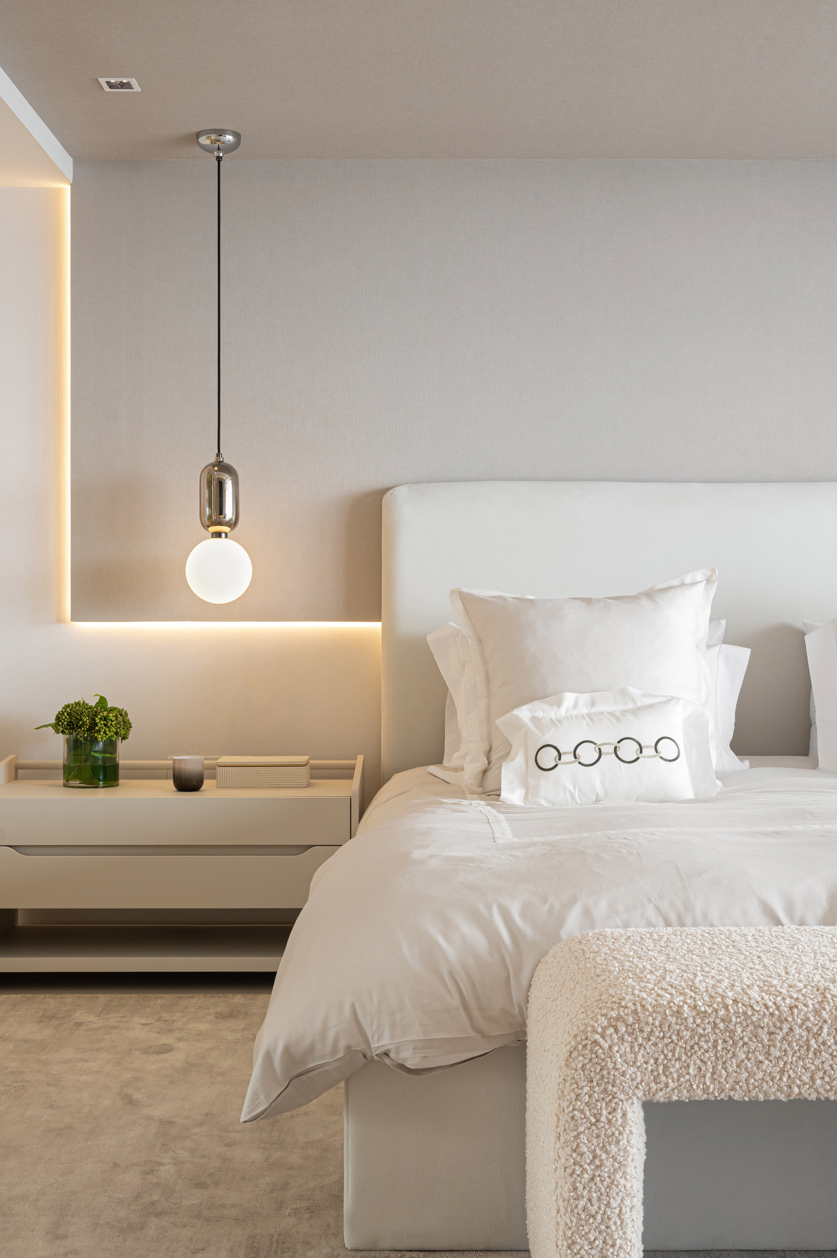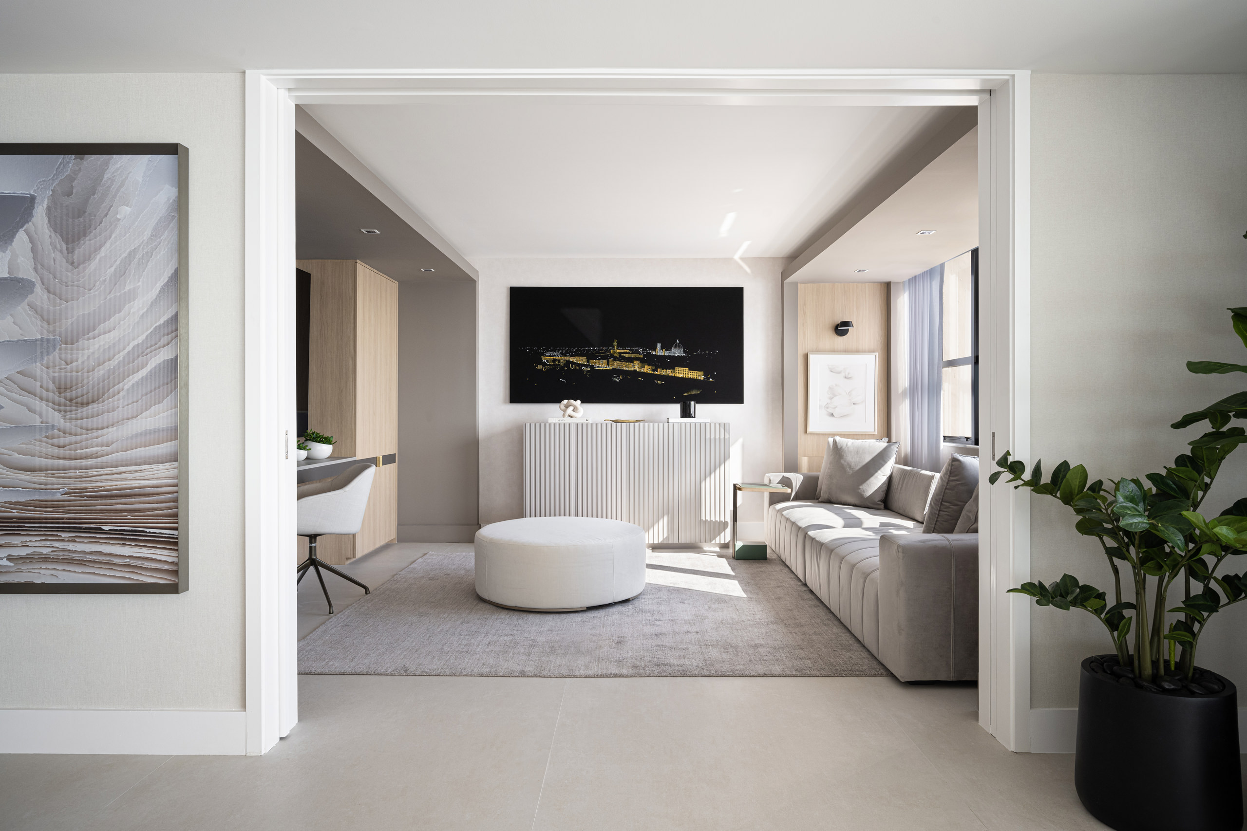 Custom millwork threads continuity through the apartment, uniting each space with quiet sophistication. A fully integrated wine display stands as both art and utility, while concealed storage walls double as architectural statements. In the kitchen, a monolithic marble island appears weightless under soft lighting, blending utility with sculpture. Bedrooms feature floating nightstands and built-in lighting that maintain visual purity. Each design solution—whether functional or decorative—was conceived to enhance daily life while preserving the home’s understated aesthetic. The craftsmanship reflects a dialogue between restraint and richness, where every joint, curve, and finish feels intentional.