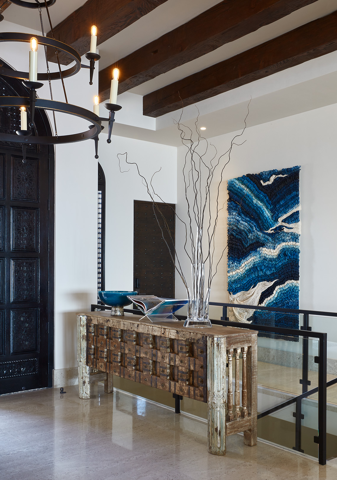 The living areas are spacious and open, featuring high ceilings and large windows that frame the spectacular landscape. Dark wood accents and vibrant textiles add depth and character to the neutral palette.