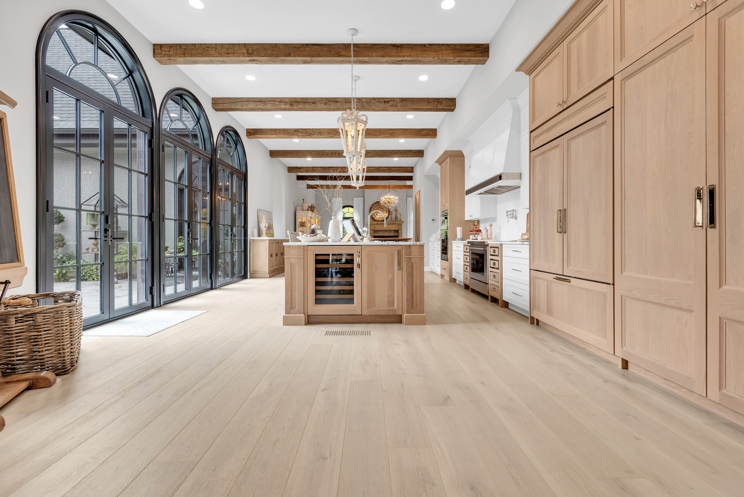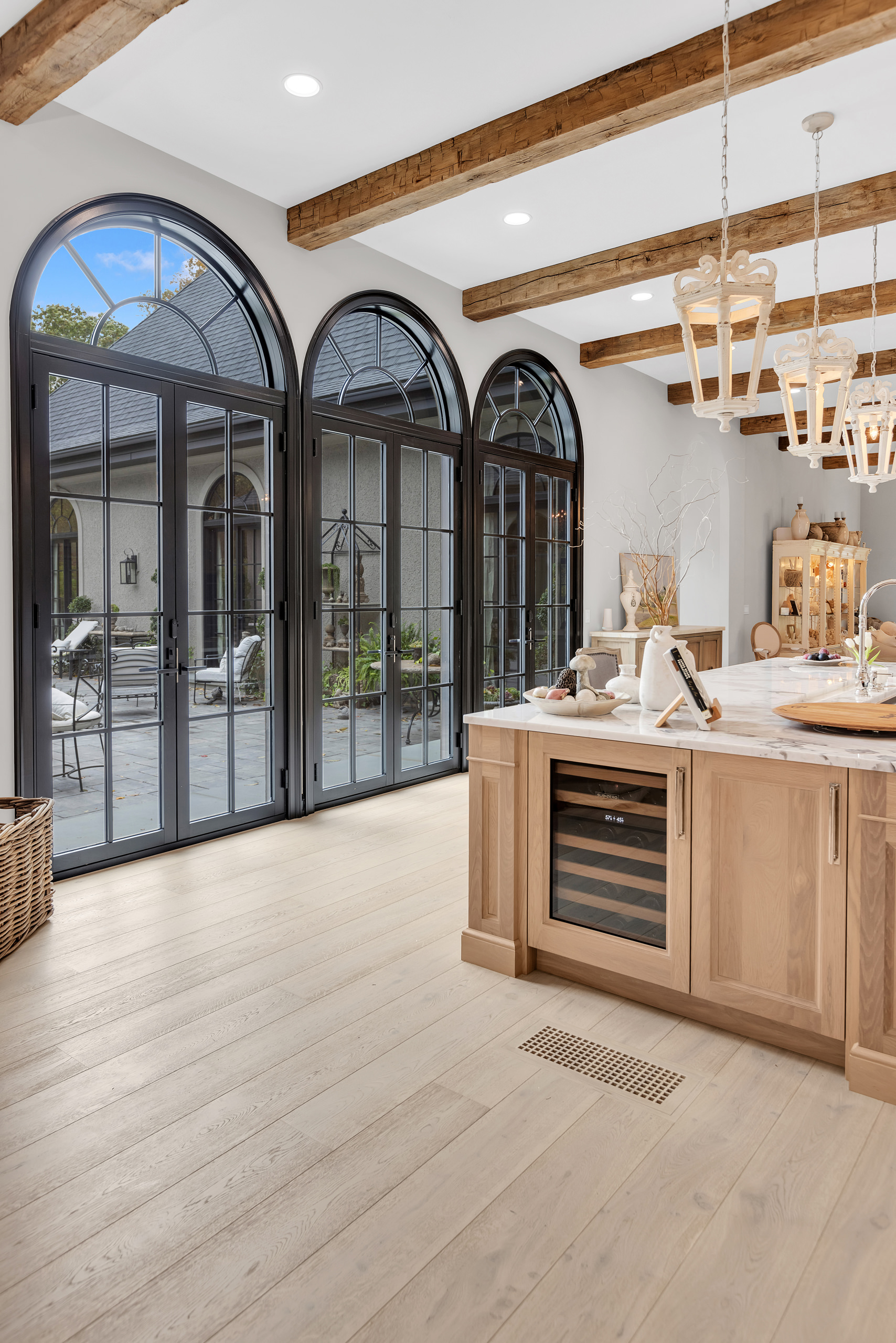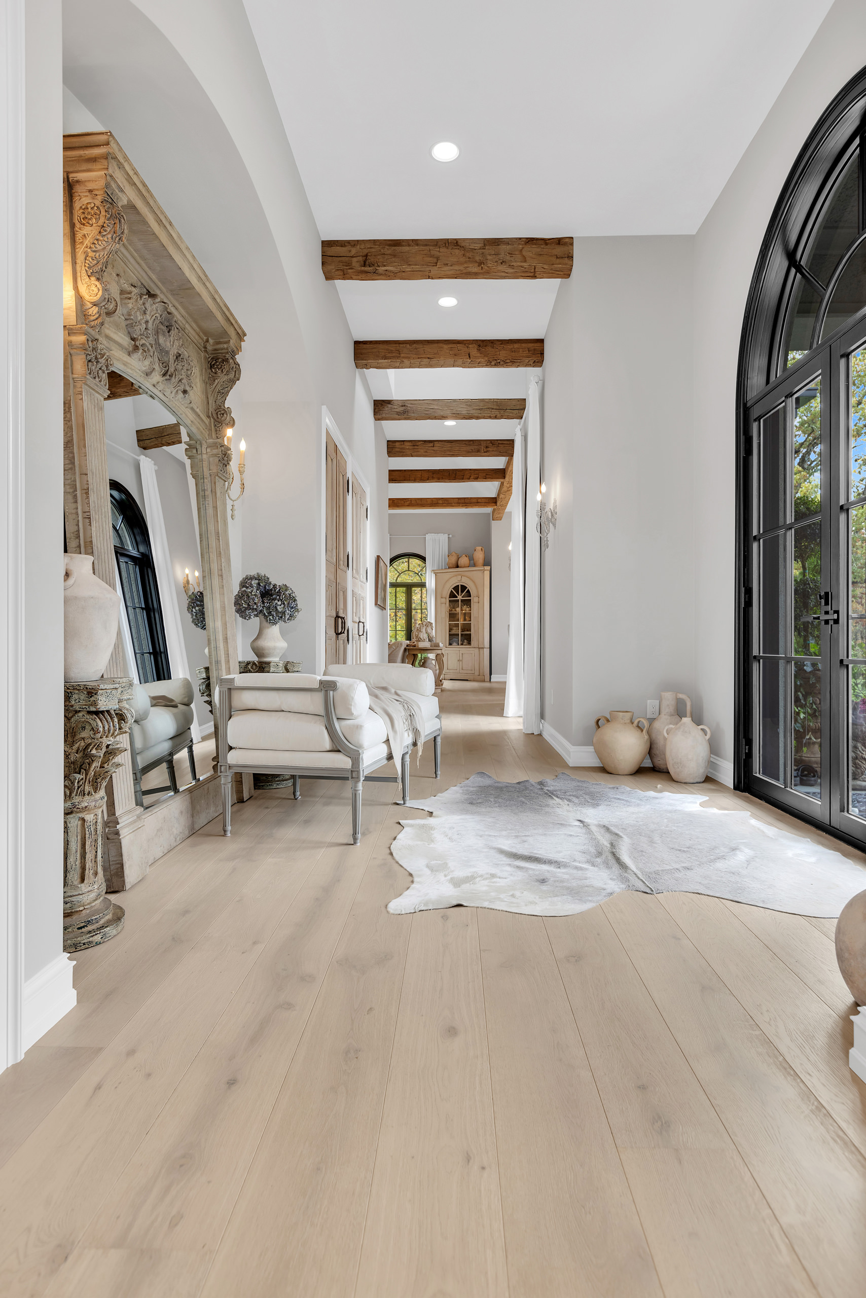 Architecturally, Thompson Hill is articulated through a series of carefully considered elements that lend depth and character. Arched openings establish a rhythmic progression between rooms, referencing Mediterranean precedents while softening spatial transitions. Exposed wooden beams introduce texture overhead, offering a warm counterpoint to the light-toned surfaces that define the interior envelope. Contrasting these softer gestures, black-framed arched windows and doors provide a graphic clarity that anchors the design. These elements frame views to the garden with precision, acting as visual thresholds that heighten the relationship between inside and out. Generous yet controlled ceiling heights further contribute to the home’s atmosphere—spacious without becoming monumental, intimate without feeling confined.