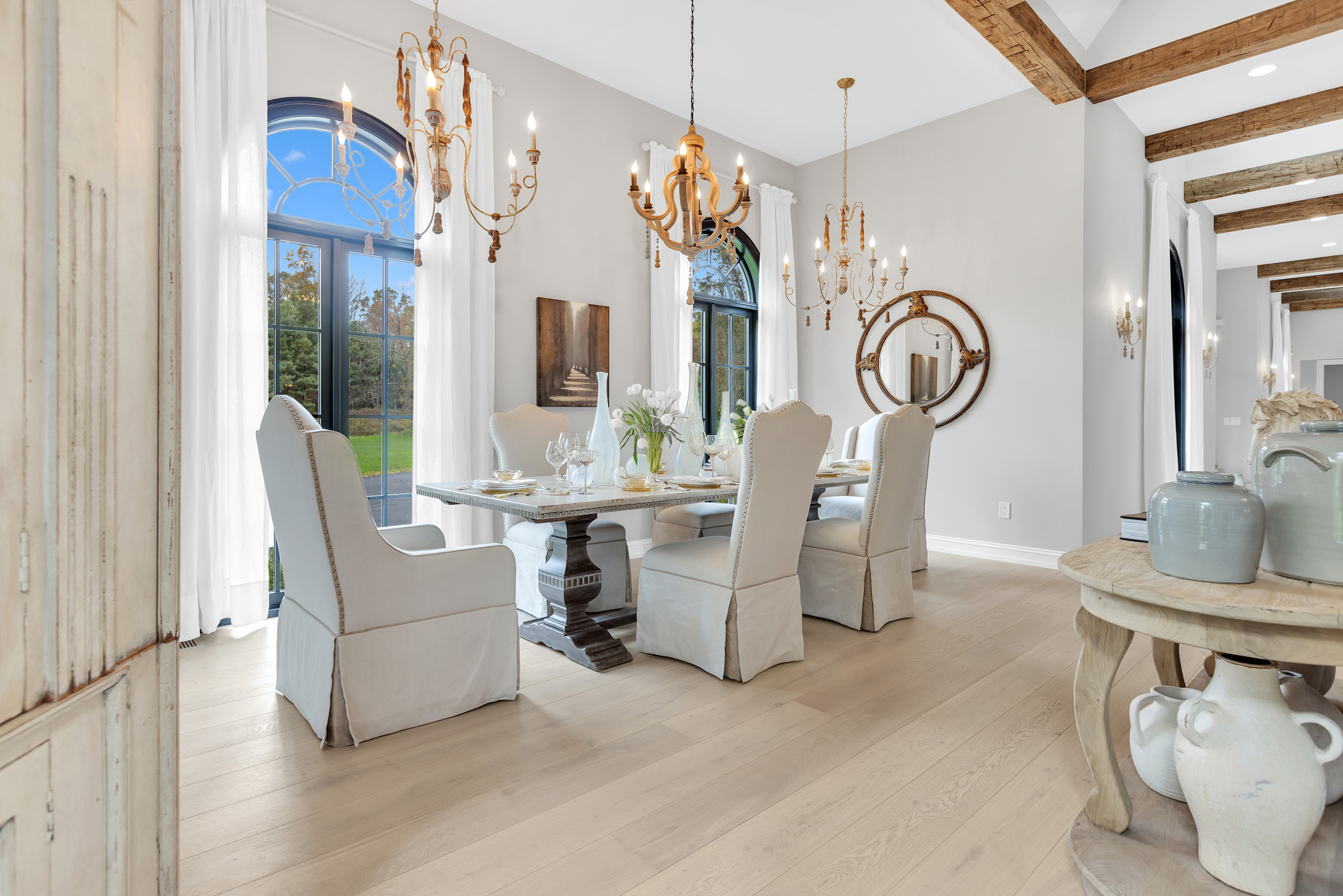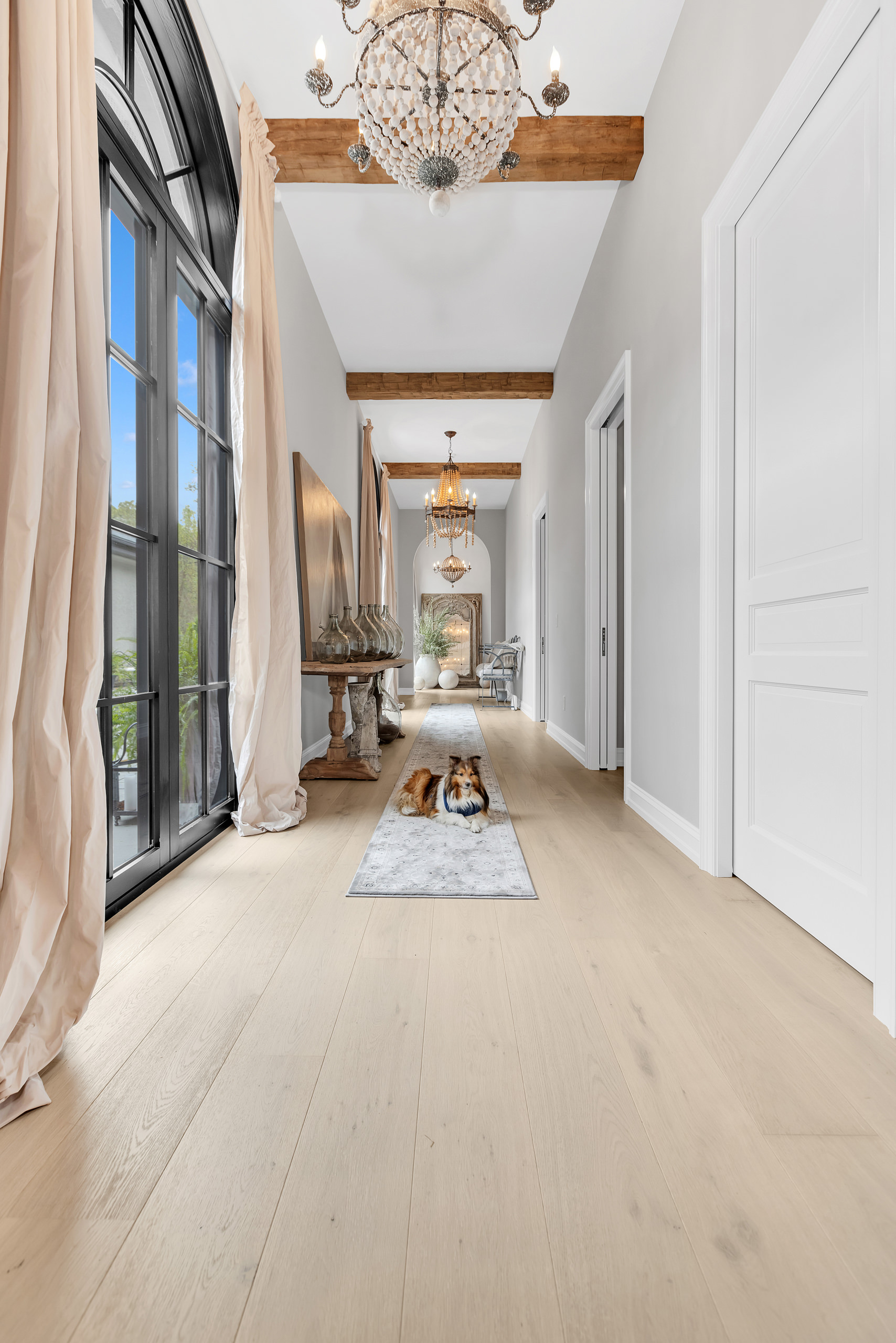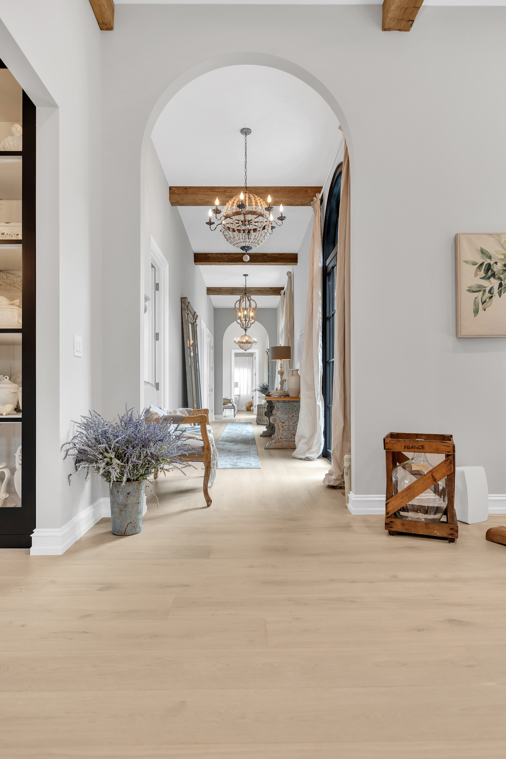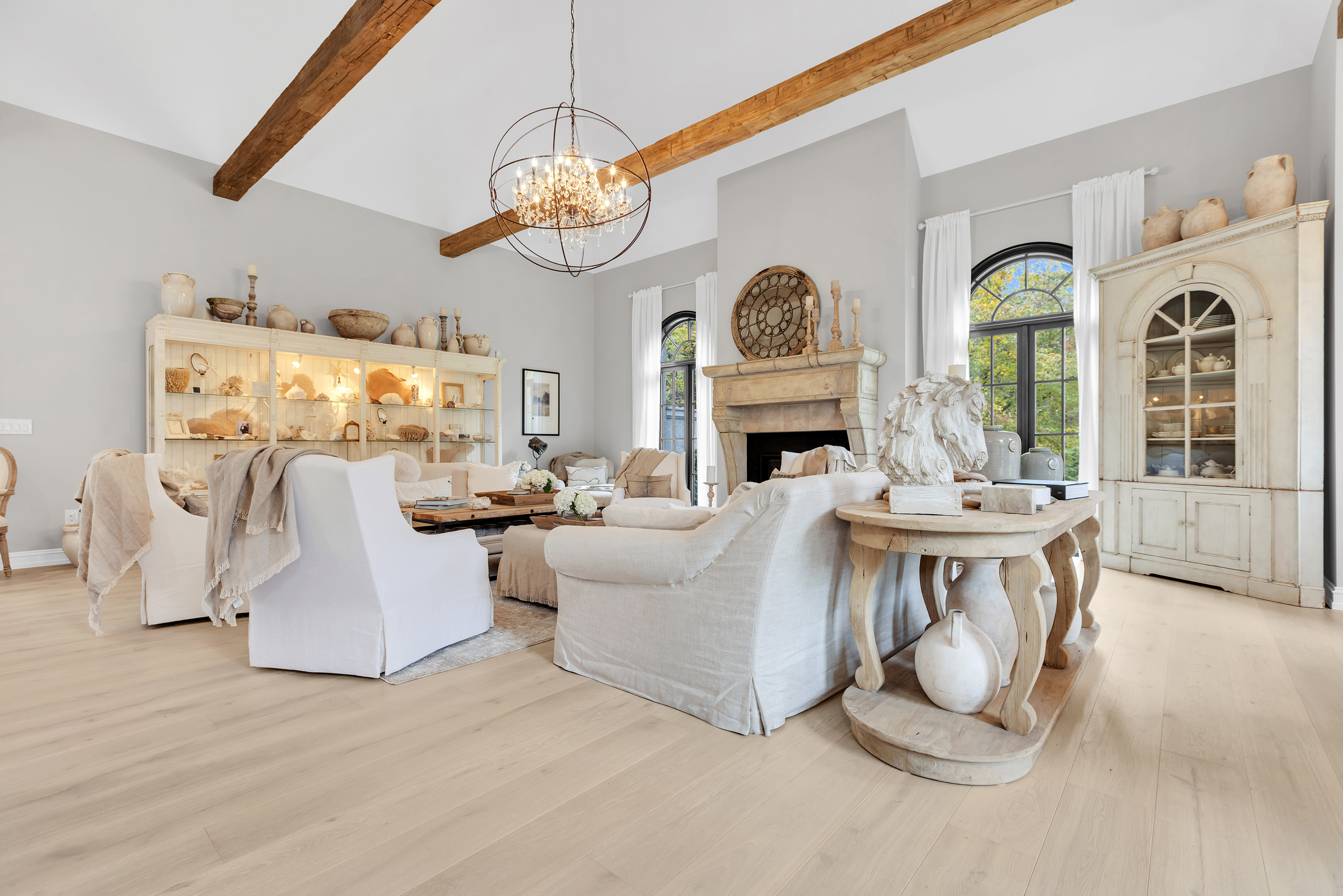 Architecturally, Thompson Hill is articulated through a series of carefully considered elements that lend depth and character. Arched openings establish a rhythmic progression between rooms, referencing Mediterranean precedents while softening spatial transitions. Exposed wooden beams introduce texture overhead, offering a warm counterpoint to the light-toned surfaces that define the interior envelope. Contrasting these softer gestures, black-framed arched windows and doors provide a graphic clarity that anchors the design. These elements frame views to the garden with precision, acting as visual thresholds that heighten the relationship between inside and out. Generous yet controlled ceiling heights further contribute to the home’s atmosphere—spacious without becoming monumental, intimate without feeling confined.