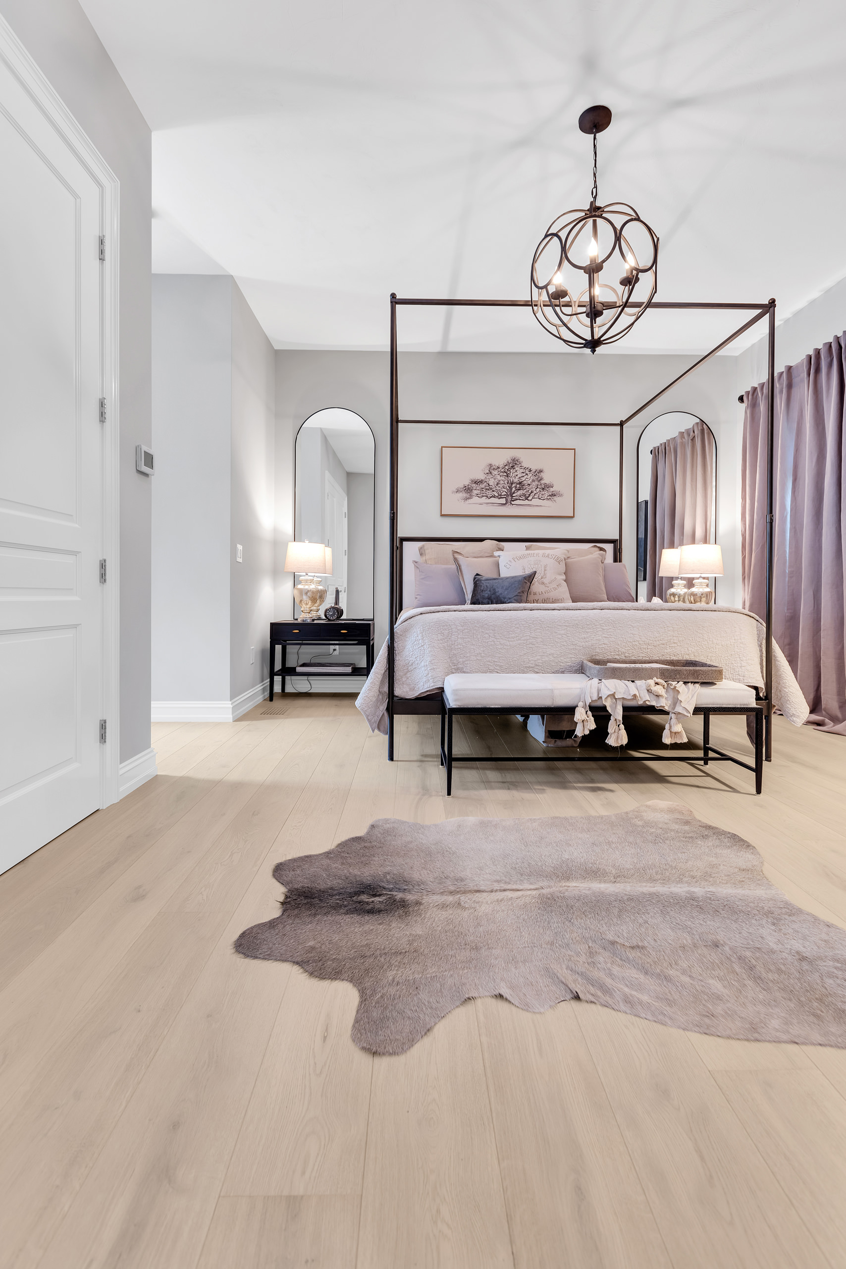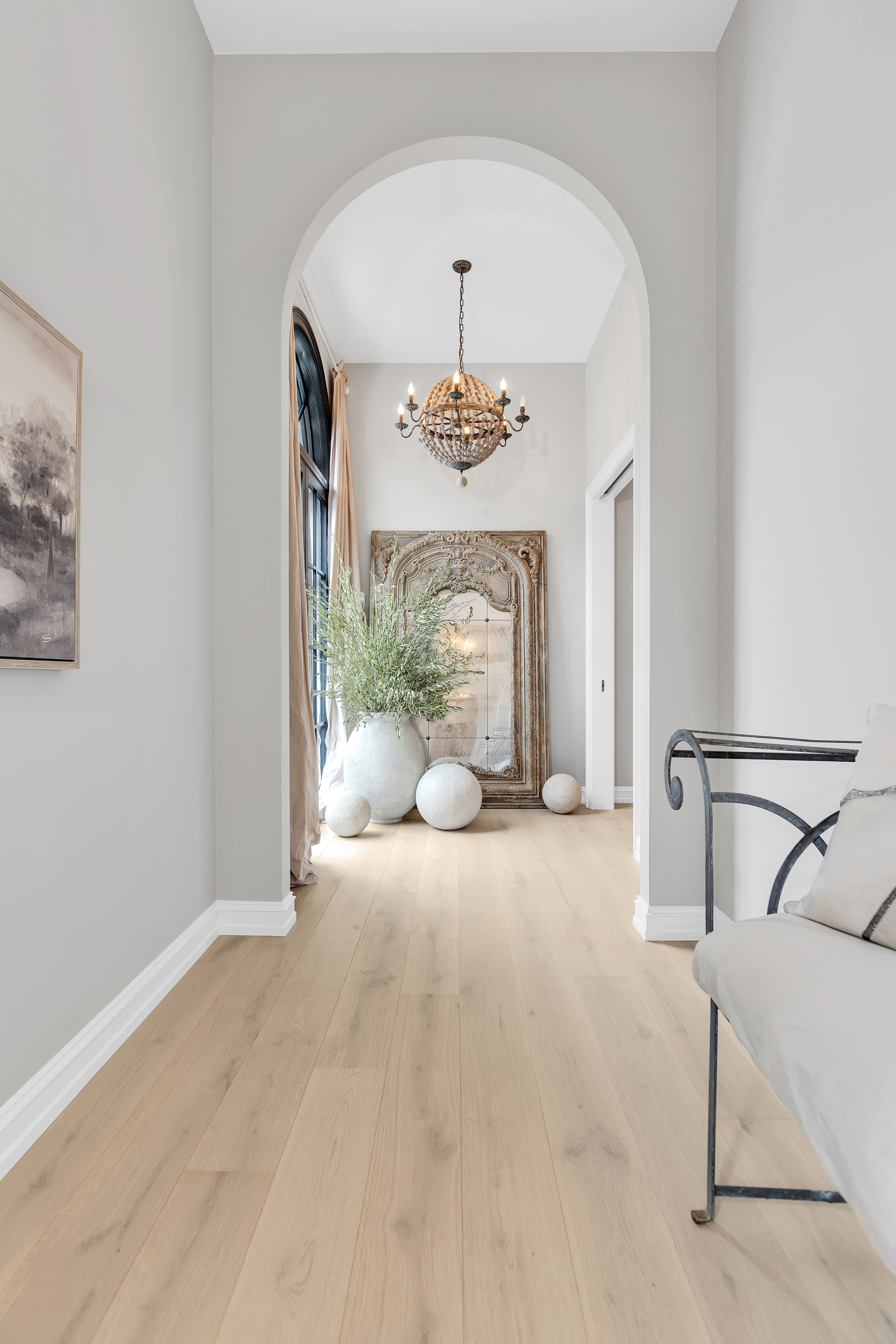 A defining element of the project is the flooring, supplied by RIVA Spain, which operates not as a background feature but as a unifying presence. The engineered hardwood planks—crafted from 100% European white oak—run uninterrupted throughout the home, establishing a continuous visual and tactile base. From entry to private quarters, the floor becomes a quiet thread that ties the entire spatial experience together. Selected from the RIVA Elite collection in the Pearl tone, the flooring introduces a softly bleached, luminous quality that enhances the home’s serene atmosphere. Its light oak character reflects natural light with subtle warmth, avoiding starkness while maintaining clarity. The 8-inch plank width strikes a careful balance: contemporary in proportion, yet intimate enough to preserve a sense of domestic scale.