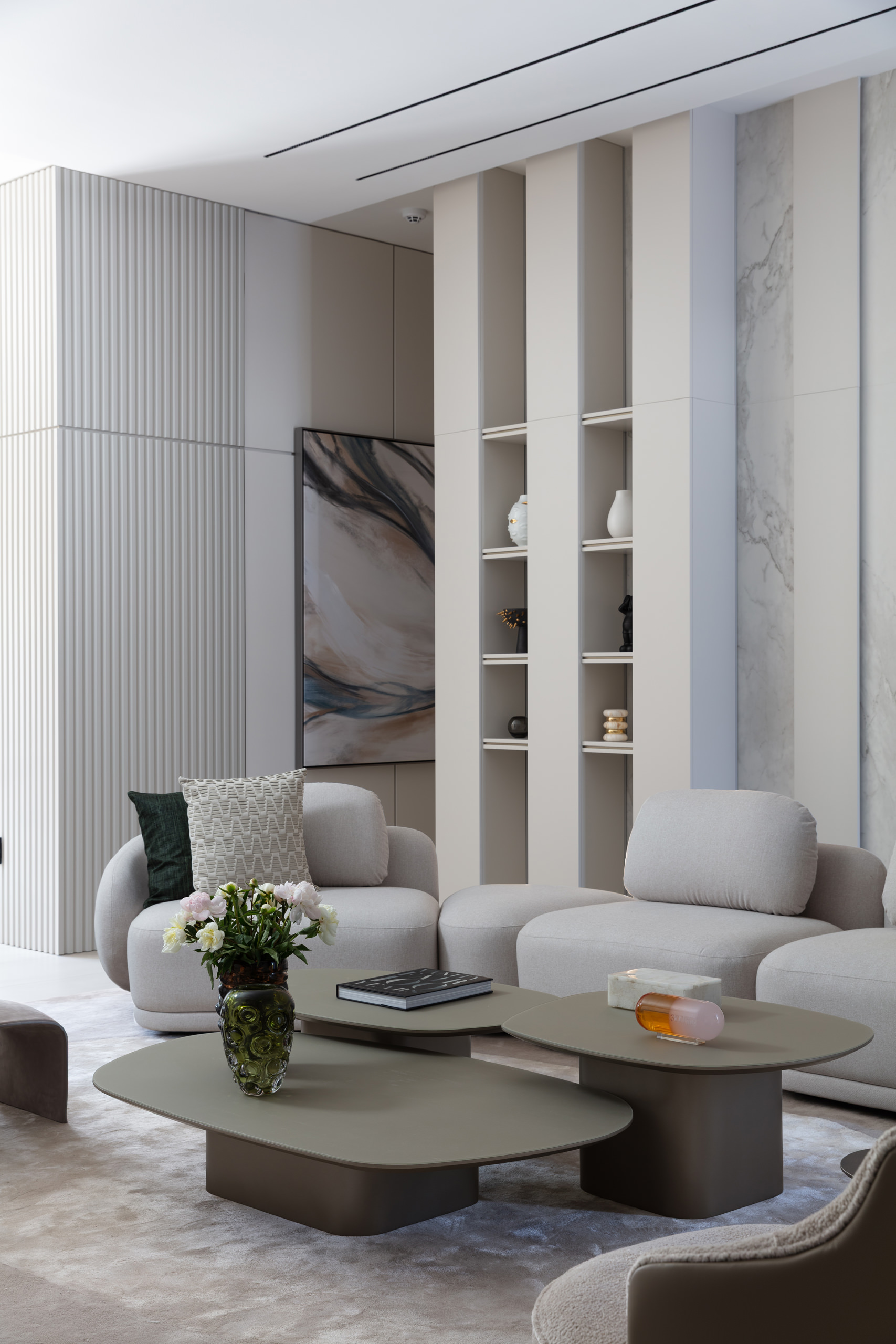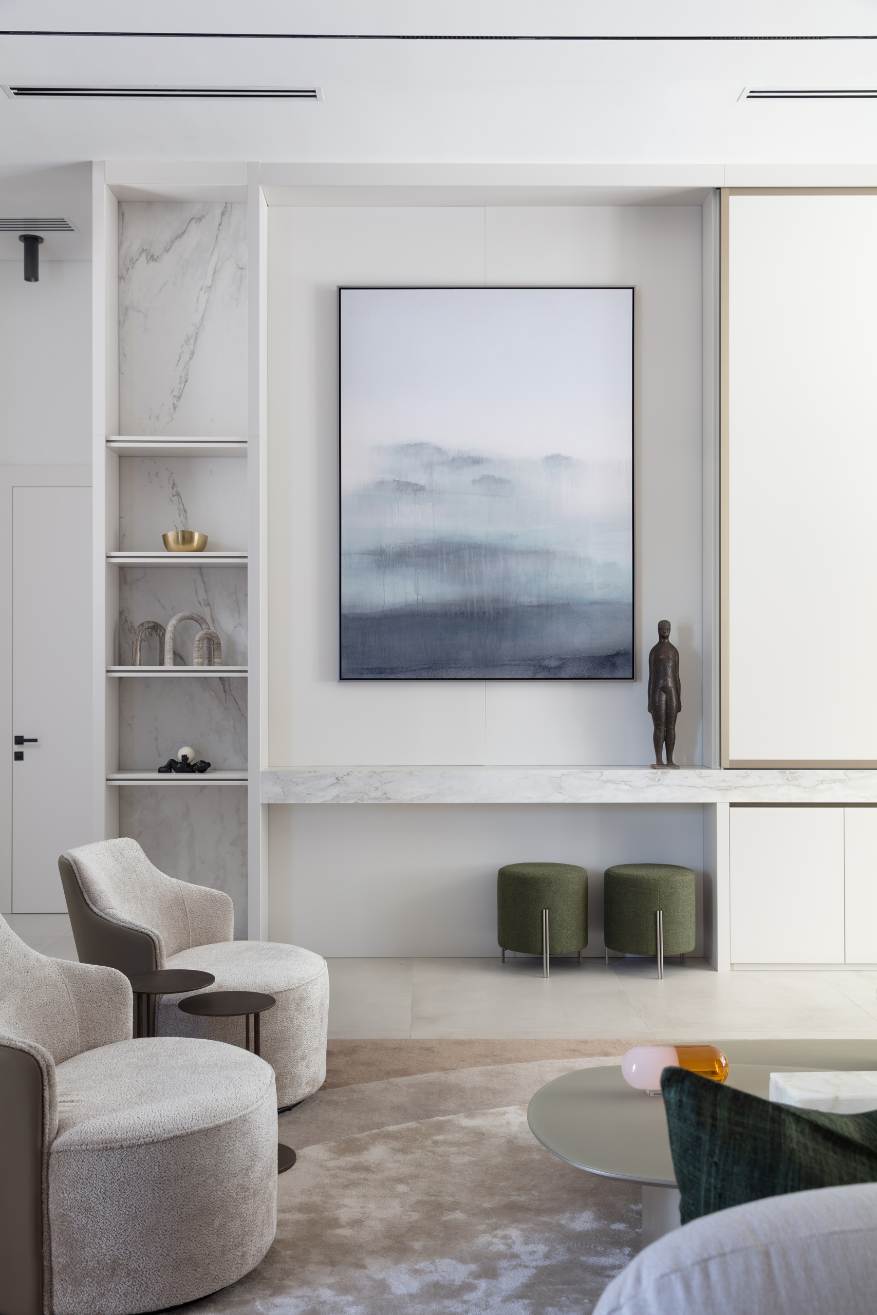 In the main living room, furniture with organic lines introduces movement and softens the architectural geometry. Curved sofas, sculptural coffee tables and natural wood details bring warmth and subtle complexity to the space. The palette—earthy tones, tactile materials, soft lighting—creates a setting that shifts gracefully with the light, supporting both sociability and quiet reflection. Adjacent to the main lounge, a more intimate sitting room opens and closes through sliding doors, offering moments of privacy. Here, art takes centre stage. Two large-format artworks lend rhythm and personality to the space, serving as emotional anchors. Throughout the home, a thoughtful curation of contemporary pieces, pop art and sculpture animates the interiors, adding vibrancy without disrupting the home's serenity.