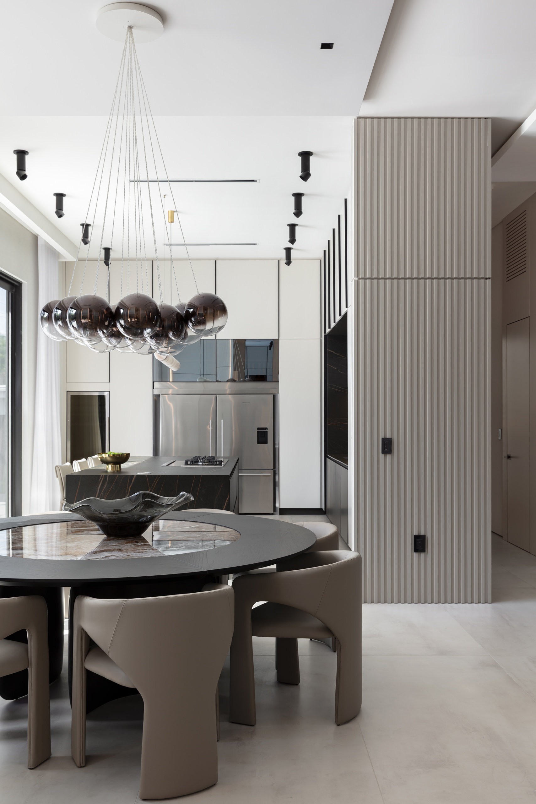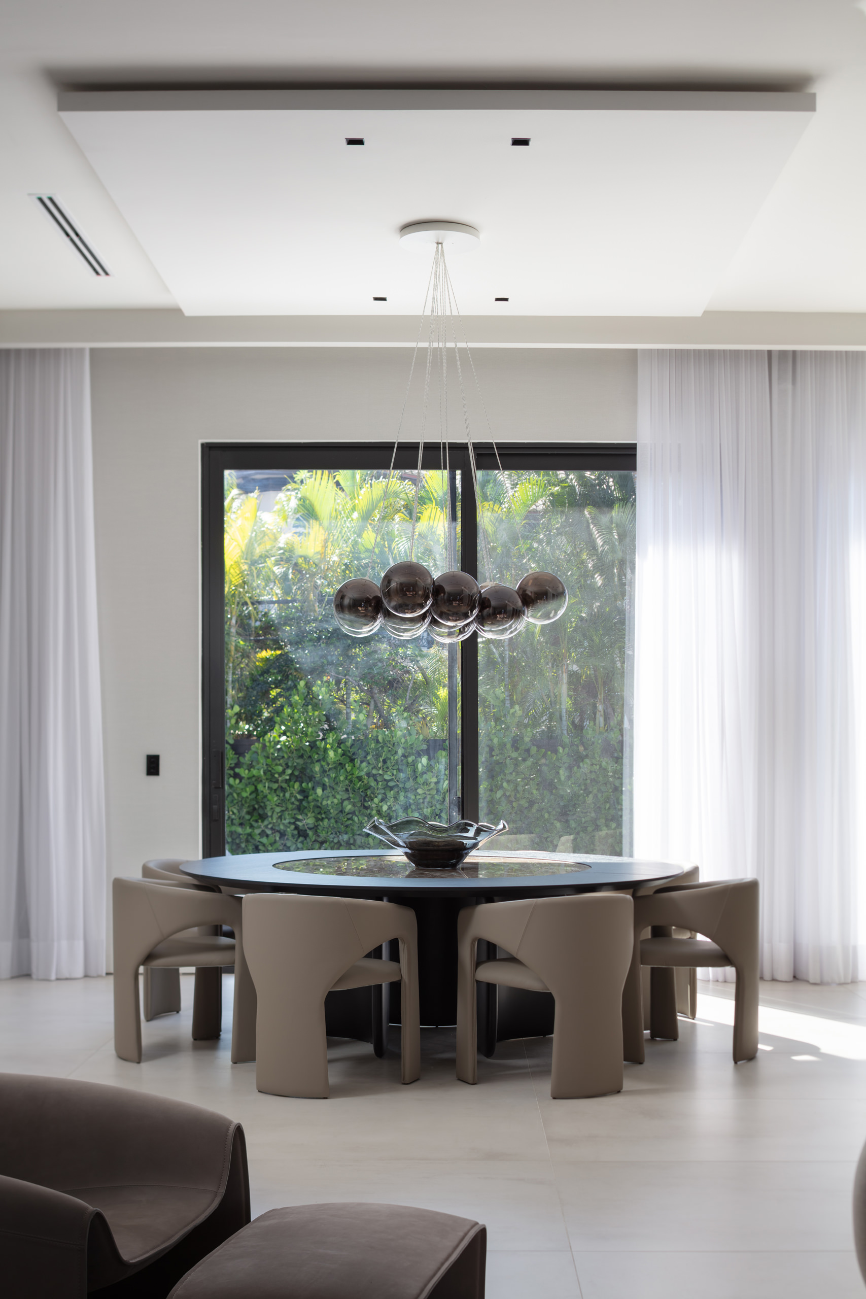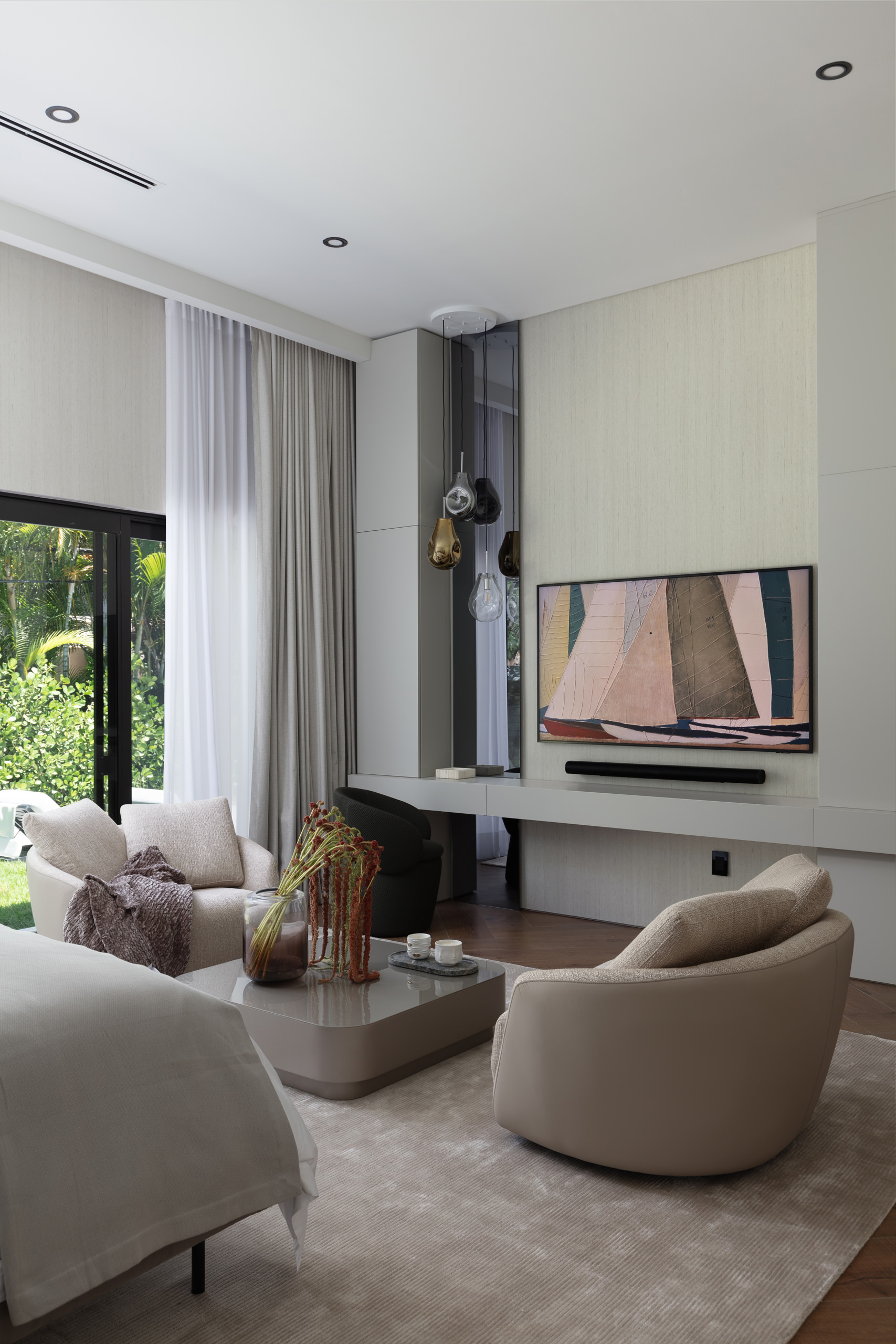 This newly built, single-level family home spans approximately 800 square metres and was envisioned as a place that would support a comfortable, flowing lifestyle in harmony with its surroundings. The layout is anchored by a central axis, connecting social spaces with private zones in a seamless spatial rhythm. The open-plan design enhances both movement and sightlines, with nearly every room offering direct access to the surrounding gardens, blurring the boundaries between interior and exterior. Natural light plays a leading role throughout Seabreeze. Expansive floor-to-ceiling windows integrate the garden visually, allowing a continuous flow of daylight that evolves with the hours. Sheer curtains filter the sunlight, creating a soft, immersive atmosphere. A sophisticated lighting scheme complements the daylight, layering indirect lighting, alabaster pendants and decorative accents to create different moods throughout the day and evening.