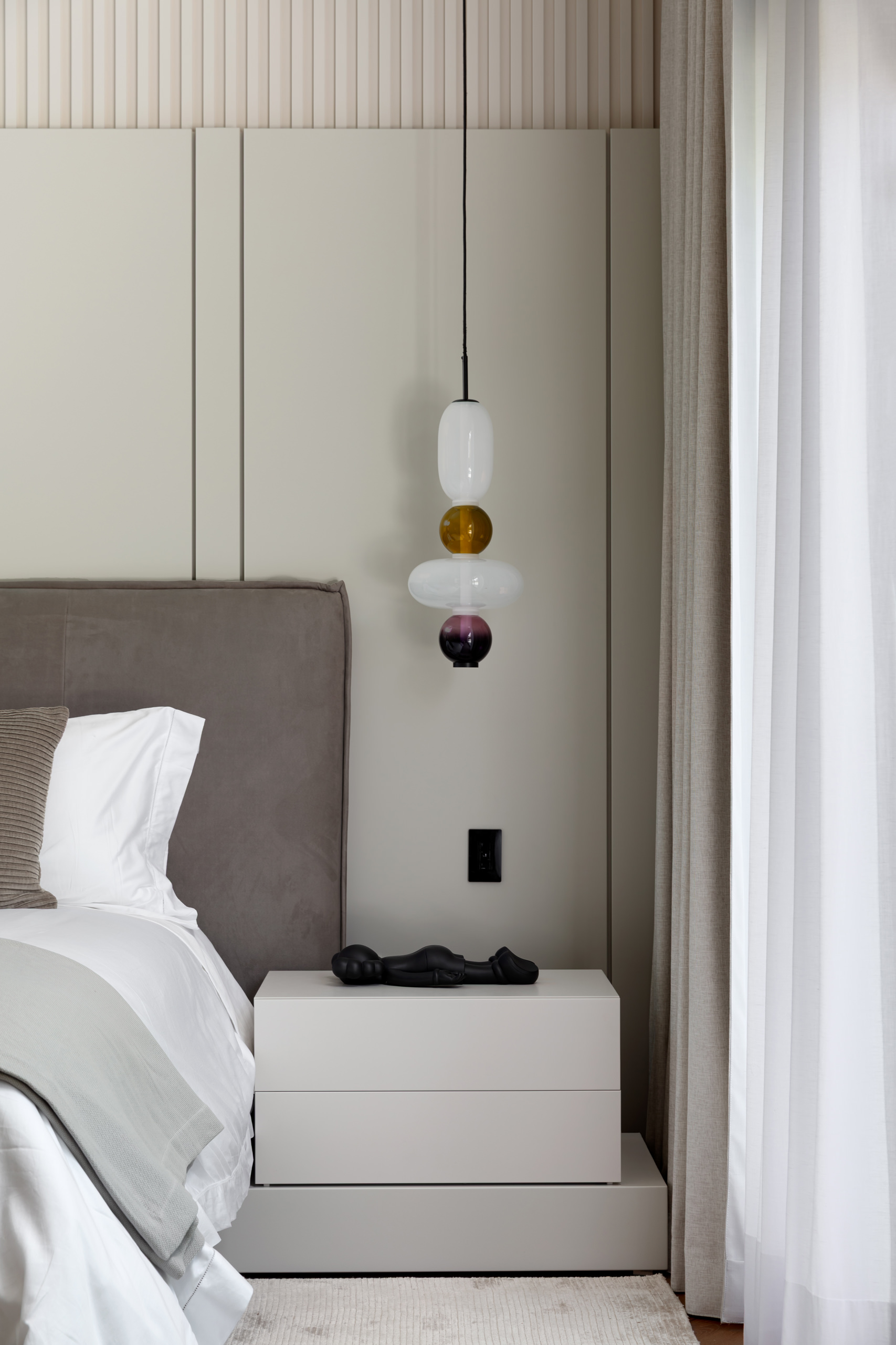 The main bedroom is imagined as an introspective retreat. Gentle textures, natural fabrics and a quiet palette of whites and greys evoke a space designed for rest and restoration. The bed is framed by custom lacquered joinery that integrates floating nightstands, while at the foot, a small seating area invites pause and reflection. A functional vanity completes the suite, paired with crystal pendant lights and a floor-to-ceiling mirror that extends the sense of light and depth. The adjoining ensuite continues this refined language with a solid Calacatta marble washbasin, designed by the studio, complemented by porcelain flooring and premium fixtures from Fantini.